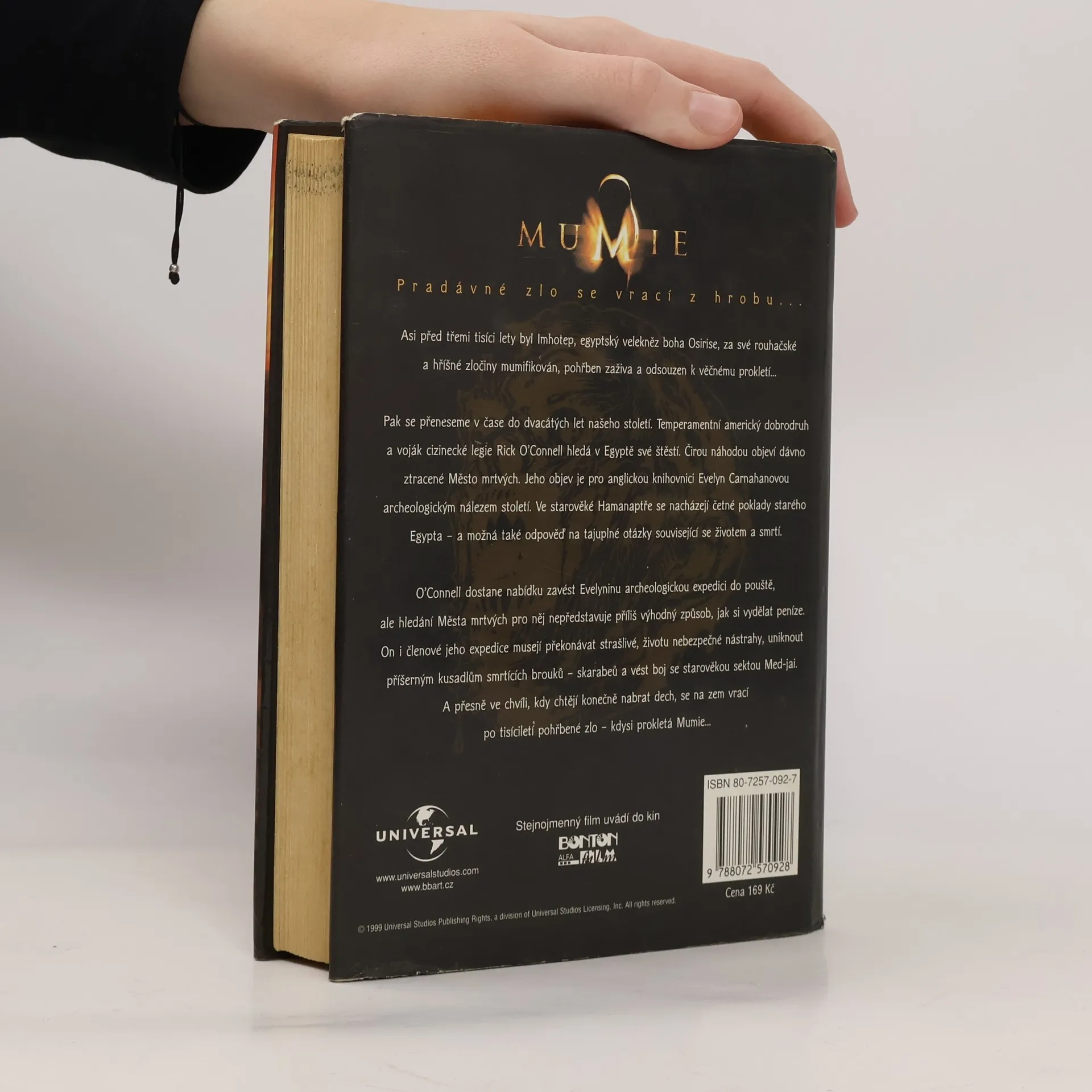 Podle filmového scénáře Stephena Sommerse. Pradávné zlo se vrací z hrobu… Asi před třemi tisíci lety byl Imhotep, egyptský velekněz boha Osirise, za své rouhačské a hříšné zločiny mumifikován, pohřben zaživa a odsouzen k věčnému prokletí… Pak se přeneseme v čase do dvacátých let našeho století. Temperamentní americký dobrodruh a voják cizinecké legie Rick O´Connell hledá v Egyptě své štěstí. Čirou náhodou objeví dávno ztracené Město mrtvých. Jeho objev je pro anglickou knihovnici Evelyn Carnahanovou archeologický nález století. Ve starověké Hamanaptře se nacházejí četné poklady starého Egypta – a možná také odpověď na tajuplné otázky související se životem a smrtí. O´Connell dostane nabídku zavést Evelininu archeologickou expedici do pouště, ale hledání Města mrtvých pro něj nepředstavuje příliš výhodný způsob, jak si vydělat peníze. On i členové jeho expedice musejí překonávat strašlivé, životu nebezpečné nástrahy, uniknout příšerným kusadlům smrtících brouků – skarabeů a vést boj se starověkou sektou med-jai. A přesně ve chvíli, kdy chtějí konečně nabrat dech, se na zem vrací po tisíciletí pohřbené zlo – kdysi prokletá Mumie…