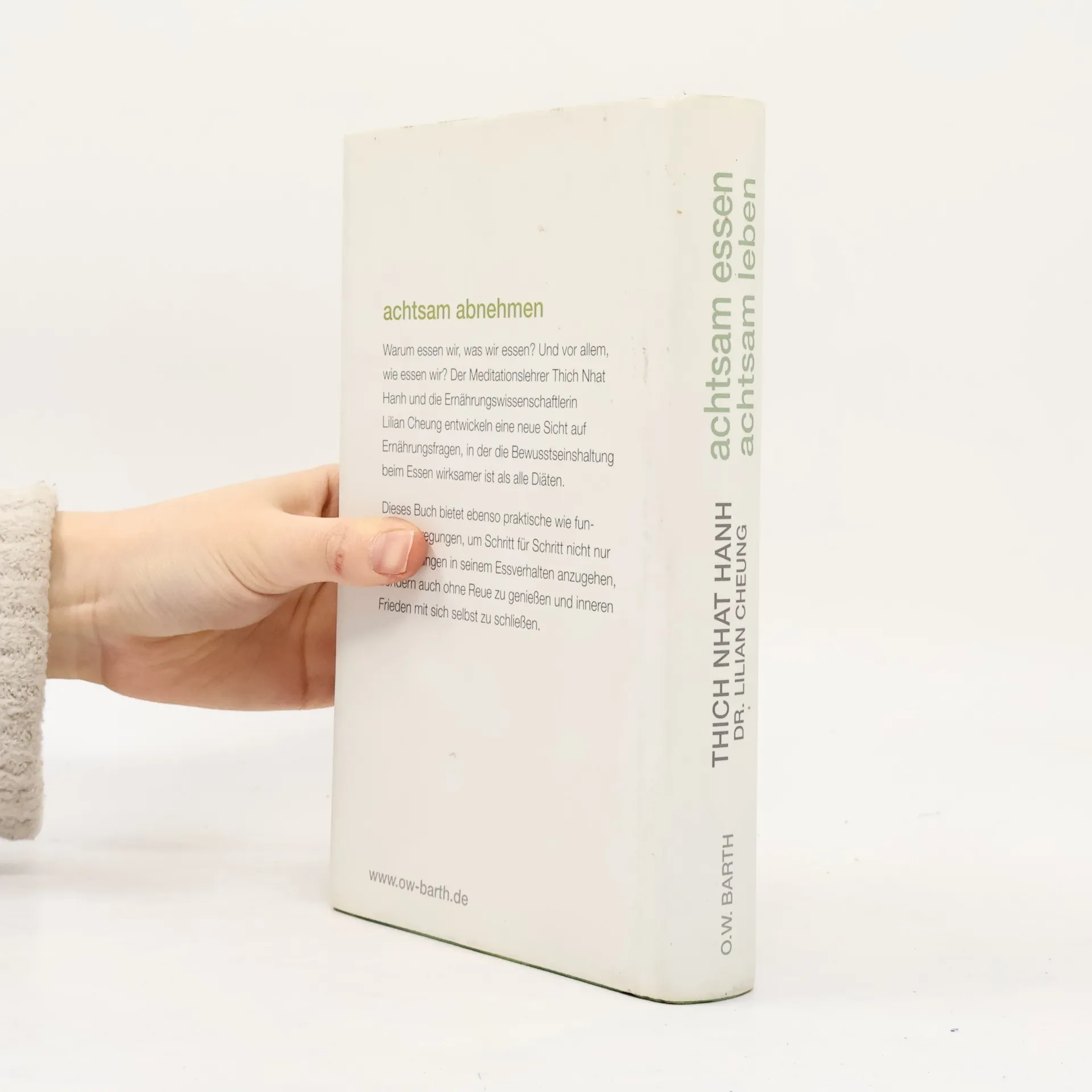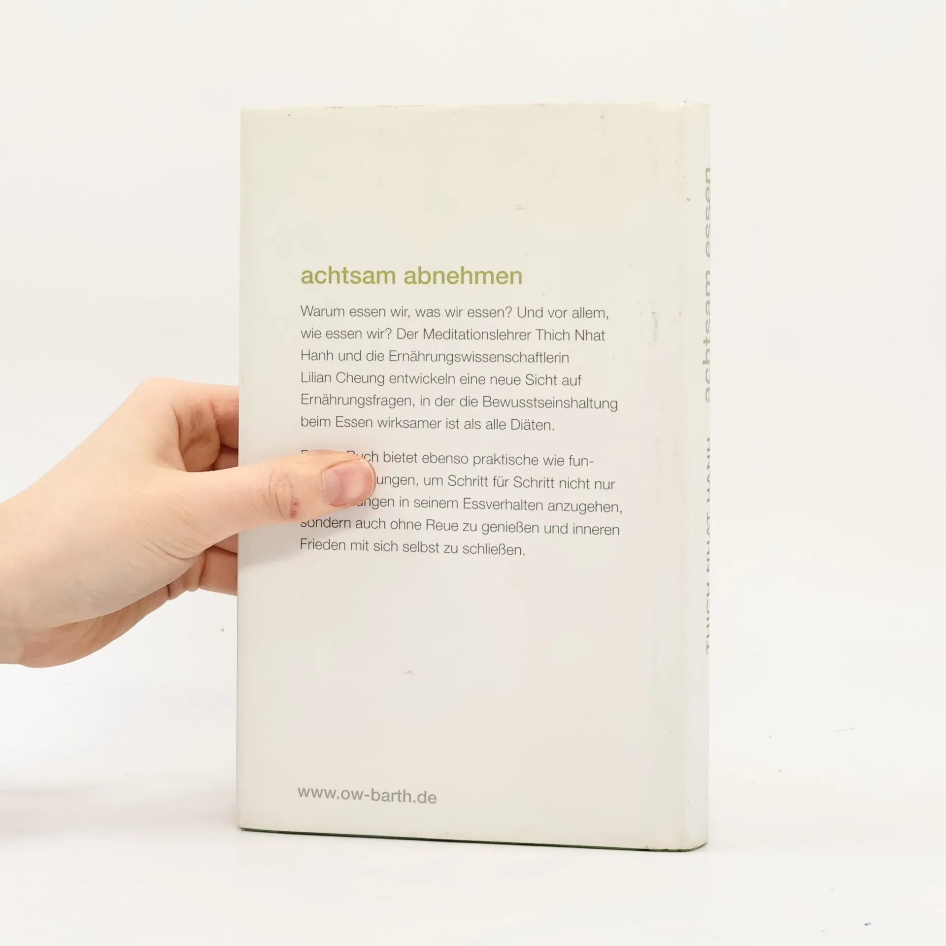 Wie kann man bewusst leben und ein gesundes Gewicht erlangen? Der Meditationslehrer Thich Nhat Hanh und die Ernährungswissenschaftlerin Dr. Lilian Cheung entwickeln eine neue Sicht auf das Thema Ernährung, in der die Bewusstseinshaltung beim Essen wirksamer ist als alle Kuren. Sie kombinieren zeitlose Prinzipien der buddhistischen Lehre mit modernen wissenschaftlichen Erkenntnissen. Mit vielen praktischen Anregungen, wie man aus alten Gewohnheiten aussteigt, auf seine natürlichen Bedürfnisse achtet, achtsamer genießt und damit den Weg heraus aus der üblichen Diätenfalle findet.