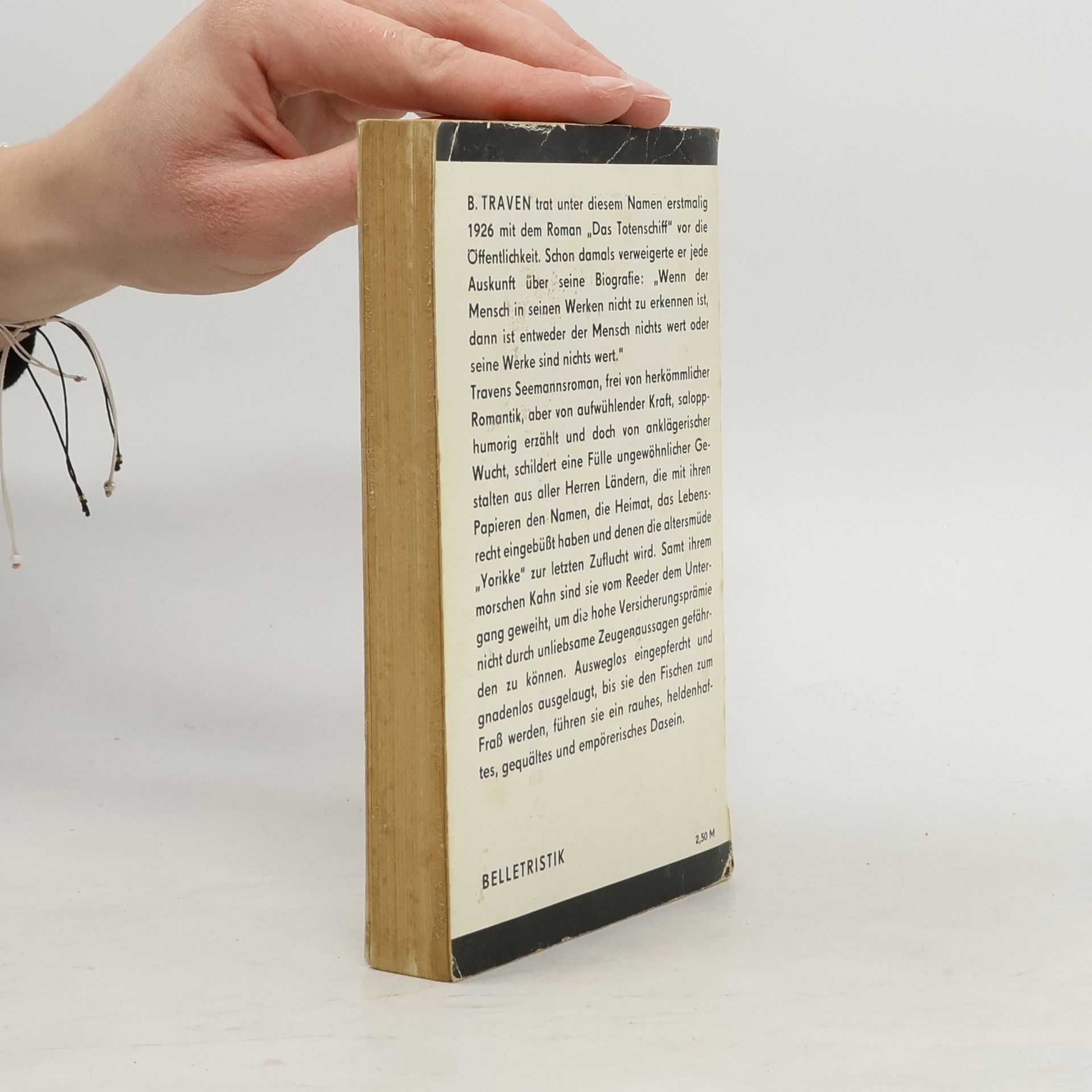 Die Geschichte eines amerikanischen Seemanns erschien erstmals 1926 und berichtet, wie dieser in den Kneipen Antwerpens das Auslaufen seines Schiffes versäumt und sich als Mensch ohne Pass und Papiere, ohne nachweisliche Nationalität, einem ungewissen Schicksal ausgeliefert sieht, wie er als Namenloser von Staat zu Staat gehetzt wird und schließlich auf einem morschen «Totenschiff» mit betrügerisch hochversicherter, aber wertloser Ladung untergeht. Traven geht es dabei nicht um das Schicksal eines Menschen, sondern um die Willkür staatlicher Despotie und Sklaverei. Der Roman wurde mit Horst Buchholz, Mario Adorf und Elke Sommer erfolgreich verfilmt.
