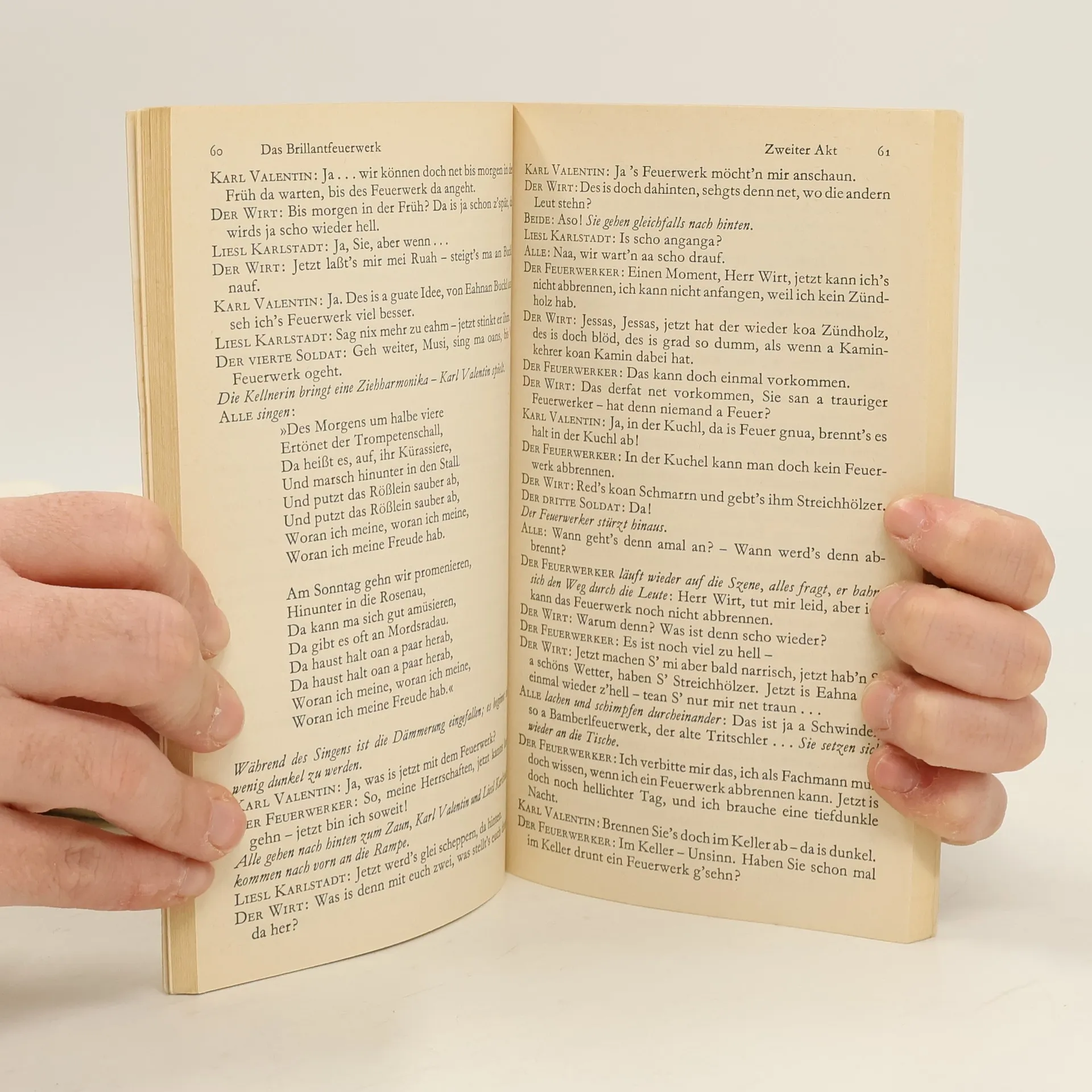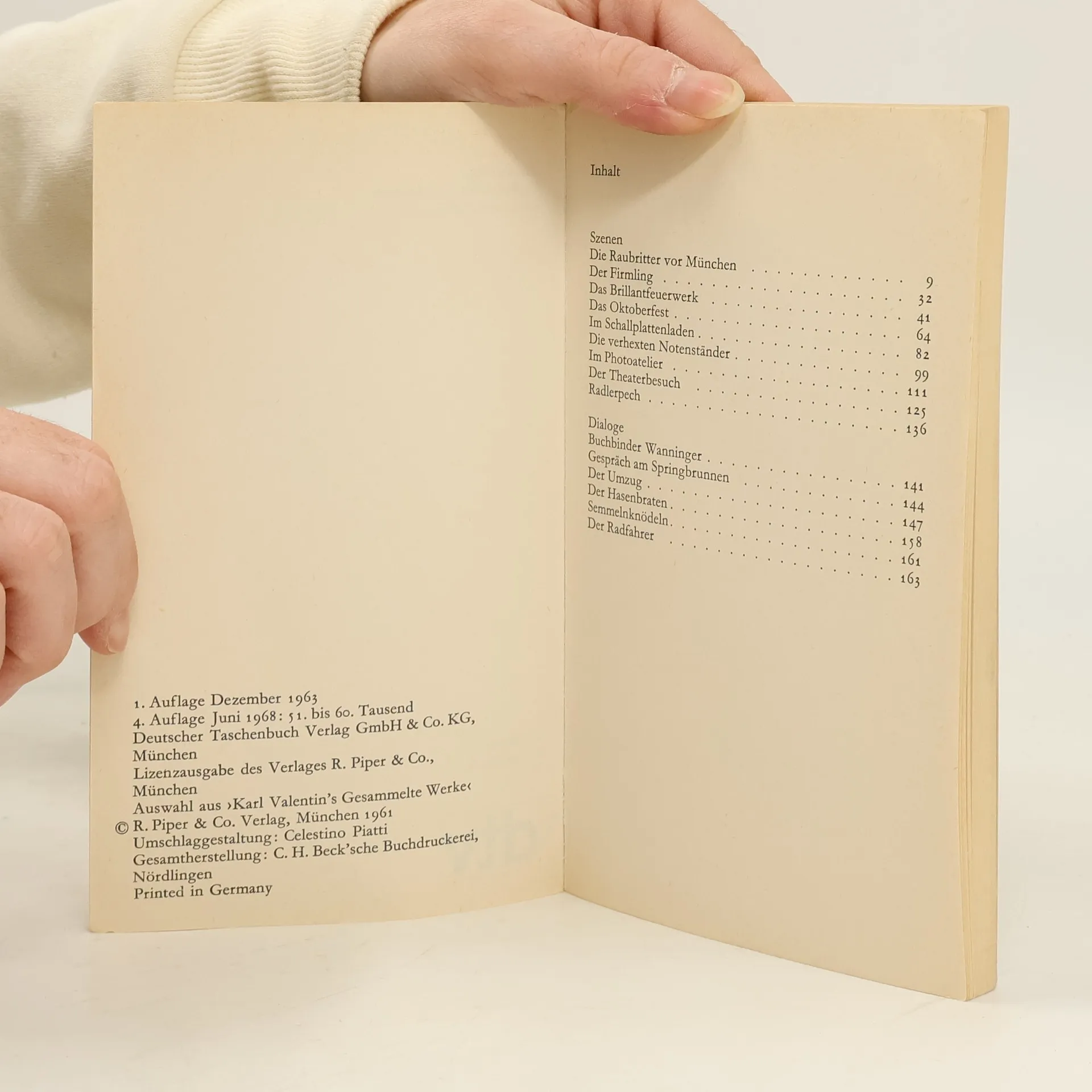 Seit Karl Valentin mit seiner Partnerin Liesl Karlstadt die hier zusammengefaßten Szenen gespielt hat, sind sie auch über Film und Schallplatte berühmt geworden. Valentins Einfluß auf das moderne grotesk-surrealistische Theater ist unbestritten. Seine grüblerische Wortklauberei, die urplötzlich in drastische Komik umschlägt, seine naive Freude, vor dem beklemmenden Abgrund des Unsinns sich in herzhaften Blödsinn zu retten, ist heute noch so originell wie vor dreißigJahren.Kurt Tucholsky, einer der großen Bcwunderer Karl Valentins, nennt die Dramaturgie dieser Szenen einen »Höllentanz der Vernunft um beide Pole des Irrsinns« und er charakterisiert den »Linksdenker« aus München durch ein typisches Zitat: »Vorgestern bin ich mit meiner Großmutter in der Oper ›Lohengrin< gewesen. Gestern nacht hat sie die ganze Oper nochmal geträumt; das wann i gwußt hätt, hätten wir gar nicht erst hingehen brauchen!«Inhalt: Szenen - Die Raubritter vor München- Der Firmling- Das Brillantfeuerwerk- Das Oktoberfest- Im Schallplattenladen- Die verhexten Notenständer- Im Photoatelier- Der Theaterbesuch- Radlerpech Dialoge - Buchbinder Wanninger- Gespräch am Springbrunnen- Der Umzug- Der Hasenbraten- Semmelnknödeln- Der Radfahrer