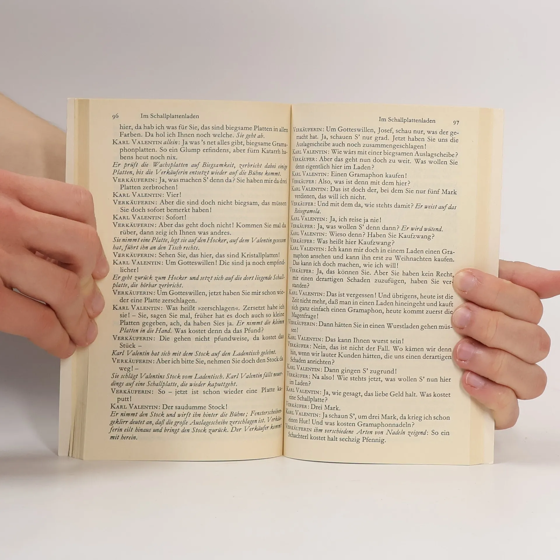 Seit Karl Valentin mit seiner Partnerin Liesl Karlstadt die hier zusammengefaßten Szenen gespielt hat, sind sie auch über Film und Schallplatte berühmt geworden. Valentins Einfluß auf das moderne grotesk-surrealistische Theater ist unbestritten. Seine grüblerische Wortklauberei, die urplötzlich in drastische Komik umschlägt, seine naive Freude, vor dem beklemmenden Abgrund des Unsinns sich in herzhaften Blödsinn zu retten, ist heute noch so originell wie vor dreißigJahren.Kurt Tucholsky, einer der großen Bcwunderer Karl Valentins, nennt die Dramaturgie dieser Szenen einen »Höllentanz der Vernunft um beide Pole des Irrsinns« und er charakterisiert den »Linksdenker« aus München durch ein typisches Zitat: »Vorgestern bin ich mit meiner Großmutter in der Oper ›Lohengrin< gewesen. Gestern nacht hat sie die ganze Oper nochmal geträumt; das wann i gwußt hätt, hätten wir gar nicht erst hingehen brauchen!«Inhalt: Szenen - Die Raubritter vor München- Der Firmling- Das Brillantfeuerwerk- Das Oktoberfest- Im Schallplattenladen- Die verhexten Notenständer- Im Photoatelier- Der Theaterbesuch- Radlerpech Dialoge - Buchbinder Wanninger- Gespräch am Springbrunnen- Der Umzug- Der Hasenbraten- Semmelnknödeln- Der Radfahrer