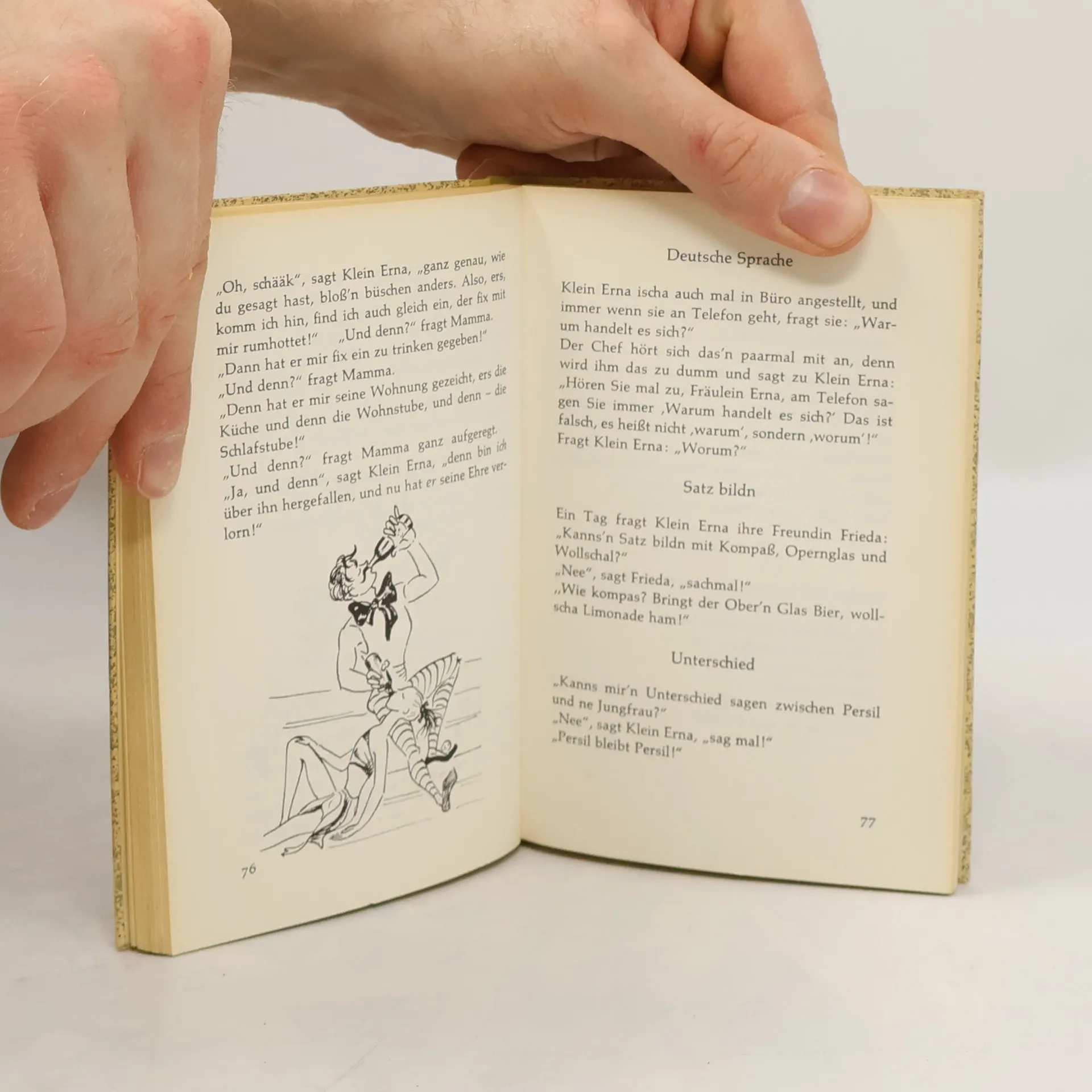 Wer kennt sie nicht, die Hamburger Göre „Klein Erna“? Die Geschichten und Witze um das Mädchen werden seit Jahrzehnten von Generation zu Generation weitergegeben. Die Klein Erna-Bücher haben in den letzten fünfzig Jahren eine millionenfache Verbreitung gefunden, auch über die Grenzen der Hansestadt hinaus, und sind bis heute beliebt. Nun sind die „dummen“ Hamburger Geschichten endlich wieder in einem Band verfügbar. „Missingsch“ – das ist Hamburger Volksmund pur. Lokalkolorit zum Lesen – oder zum Hören, wenn Ihnen ein waschechter Hamburger die Geschichten von Klein Erna vorliest. Vera Möller hat die Geschichten nicht erfunden, sie hat sie gesammelt, nacherzählt und liebevoll illustriert. Viel Vergnügen! „Wie ich dazu kam, die Klein Erna-Geschichten zu sammeln? Eigentlich hatte mein Mann die Schuld, er konnte sie so gut erzählen! Er war Segler auf der Alster, und in diesen Seglerkreisen kursierten die dummen Geschichten von der Hamburger Göre , Klein Erna‘! Woher die kamen, konnte mir damals schon keiner genau sagen! Es hieß, daß in Ärztekreisen einige Geschichten in Missingsch erzählt würden, die komische Situationen und Fragen aus dem Volk aufnahmen! So zum Beispiel die Geschichte bei Hagenbeck: , Klein Erna, geh nich so nah ran an die Eisbärn … bist sowiesoo schon so erkältet!‘“ Vera Möller