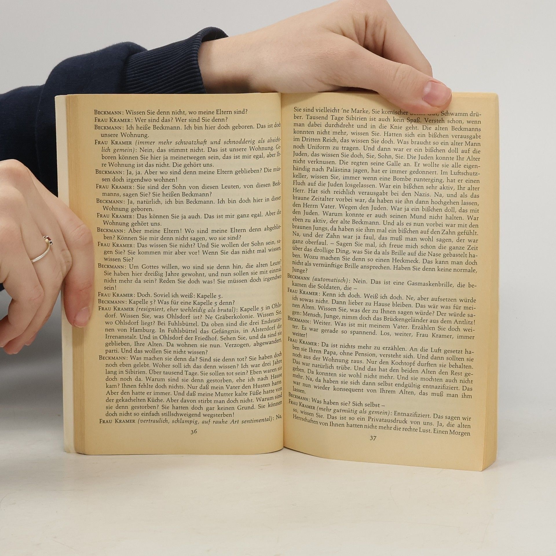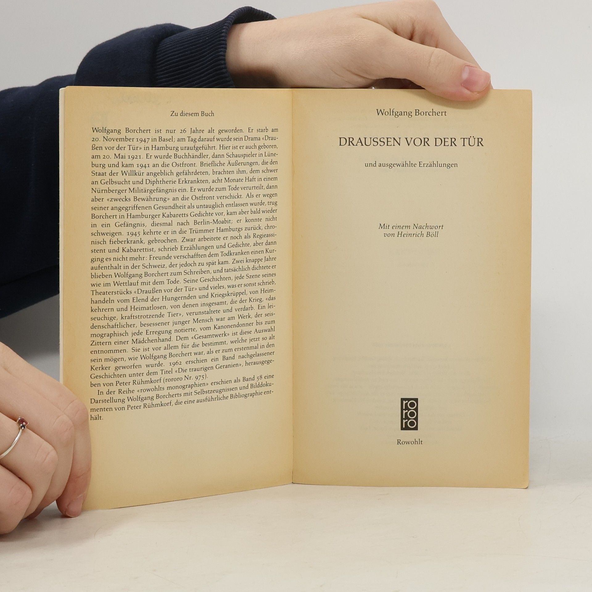Borcherts Drama dreht sich um den Kriegsveteranen Beckmann, der nach seiner Heimkehr aus der sibirischen Kriegsgefangenschaft nicht mehr in die Zivilgesellschaft zurückfinden kann. All seine Versuche, wieder Fuß zu fassen, sind fruchtlos; sein Zuhause gibt es nicht mehr und seine Mitmenschen bleiben ihm fremd, seine Fragen zur Verantwortung und Moral ungehört. Selbst die Elbe weist ihn zurück, als er sich zu ertränken versucht. „Draußen vor der Tür“ ist das zentrale Werk der sogenannten „Trümmerliteratur“ nach 1945 und erfuhr bei seiner Erstausstrahlung als Hörspiel 1947 unmittelbar eine große Resonanz beim Publikum.