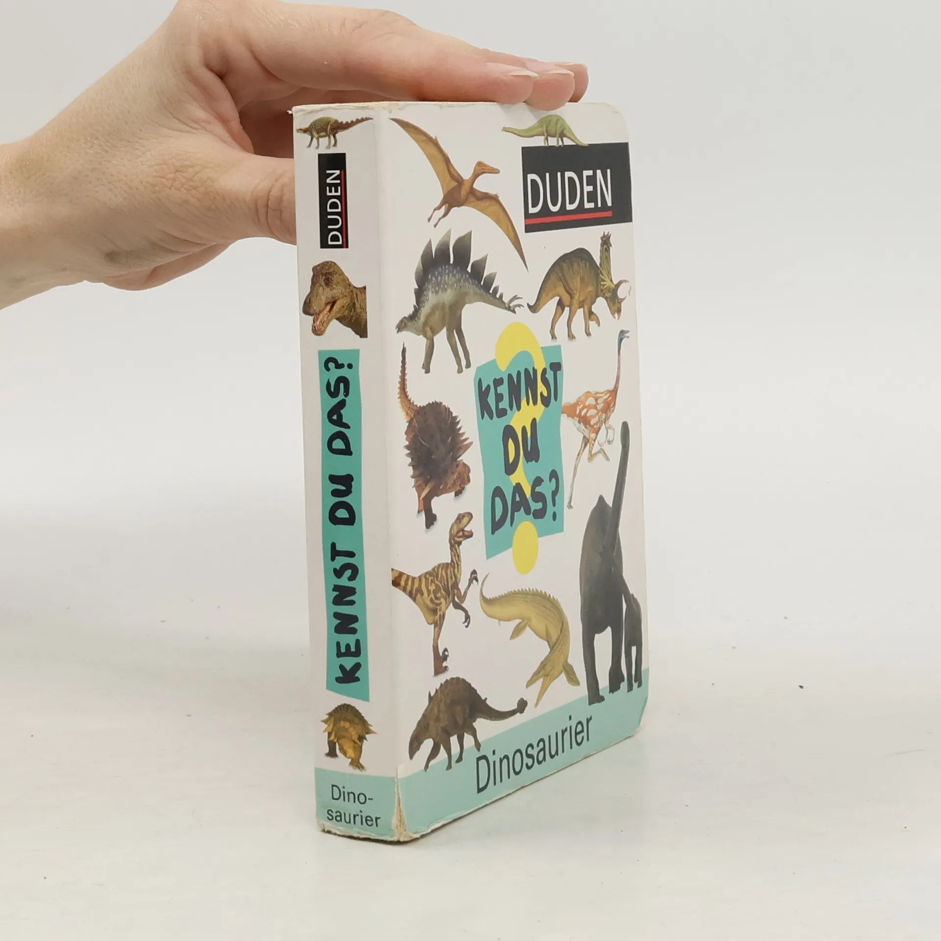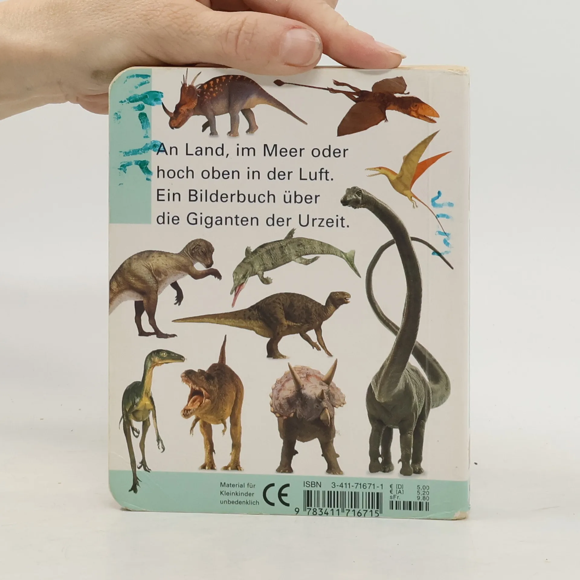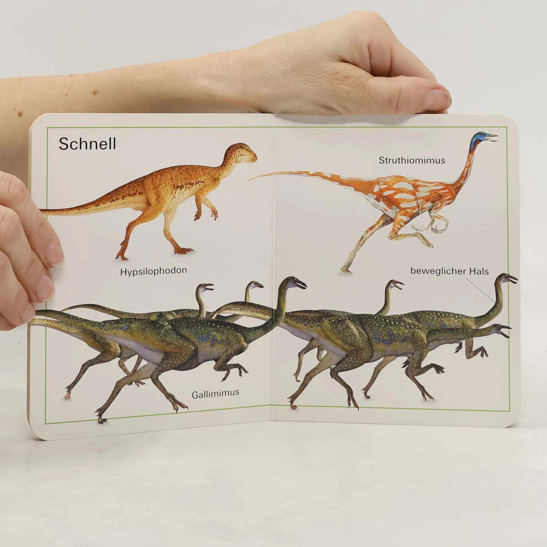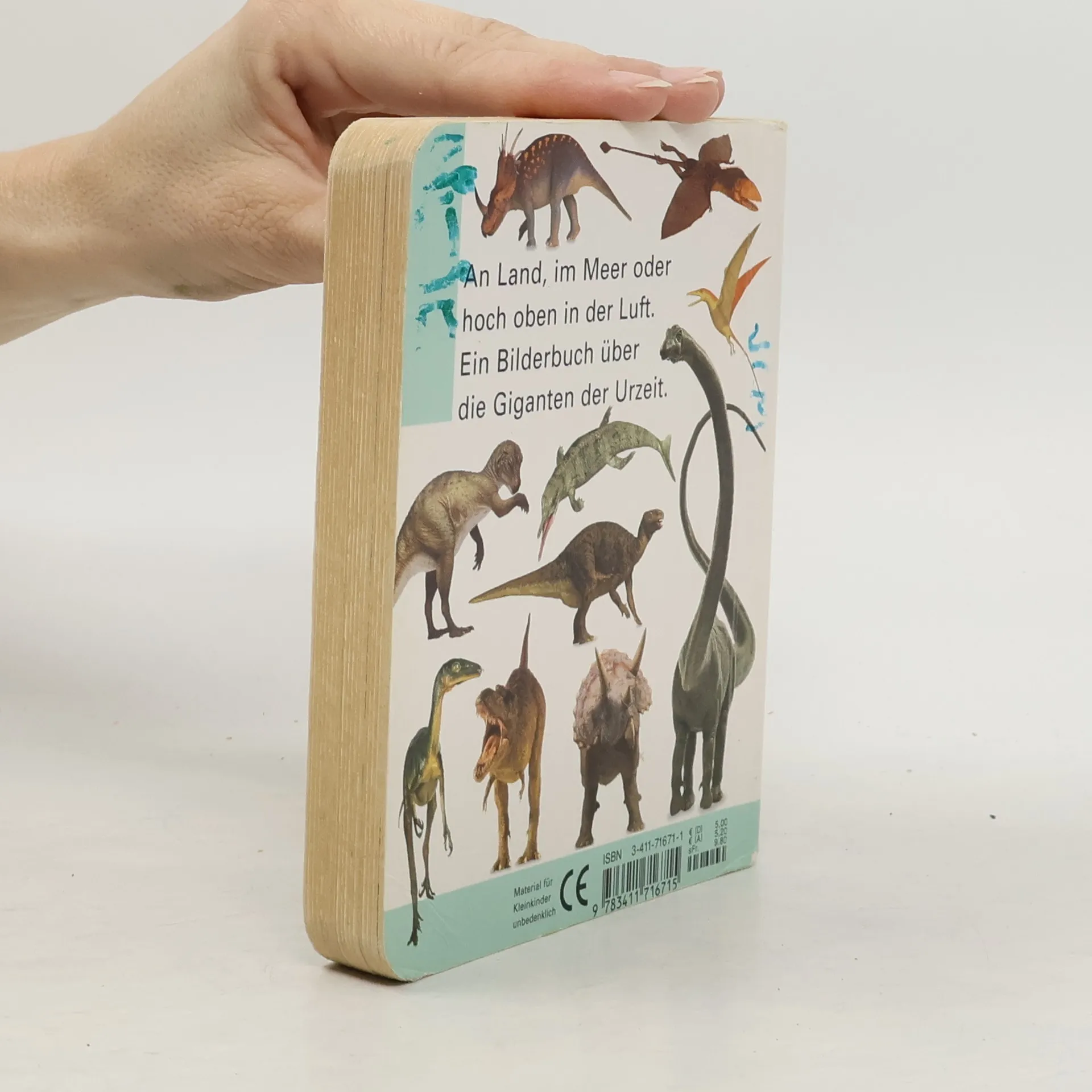Auf zahlreichen Farbfotos werden Dinos gezeigt. So können Kinder ab 1 Jahr ihren Wortschatz erweitern und Dinge wieder erkennen und neu entdecken.