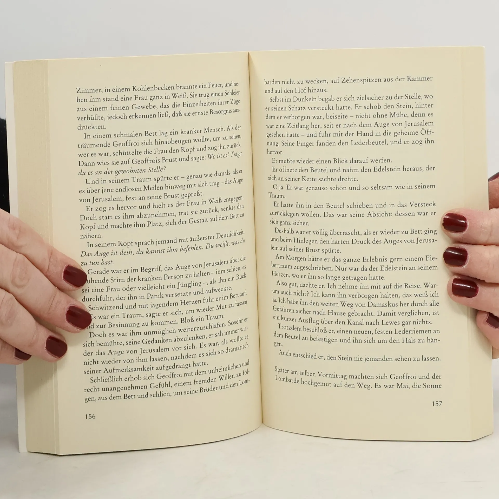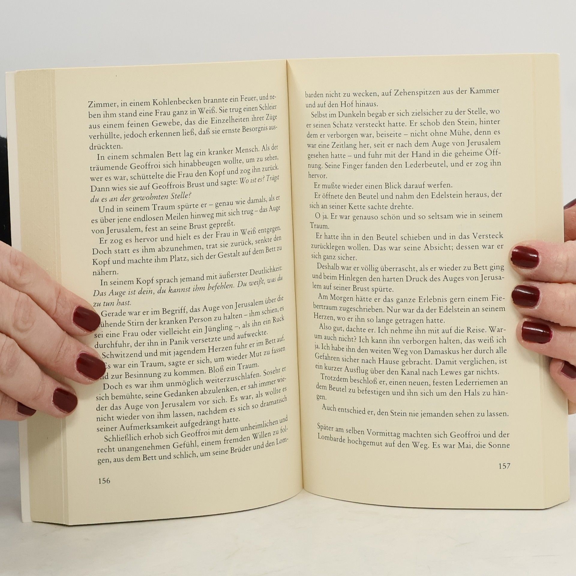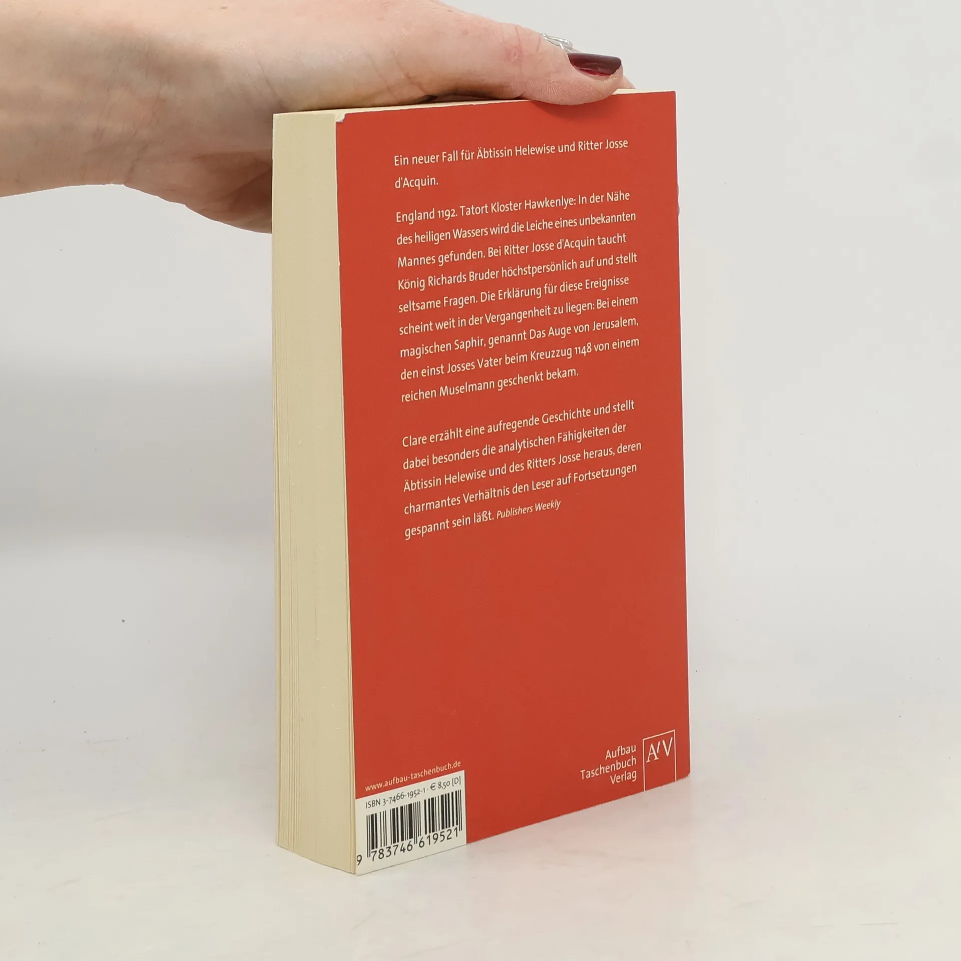 Äbtissin Helewise ermittelt in ihrem fünften Fall England 1192. Tatort Kloster Hawkenlye: In der Nähe des heiligen Wassers wird die Leiche eines unbekannten Mannes gefunden. Bei Ritter Josse d'Acquin taucht König Richards Bruder höchstpersönlich auf und stellt seltsame Fragen. Die Erklärung für diese Ereignisse scheint weit in der Vergangenheit zu liegen: bei einem magischen Saphir, genannt »Das Auge von Jerusalem«, den einst Josses Vater beim Kreuzzug 1148 von einem reichen Muselmann geschenkt bekam. Ein neuer Fall für Äbtissin Helewise und Ritter Josse d'Acquin.