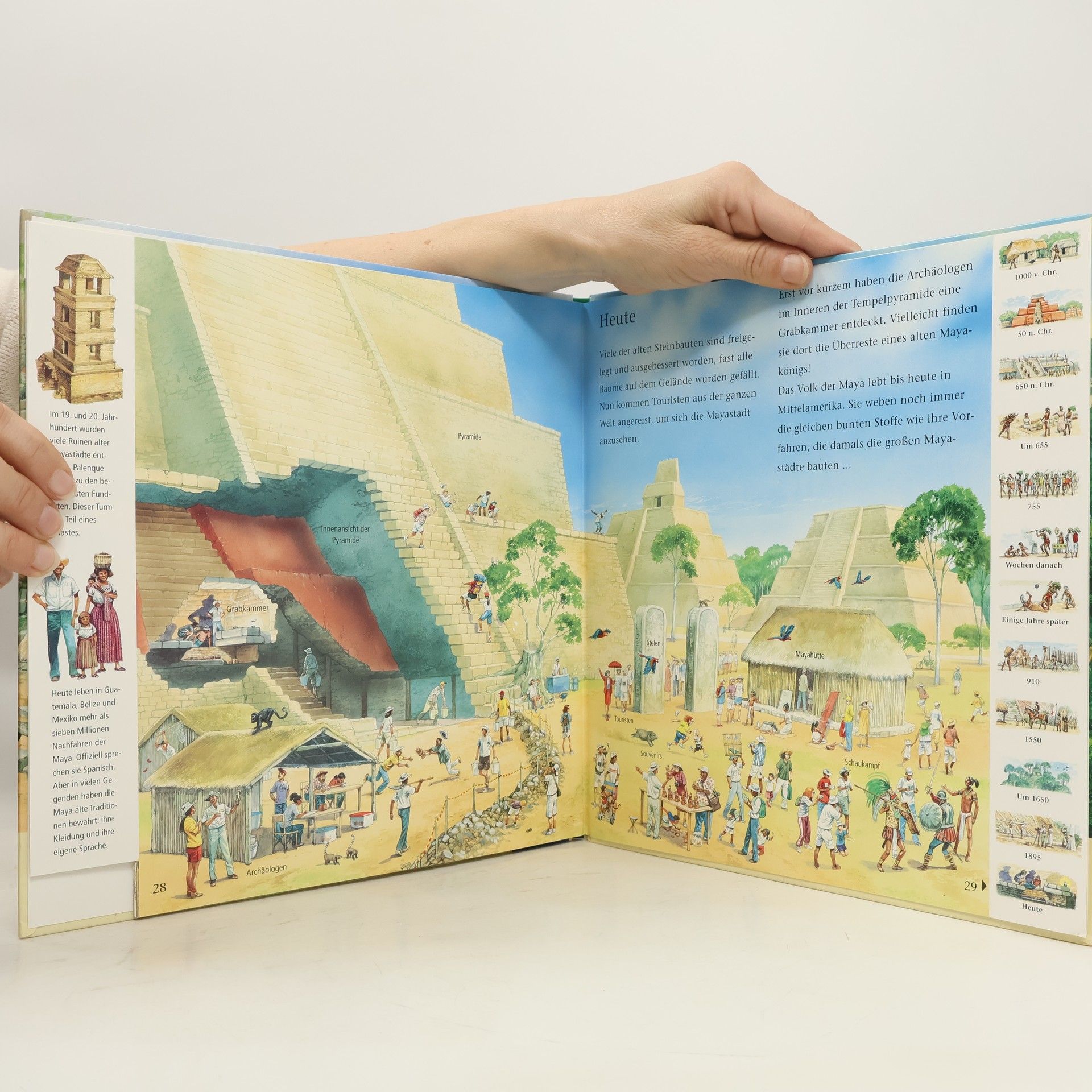 Geheimnisvolle Tempelanlagen mitten im Regenwald? Die Spuren einer vergessenen Kultur. Wer waren die geheimnisvollen Architekten? Und woher nahmen Sie Ihre Kenntnisse? Die Tempel der Maya versetzen mit ihrer außergewöhnlichen Größe und Form noch heute Experten in Staunen. Durchforscht mit uns den undurchdringlichen Dschungel Südamerikas und entdeckt die legendären Städte und Tempel der Maya. Hier wird Geschichte lebendig! Die Reihe „Abenteuer Zeitreise“ entführt uns zu aufregenden Plätzen und packenden Ereignissen in der Vergangenheit. Die spannende Reise beginnt Jahrtausende vor unserer Zeit und endet in der Gegenwart. Großformatige Panoramabilder zeigen die unterschiedlichen Gesichter der Orte im Wandel der Zeit und laden zum Suchen und Entdecken ein. Mit der übersichtlichen Griffleiste am Rand sind gezielte Zeitsprünge ein Kinderspiel.