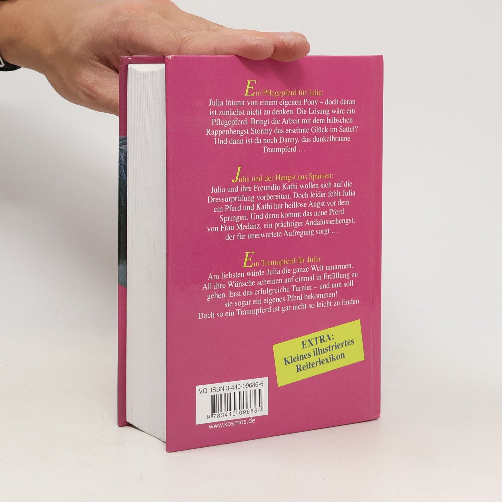 "Ein Pflegepferd für Julia":§Julia träumt von einem eigenen Pony - doch daran ist zunächst nicht zu denken. Die Lösung wäre ein Pflegepferd. Bringt die Arbeit mit dem hübschen Rappenhengst Stormy das ersehnte Glück im Sattel? Und dann ist da noch Danny, das dunkelbraune Traumpferd ...§"Julia und der Hengst aus Spanien":§Julia und ihre Freundin Kathi wollen sich auf die Dressurprüfung vorbereiten. Doch leider fehlt Julia ein Pferd und Kathi hat heillose Angst vor dem Springen. Und dann kommt das neue Pferd von Frau Medanz, ein prächtiger Andalisierhengst, der für unerwartete Aufregung sorgt ...§"Ein Traumpferd für Julia":§Am liebsten würde Julia die ganze Welt umarmen. All ihre Wünsche scheinen auf einmal in Erfüllung zu gehen. Erst das erfolgreiche Turnier - und nun soll sie sogar ein eigenes Pferd bekommen! Doch so ein Traumpferd ist gar nicht so leicht zu finden.