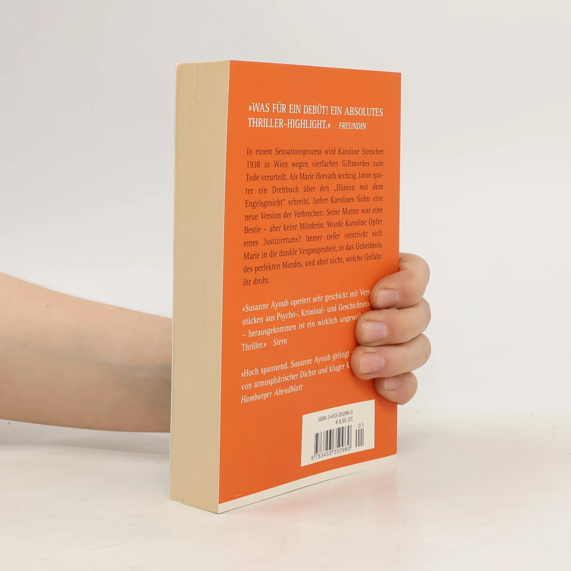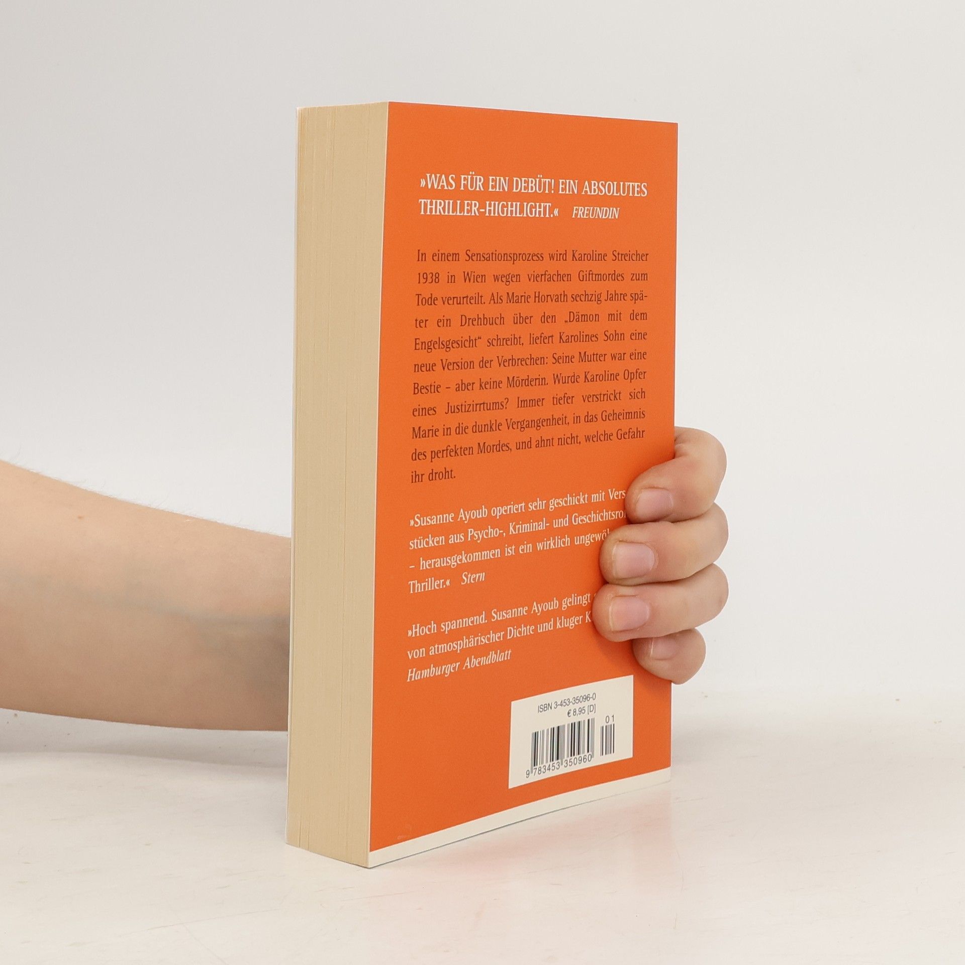 In einem Sensationsprozess wird Karoline Streicher 1938 in Wien wegen vierfachen Giftmordes zum Tode verurteilt. Als Marie Horvath sechzig Jahre später ein Drehbuch über den „Dämon mit dem Engelsgesicht“ schreibt, liefert Karolines Sohn eine neue Version der Verbrechen: Seine Mutter war eine Bestie - aber keine Mörderin. Wurde Karoline Opfer eines Justizirrtums? Immer tiefer verstrickt sich Marie in die dunkle Vergangenheit, in das Geheimnis des perfekten Mordes, und ahnt nicht, welche Gefahr ihr droht. „Was für ein Debüt! Ein absolutes Thriller-Highlight.“ Freundin „Susanne Ayoub operiert sehr geschickt mit Versatzstücken aus Psycho-, Kriminal- und Geschichtsroman - herausgekommen ist ein wirklich ungewöhnlicher Thriller.“ Stern „Spannend und mit viel Atmosphäre. Susanne Ayoub gelingt ein Roman von atmosphärischer Dichte und kluger Konzeption.“ Hamburger Abendblatt