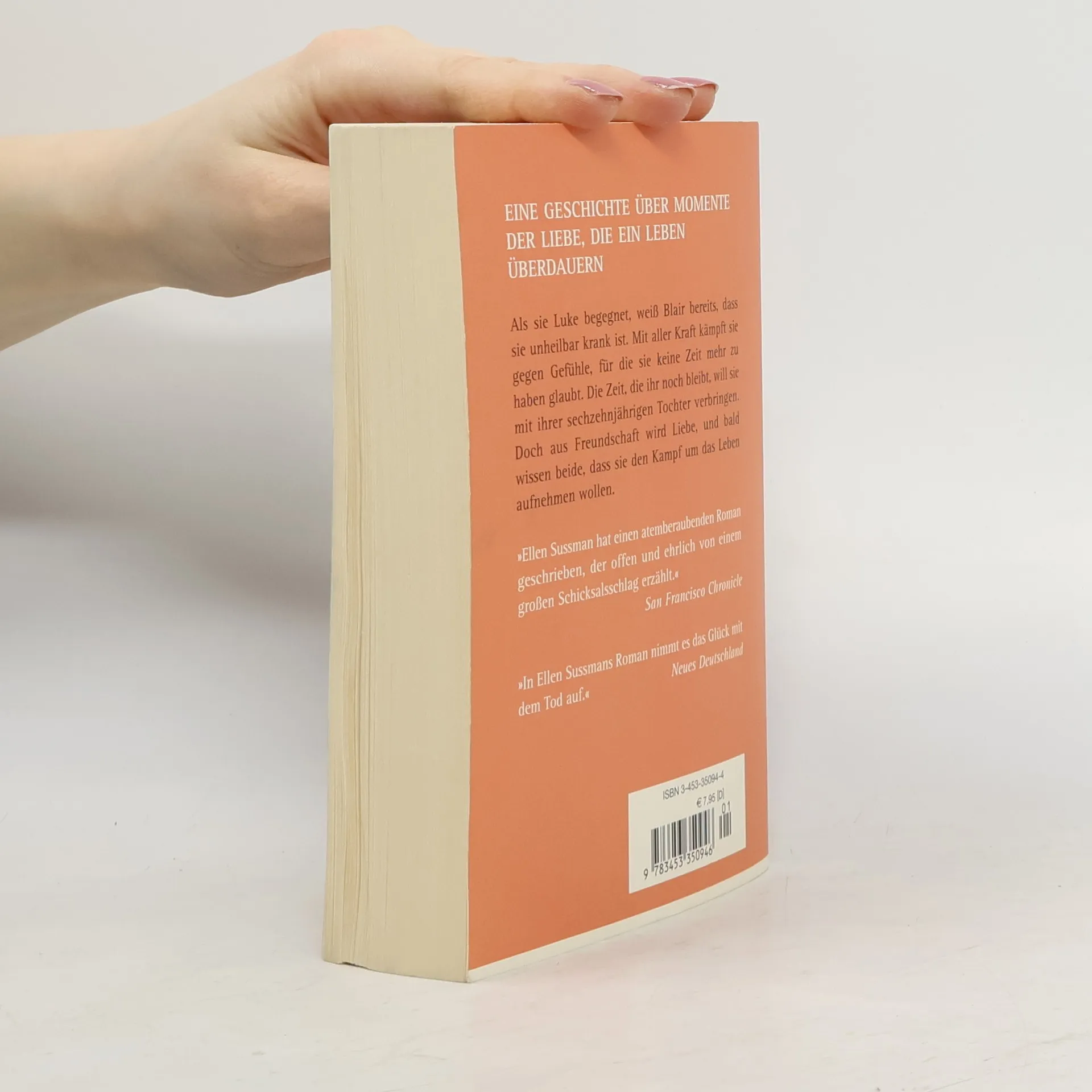 Als sie Luke begegnet, weiß Blair bereits, dass sie unheilbar krank ist. Mit aller Kraft kämpft sie gegen Gefühle, für die sie keine Zeit mehr zu haben glaubt. Doch aus Freundschaft wird Liebe, und bald wissen beide, dass sie den Kampf um das Leben aufnehmen wollen. „Gefühlvoll!“ Lisa „In Ellen Sussmans Roman nimmt es das Glück mit dem Tod auf.“ Neues Deutschland „Seit Anita Shreve hat Sie nichts mehr so bewegt.“ People's Magazine