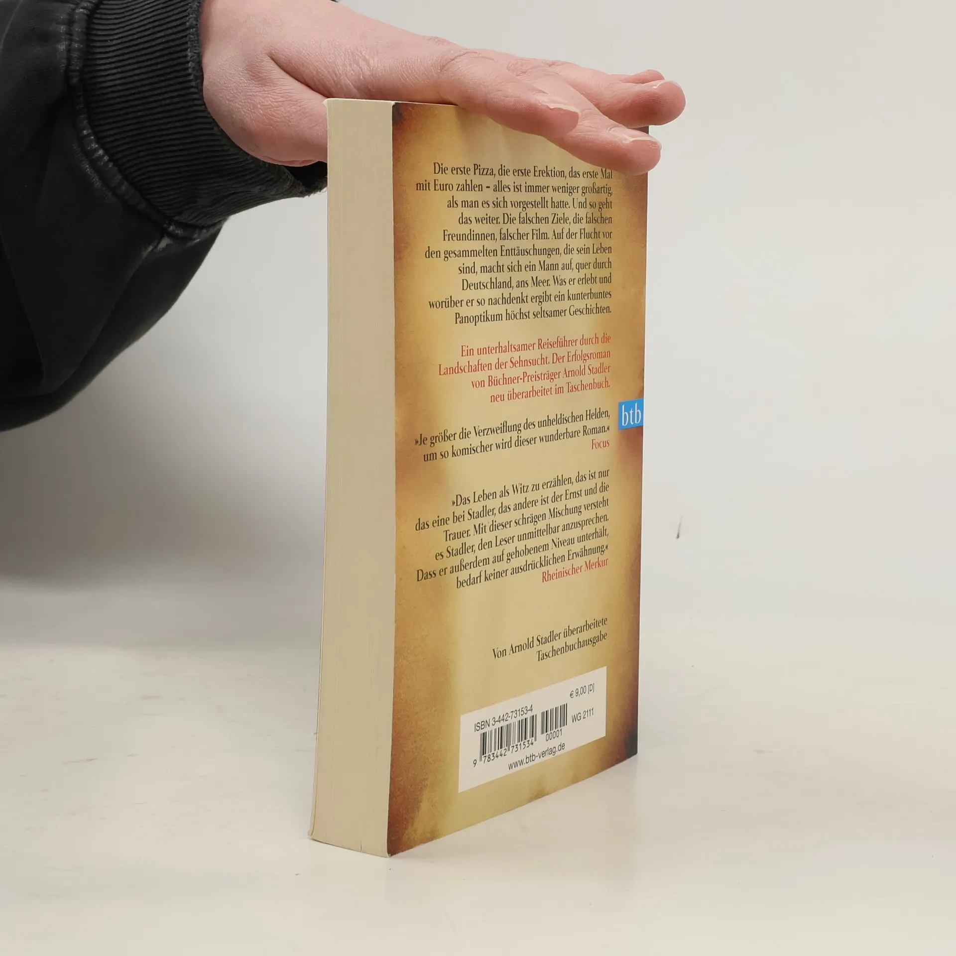 Die erste Pizza, die erste Erektion, das erste Mal mit Euro zahlen - alles ist immer weniger großartig, als man es sich vorgestellt hatte. Vom ersten Mal Sex ganz zu schweigen - der Held in Arnold Stadlers Roman „Sehnsucht“ hat es natürlich mit der Falschen getan. Und so geht das immer weiter. Die falschen Ziele, die falschen Freundinnen, falscher Film. Auf der Flucht vor den gesammelten Enttäuschungen, die sein Leben sind, macht sich ein komischer Kauz auf, quer durch Deutschland, ans Meer. Was er erlebt und worüber er so nachdenkt ergibt ein kunterbuntes Panoptikum höchst seltsamer Geschichten. Arnold Stadler ist einer der wichtigsten deutschsprachigen Autoren der Gegenwart.