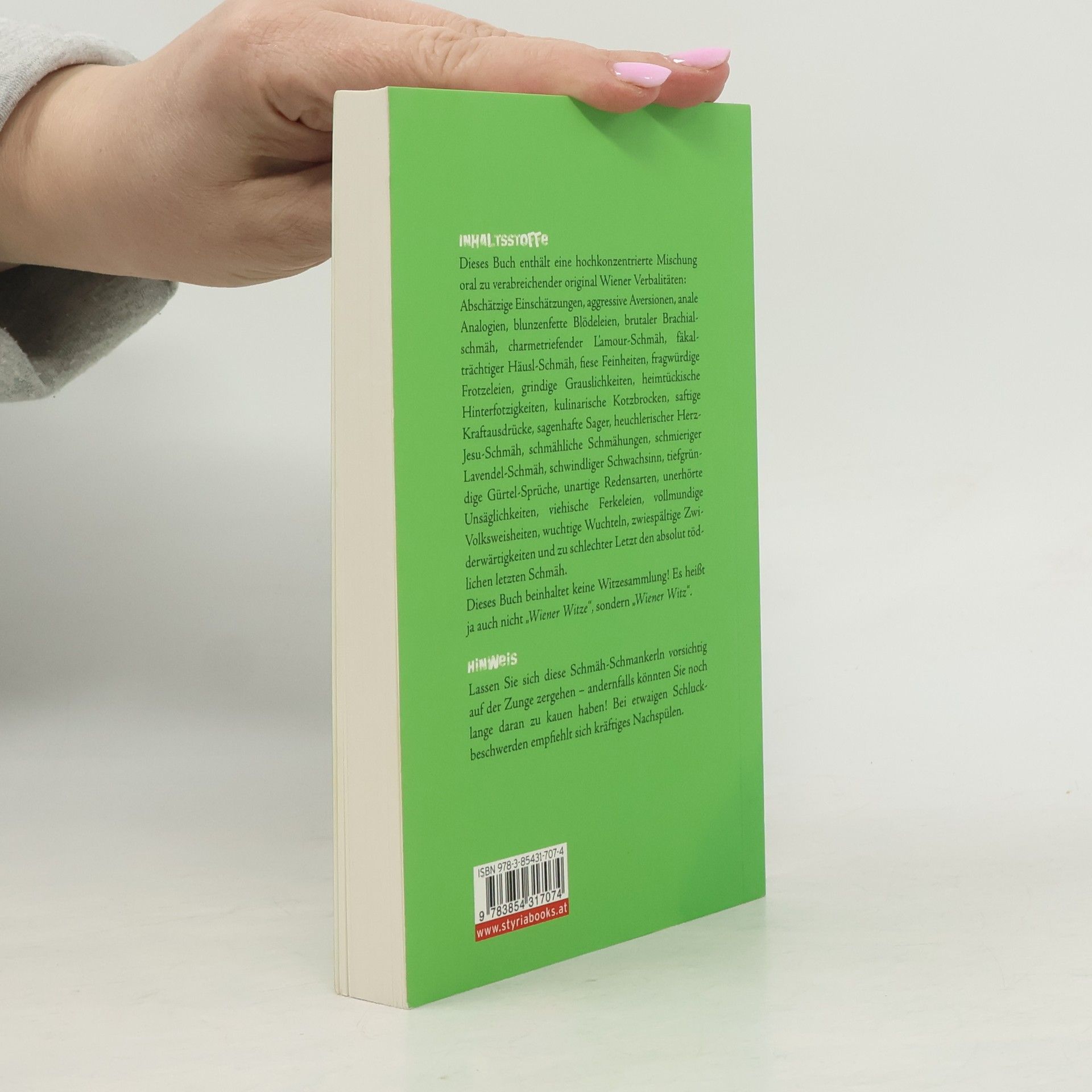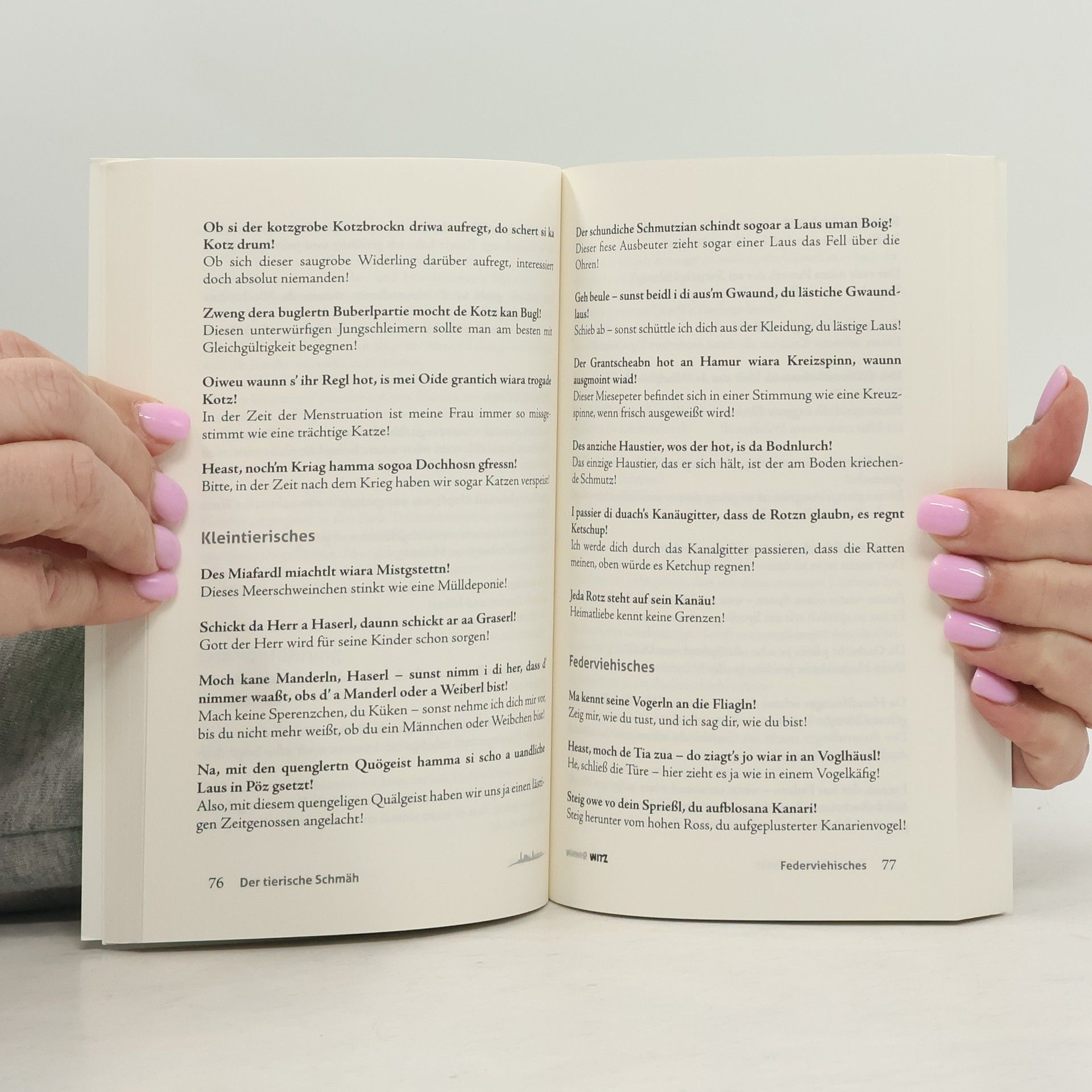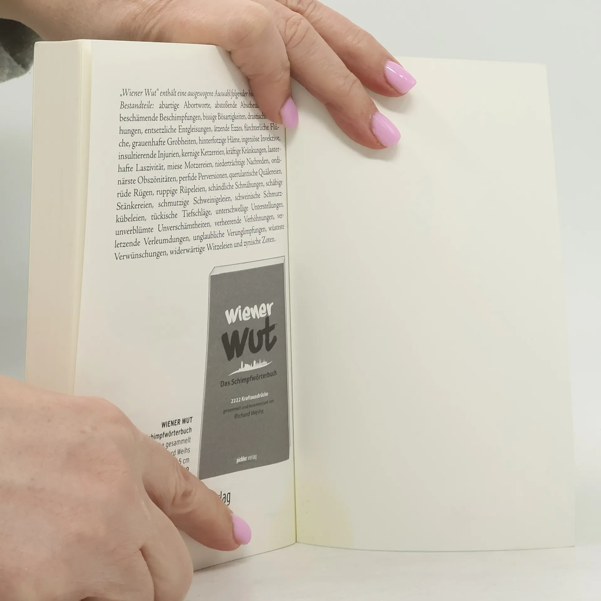 Wiener Schmäh und Wiener Wut – nie wird der Charakter des Wienerischen unverstellter und origineller deutlich! Die „Wiener Wuchteln“ haben weit mehr zu bieten als heurigenkompatible Gemütlichkeit und beeindrucken durch liebenswert-komödiantische Kraft und hinterfotzige Verschlagenheit. Und wenn Wut die Schleusen des Wiener Mund werkes öffnet, dann sind die Dämme anerzogener Zurückhaltung und oberächlicher Höflichkeit rasch weggespült. Richard Weihs versammelt Schimpfwörter und Schmähs – ein Panoptikum voll pointiertem Einfallsreichtum und lautmalerischer Prägnanz.