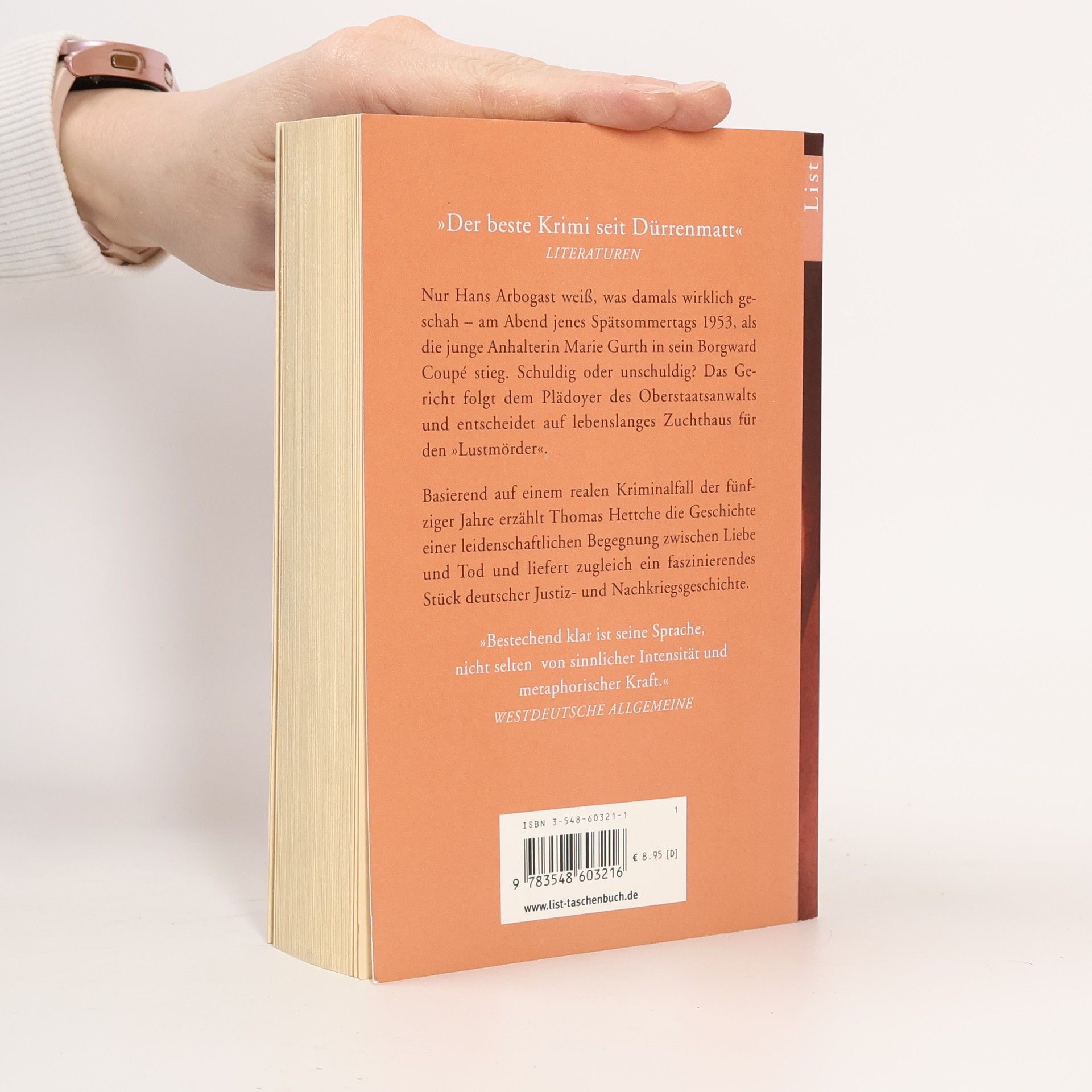 Nur Hans Arbogast weiß, was damals wirklich geschah am Abend jenes Spätsommertages, als die junge Anhalterin Marie Gurth in seinen Borgward Coupé stieg. Schuldig oder unschuldig? Freispruch oder lebenslanges Zuchthaus für den »Lustmörder«? Thomas Hettche beschreibt ein Stück deutscher Nachkriegsgeschichte.