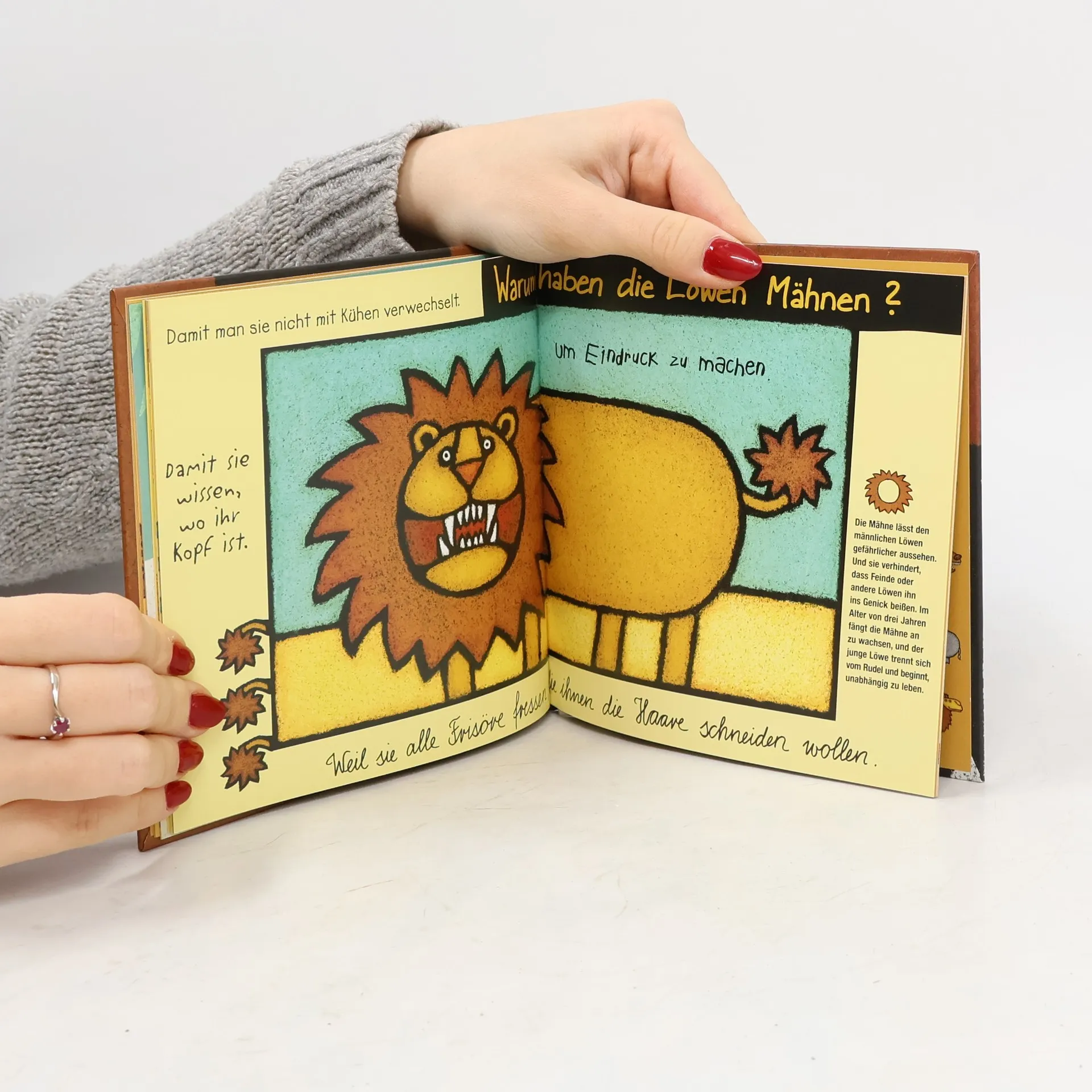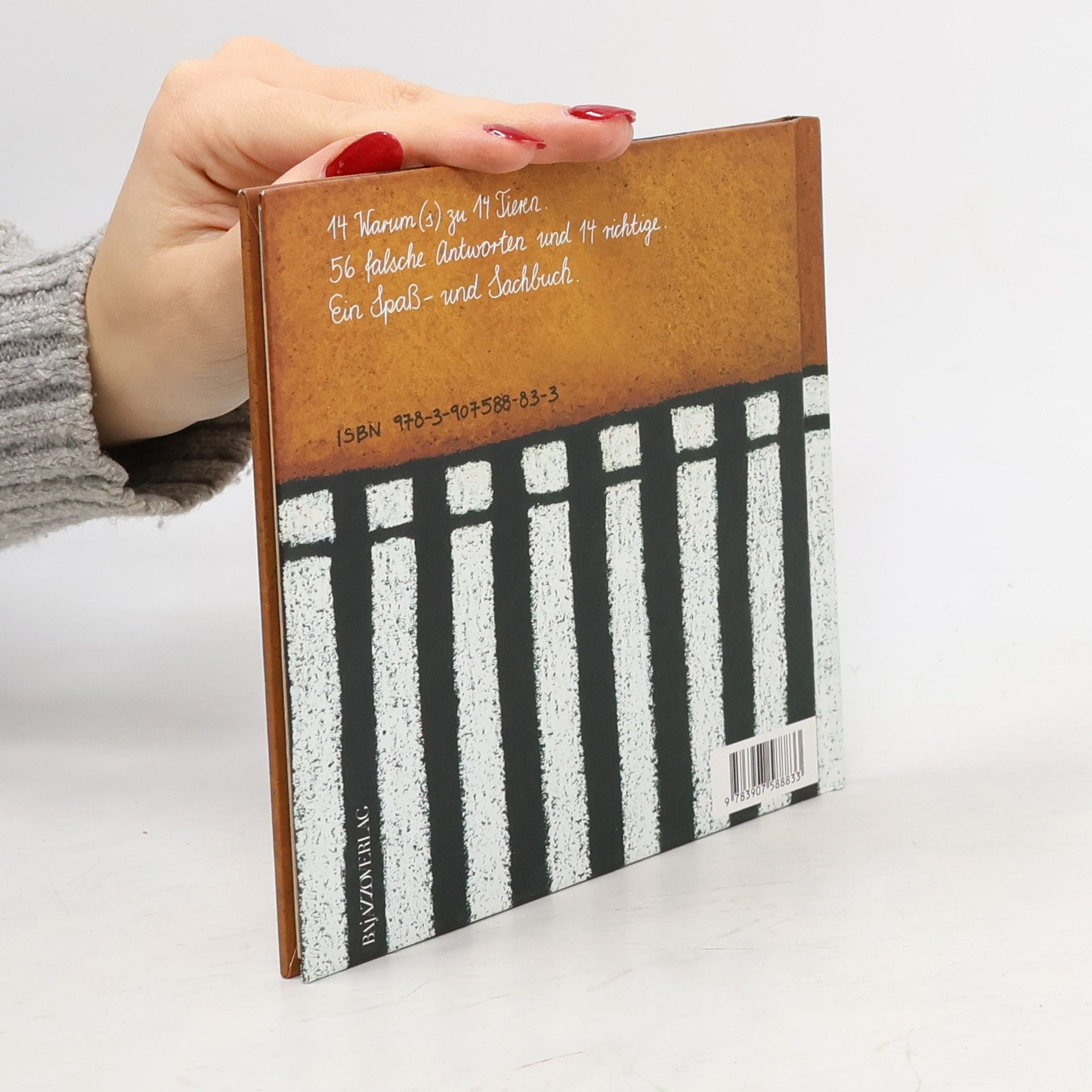 Miniausgabe des Originalsachbilderbuches, das 2002 erstmals erschien. Die liebste und häufigste Frage von Kindern richtet sich in diesem Buch an vierzehn Tiere: Warum lachen die Hyänen? Warum haben die Zebras Streifen? Warum weinen die Krokodile? Ganz klar: Die Hyänen lachen, weil sie eine Schraube locker haben; die Zebras sind gestreift, weil sie aus dem Knast abgehauen sind; die Krokodile weinen, weil niemand mit ihnen spielen will, die Löwen haben Mähnen, weil. Zu jeder Frage gibt es witzige und fantasievolle Antworten. Leicht verständliche zoologische Erklärungen befriedigen aber auch den Wissensdurst der Kinder.