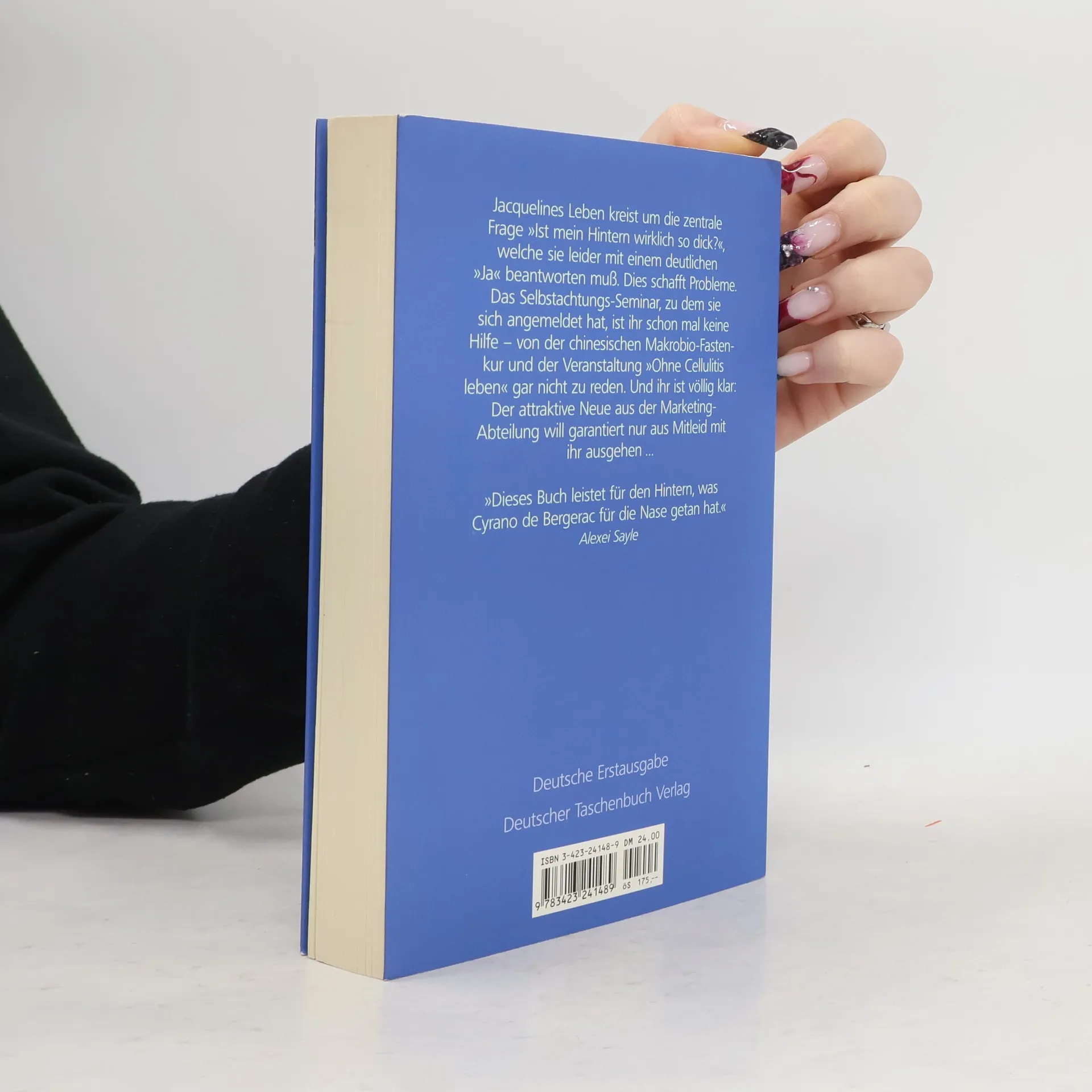 »Zum Schreien komisch!« Laura Jacquelines Leben kreist um die zentrale Frage »Ist mein Hintern wirklich so dick?«, welche sie leider mit einem deutlichen »Ja« beantworten muß. Dies schafft Probleme. Das Selbstachtungs-Seminar, zu dem sie sich angemeldet hat, ist ihr schon mal keine Hilfe – von der chinesischen Makrobio-Fastenkur und der Veranstaltung »Ohne Cellulitis leben« gar nicht zu reden. Und ihr ist völlig klar: Der attraktive Neue aus der Marketing-Abteilung will garantiert nur aus Mitleid mit ihr ausgehen …
