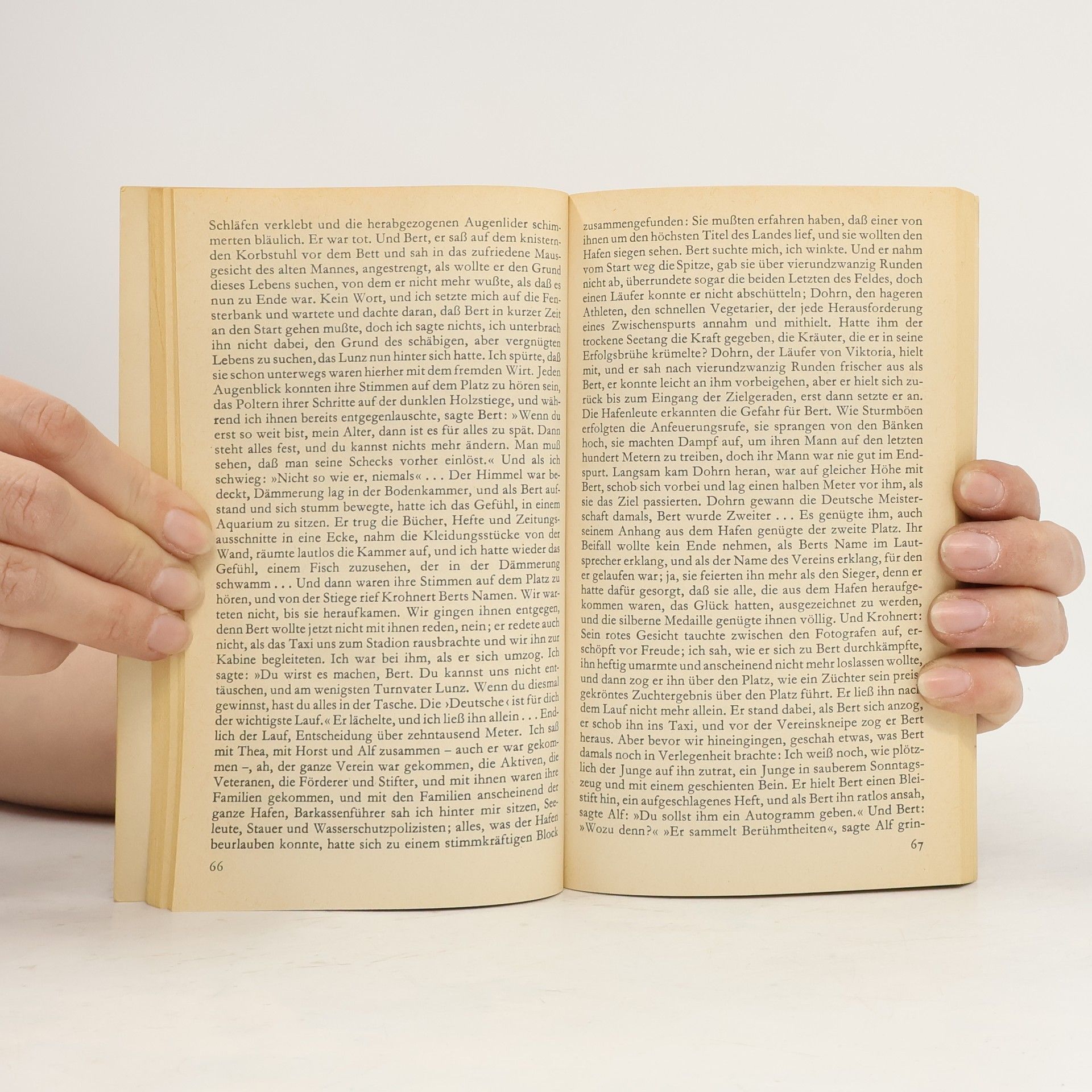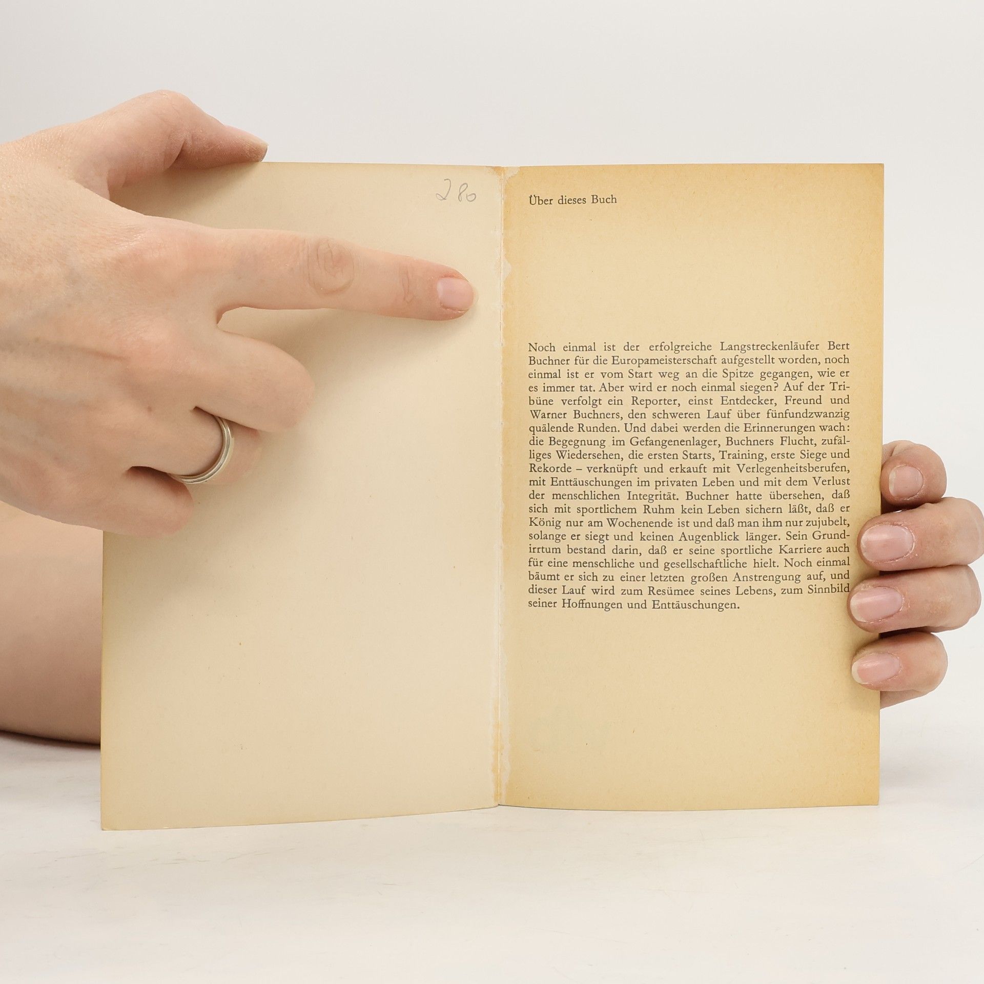 Noch einmal ist der erfolgreiche Langstreckenläufer Bert Buchner für die Europameisterschaft aufgestellt worden, noch einmal ist er vom Start weg an die Spitze gegangen, wie er es immer tat. Aber wird er noch einmal siegen? Auf der Tribüne verfolgt ein Reporter, einst Entdecker, Freund und Warner Buchners, den schweren Lauf über fünfundzwanzig quälende Runden. Und dabei werden Erinnerungen wach: an die erste Begegnung im Gefangenenlager, Buchners Flucht, ihr zufälliges Wiedersehen, die ersten Starts, verbissenes Training, Siege und Rekorde #150; verknüpft und erkauft mit Enttäuschungen im privaten Leben und mit dem Verlust der menschlichen Integrität. Das Dilemma des Leistungssportlers: Buchner begreift nicht, daß er nur auf der Aschenbahn König ist, daß man ihm nur zujubelt, solange er siegt, und keinen Augenblick länger. Sein Lauf um die Europameisterschaft: ein Sinnbild seiner Hoffnungen und zuletzt ein grandioser Lauf gegen sich selbst.