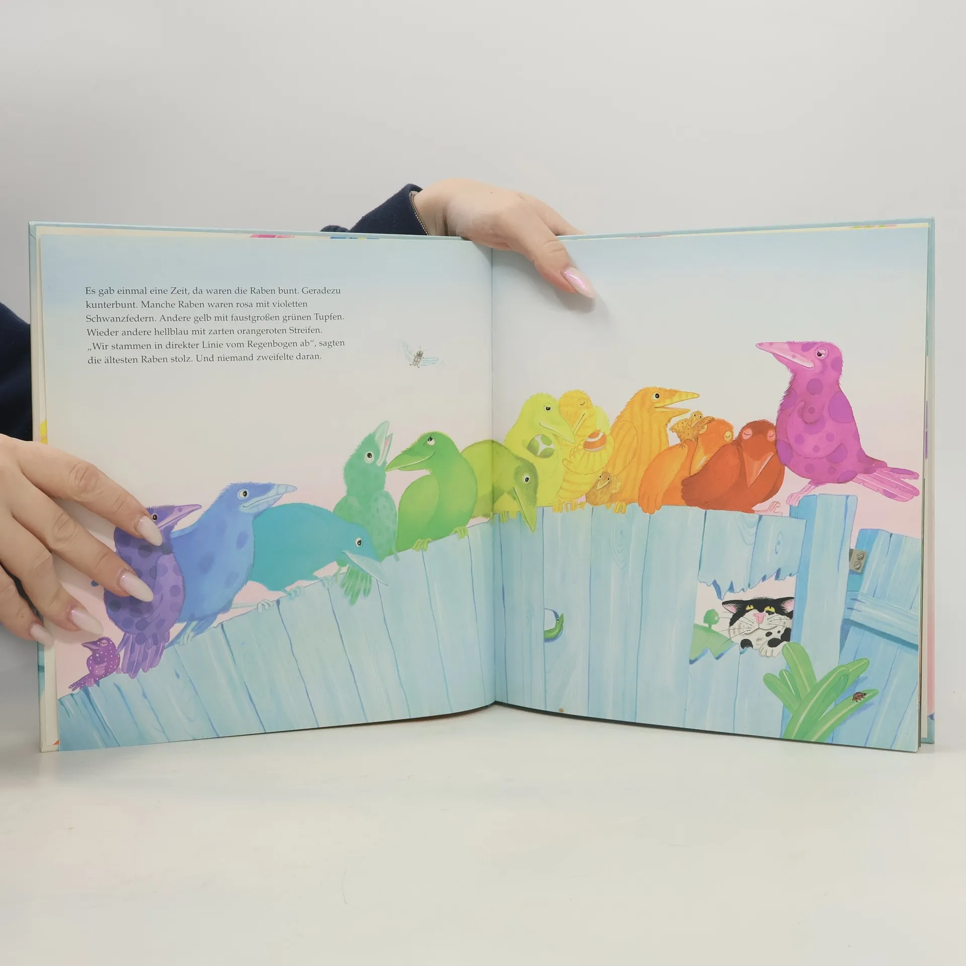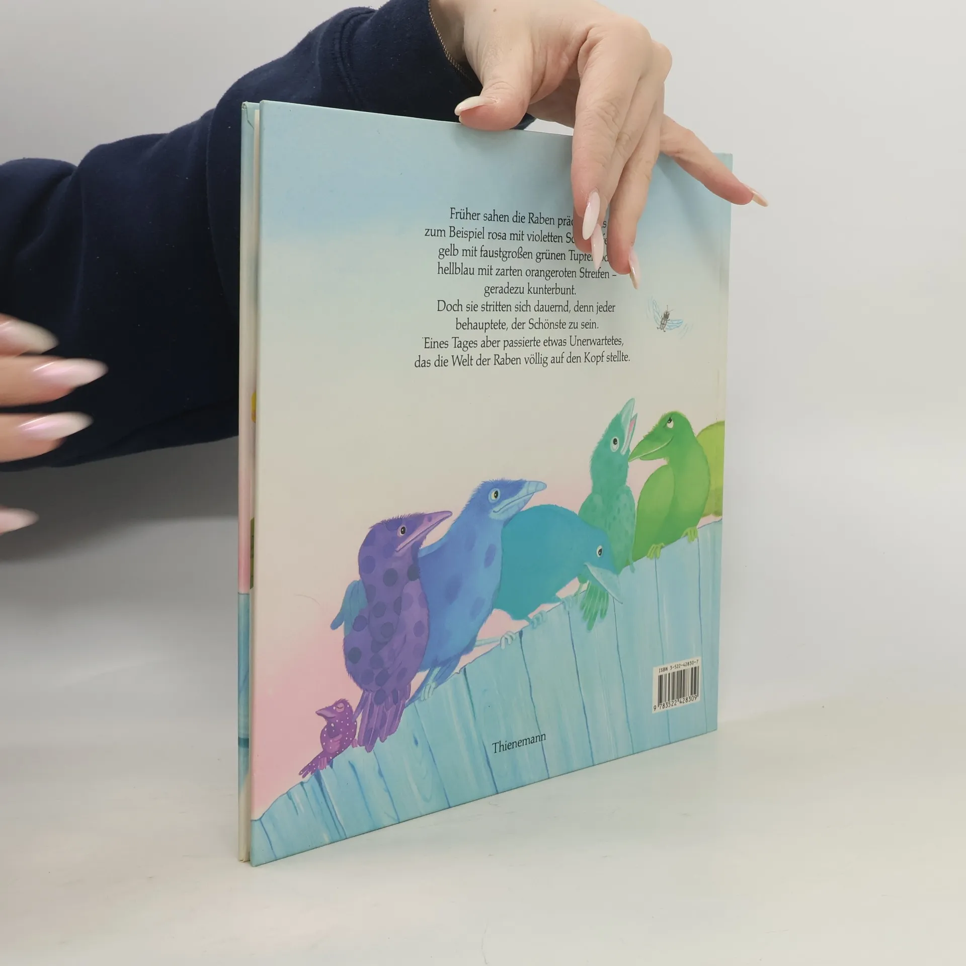 Früher sahen die Raben prächtig aus, zum Beispiel rosa mit violetten Schwanzfedern. Oder gelb mit großen grünen Tupfen. Oder hellblau mit zarten orangeroten Streifen - geradezu kunterbunt.Doch sie stritten sich dauernd, denn jeder behauptete, der Schönste zu sein. Da passierte eines Tages etwas Unerwartetes, das die Welt der Raben völlig auf den Kopf stellte