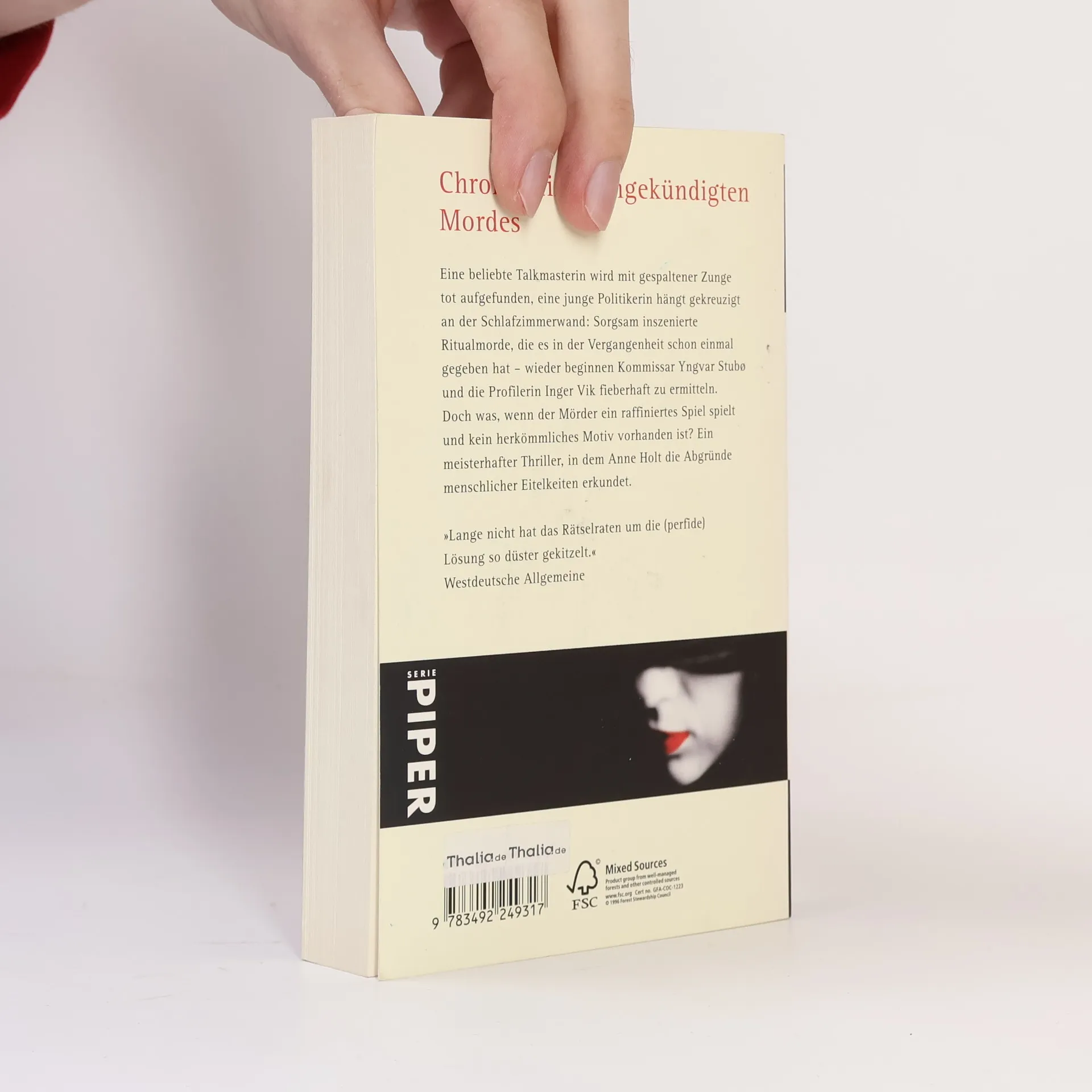 Eine beliebte Talkmasterin wird mit gespaltener Zunge tot aufgefunden, eine junge Politikerin hängt gekreuzigt an der Schlafzimmerwand: Sorgsam inszenierte Ritualmorde, die es in der Vergangenheit schon einmal gegeben hat – wieder beginnen Kommissar Yngvar Stubø und die Profilerin Inger Vik fieberhaft zu ermitteln. Doch was, wenn der Mörder ein raffiniertes Spiel spielt und kein herkömmliches Motiv vorhanden ist? Ein meisterhafter Thriller, in dem Anne Holt die Abgründe menschlicher Eitelkeiten erkundet.