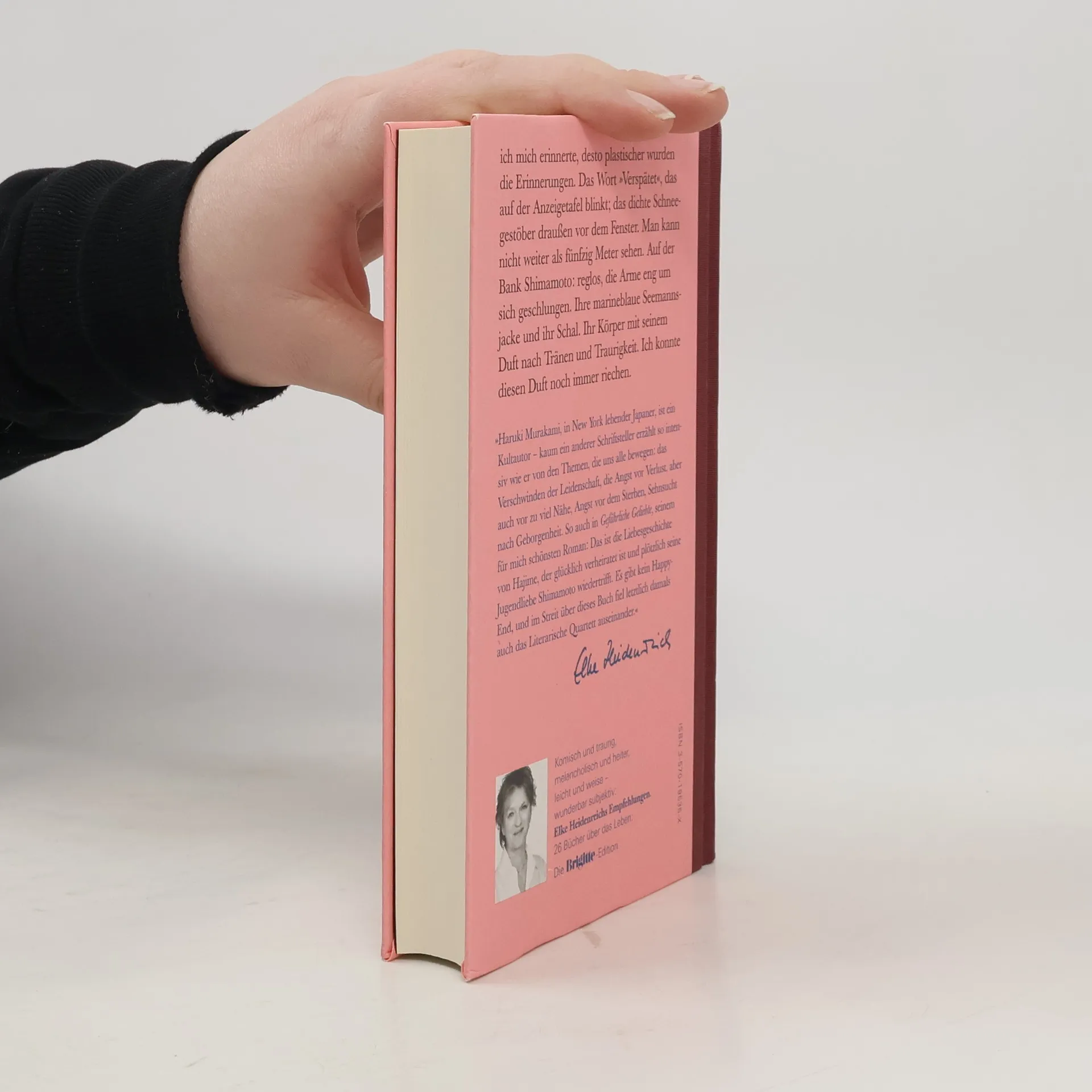"Ich mich erinnerte, desto platischer wurden die Erinnerungen. Das Wort "Verspãtet", das auf der Anzeigetafel blinkt; das dichte Schneegestöber draußen vor dem Fenster. Man kann nicht weiter als fünfzig Meter sehen. Auf der Bank Shimamoto: reglos, die Arme eng um sich geschlungen. Ihre marineblaue Seemannsjacke und ihr Schal. Ihr Körper mit seinem Duft nach Tränen und Traurrigkeit. Ich konnte diesen Duft noch immer riechen"-- Back cover