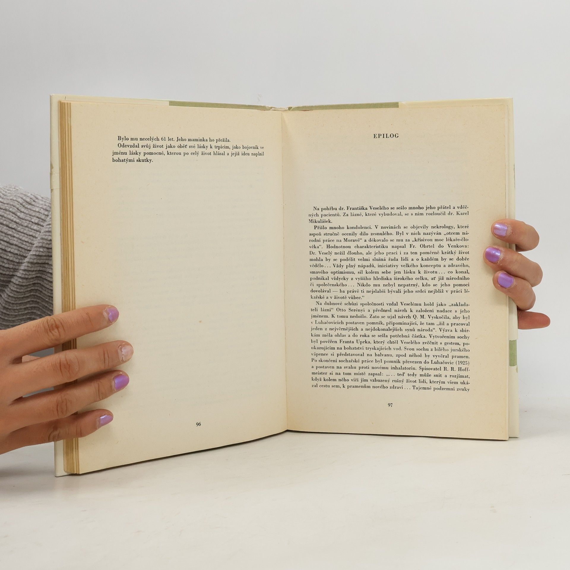 Beletrizovaný životopis vypráví nejen o tom, jak F. Veselý počal na sklonku minulého století budovat lázně s komplexní lékařskou péčí, ale i o tom, jak se jim snažil od počátku vtisknout ráz kulturního a uměleckého střediska. Poutavé vyprávění, zachycující i tehdejší poměry politické, hospodářské a kulturní, je doplněno dokumentárními fotografiemi. Dvojkniha obsahuje beletrizovaný životopis MUDr. Fr. Veselého z pera Františka Kožíka a pojednání Antonína Jančáře o Lázních Luhačovice po odchodu Dr. Veselého, o jejich přítomnosti a budoucnosti. Desítky barevných a černobílých fotografií.