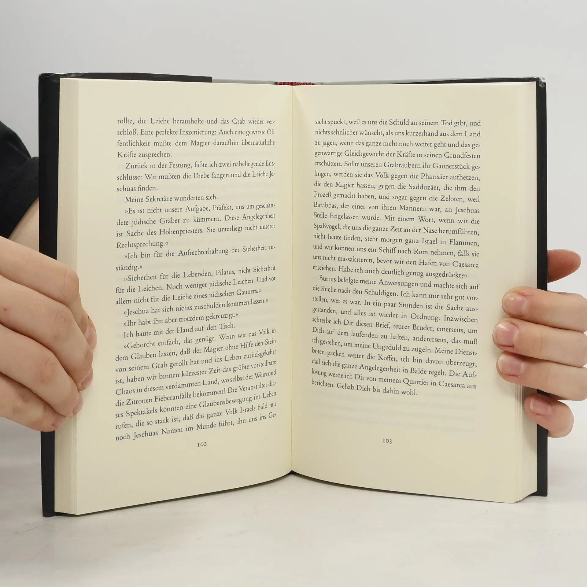 Ein Mann im Garten am Ölberg, allein, am Vorabend seiner Verhaftung. Die Worte der Mutter klingen ihm noch im Ohr: „Jemand, der liebt wie du, wird leiden müssen.“ Ein schlechter Jude, ein schlechter Zimmermann. Er wartet auf die Soldaten, die ihn holen und abführen werden. Er wartet auf seine Hinrichtung. Ein anderer Mann, ein anderer Ort. Vielleicht fünfzehn Verhaftungen, nur drei Kreuzigungen, es hätten geruhsame Feiertage für ihn werden können. Doch dann verschwindet die Leiche eines der gekreuzigten Männer. Ganz Jerusalem ist erschüttert, die Menschen sprechen von Wunder und Auferstehung, manche sagen, der Gekreuzigte sei ihnen erschienen, oder man habe zumindest davon gehört. Pilatus hat wenig Verständnis für die jüdischen Verrücktheiten, die Lage muß beruhigt, der Tote muß gefunden werden, die Ermittlungen beginnen. Judas, der Verräter, Pilatus, der Henker, und Jesus das Opferlamm? - vergessen wir diese Rollenfestschreibung. Schmitt befreit die Protagonisten der Passionsgeschichte von jeder Überhöhung oder Vorverurteilung, haucht ihnen mit frischer Feder neues Leben ein und erzählt uns eine sehr vertraute Geschichte so spannend und neu, als hörten wir sie zum ersten Mal.