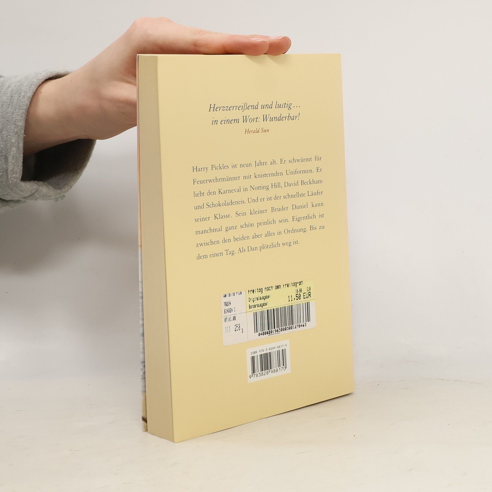 Harry Pickles ist neun Jahre alt. Er schwärmt für Feuerwehrmänner mit knisternden Uniformen. Er liebt den Karneval in Notting Hill, David Beckham und Schokoladeneins. Und er ist der schnellste Läufer seiner Klasse. Sein kleiner Bruder kann manchmal ganz schön peinlich sein. Eigentlich ist zwischen den beiden aber alles in Ordnung. Bis zu dem einen Tag. Als Dan plötzlich weg ist.