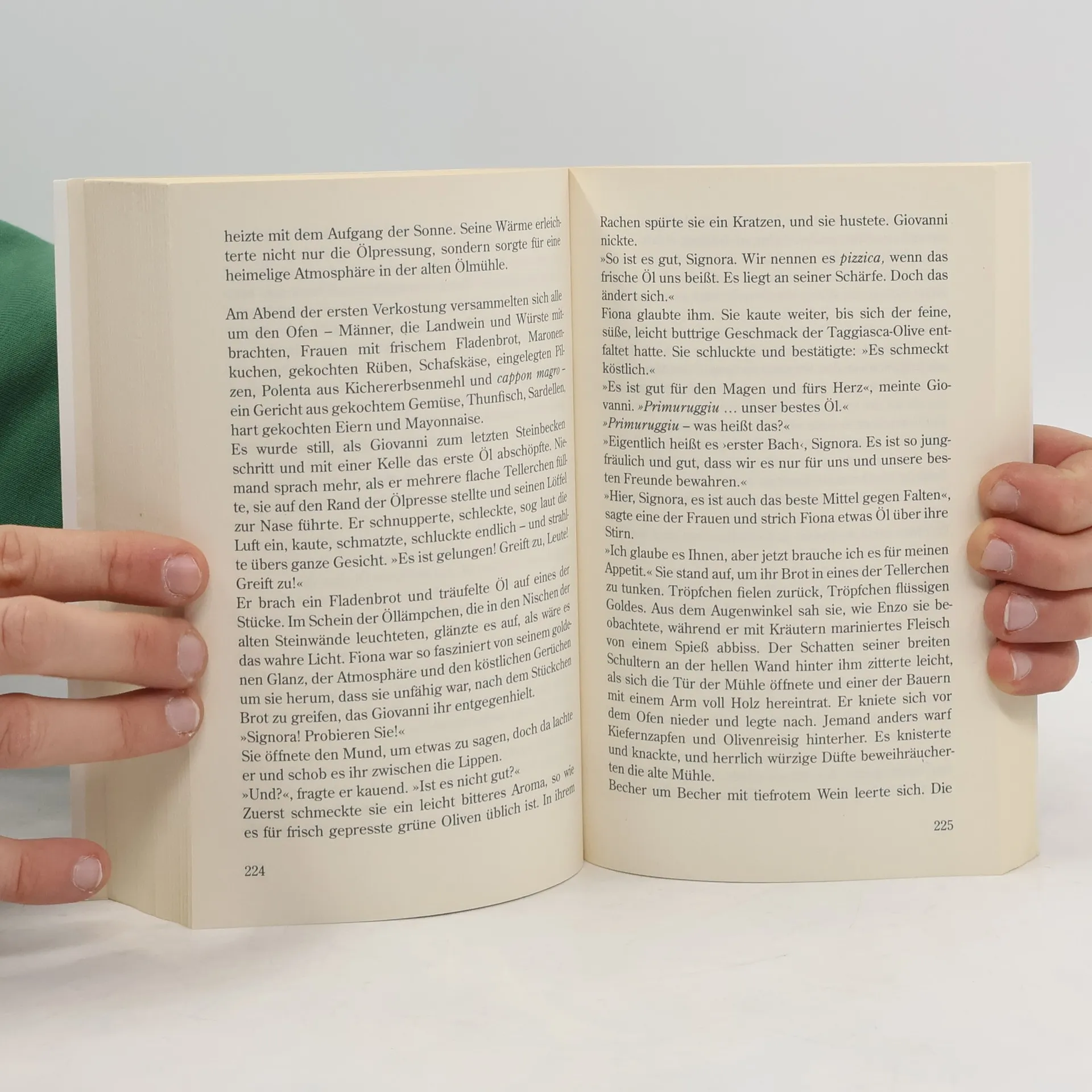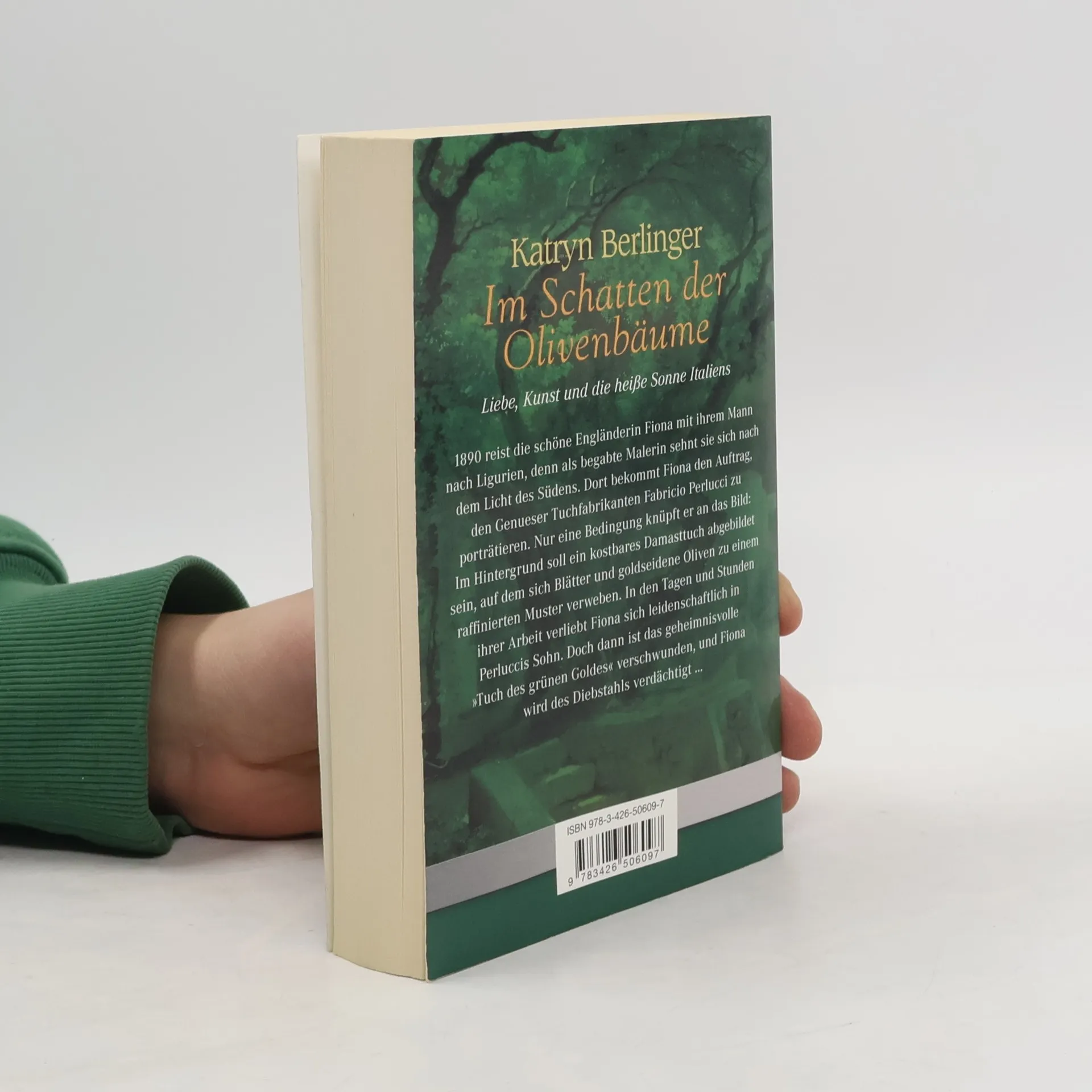 1890 reist die schöne Engländerin Fiona mit ihrem Mann nach Ligurien, denn sie ist eine begabte Malerin, die sich nach dem Licht des Südens sehnt. Fiona bekommt den Auftrag, den Genueser Tuchfabrikanten Fabricio Perlucci zu porträtieren, der jedoch eine Bedingung an das Bild knüpft: Im Hintergrund soll ein kostbares Damasttuch abgebildet sein, auf dem sich Blätter und goldseidene Oliven zu einem raffinierten Muster verweben. Während ihrer Arbeit verliebt sich Fiona leidenschaftlich in Perluccis Sohn. Doch dann ist eines Tages das geheimnisvolle ›Tuch des grünen Goldes‹ verschwunden, und Fiona wird des Diebstahls verdächtigt …