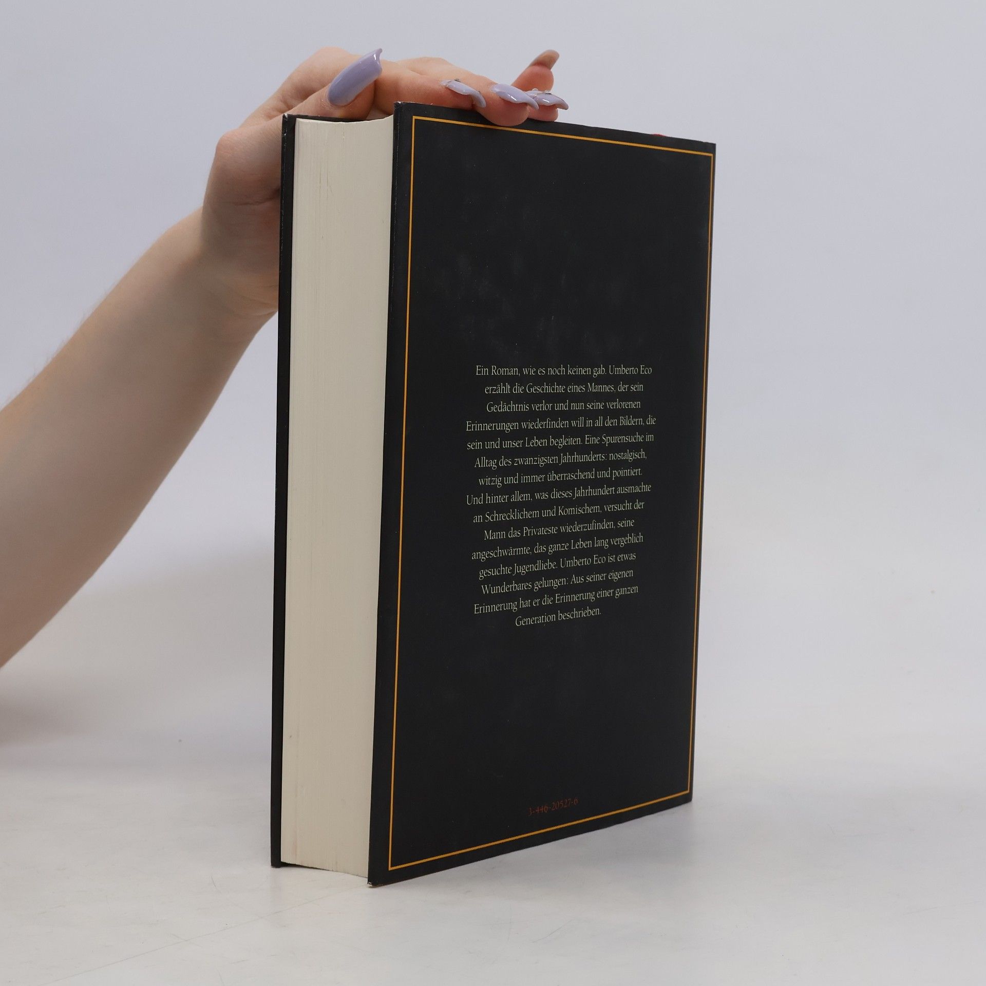 Giambattista Bodoni, Antiquar, erwacht aus dem Koma und hat einen Teil seines Gedächtnisses verloren. Auf der Suche nach seinen persönlichen Erinnerungen fährt er ins Haus seiner Kindheit und findet dort alles wieder: Bücher und Bilder, Comics und Kino, Pastadosen und Zigarettenschachteln. Was für Bodoni eine Reise der Wiederentdeckungen durch sein Leben und seine Lieben wird, gerät Eco zur Zeitreise durch das 20. Jahrhundert: witzig, nostalgisch und überraschend.