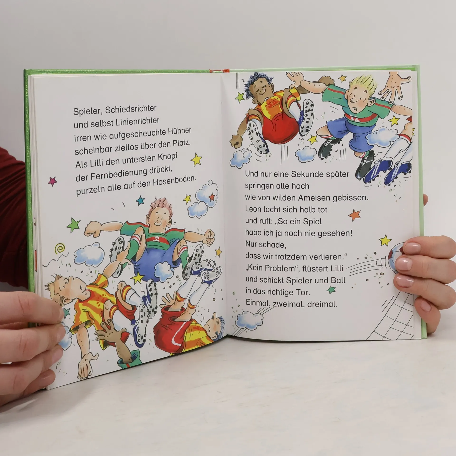 Alle sind im Fußballfieber! Auch Lillis Herz schlägt plötzlich schneller, als im Fernsehen gekickt wird. Und das hat einen besonderen Grund: Lilli und ihr Bruder Leon erleben nämlich gerade das verrückteste Fußballspiel aller Zeiten! 22 Spieler plumpsen gleichzeitig auf ihren Hosenboden, Schiedsrichter schlagen wilde Purzelbäume und ein Torwart krabbelt auf allen Vieren übers Feld. Au Backe - hat Lilli vielleicht den falschen Zauberspruch gemurmelt?