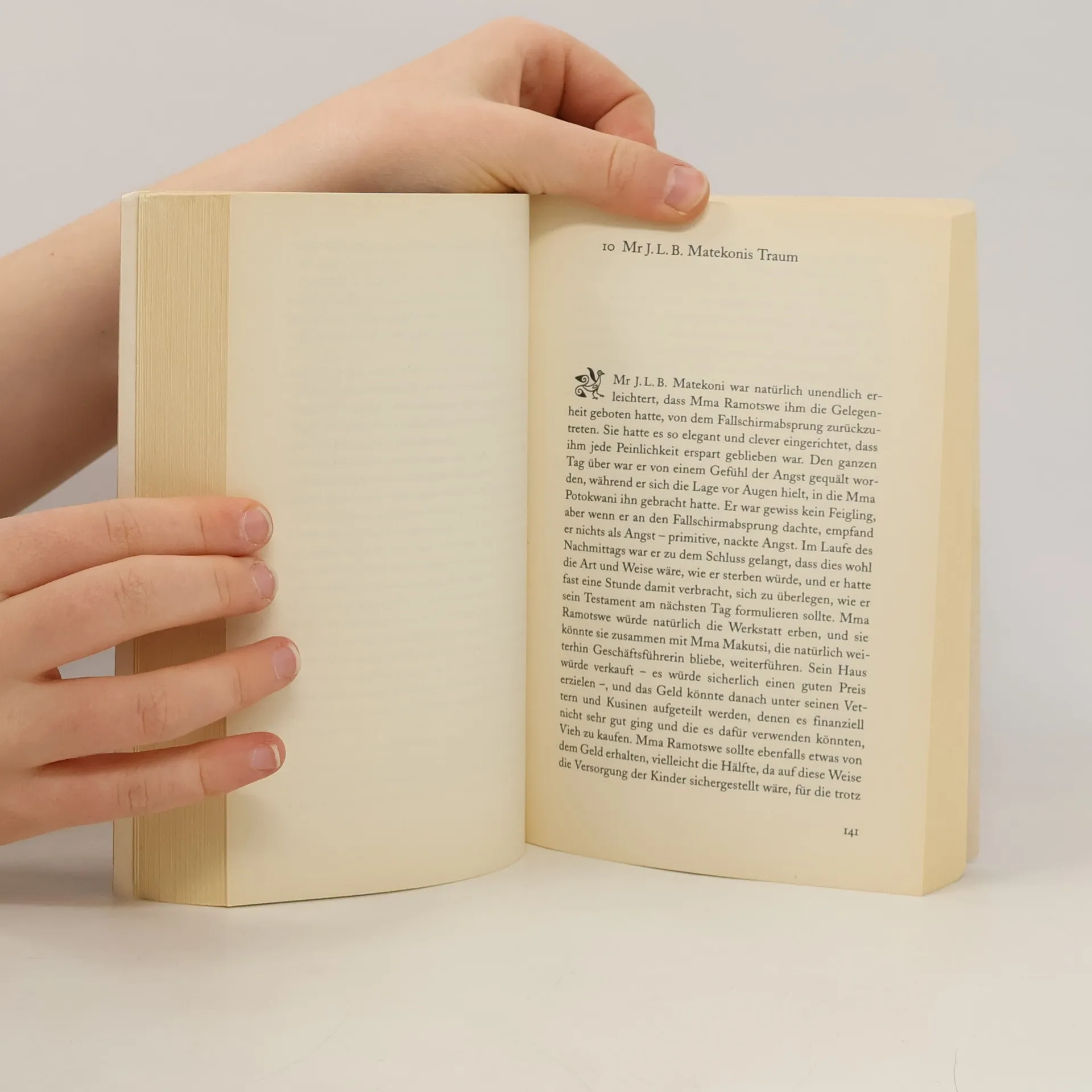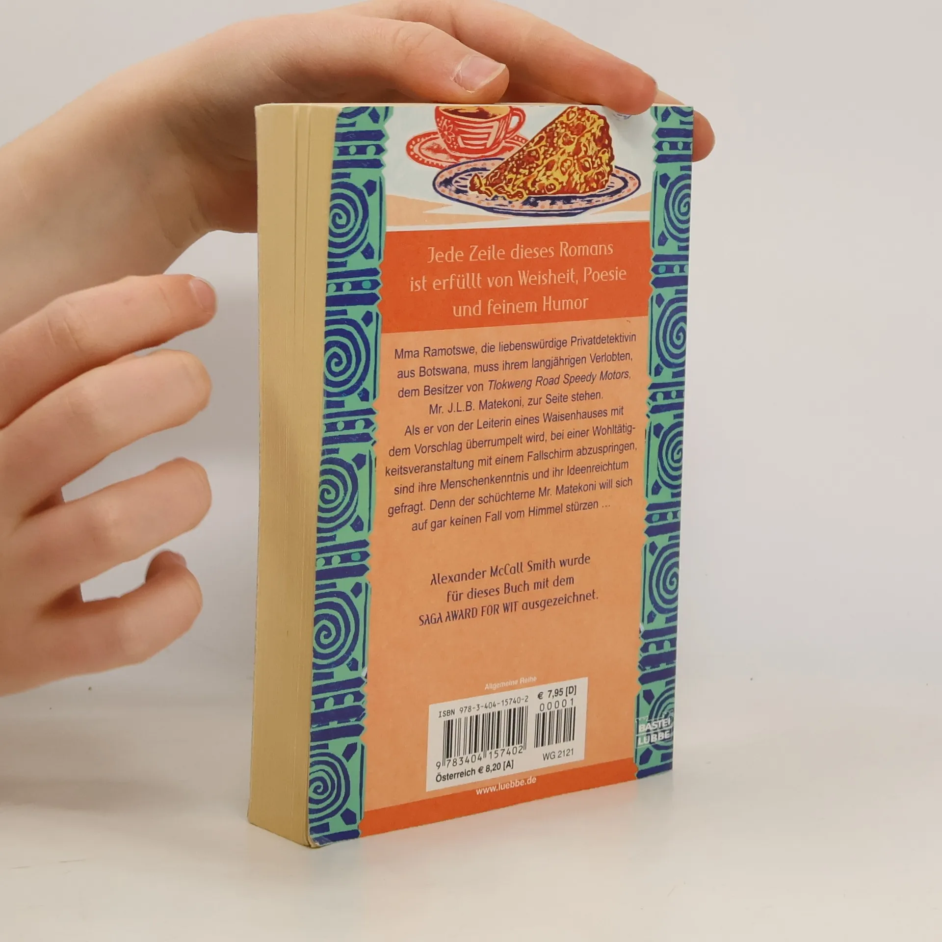 Mma Ramotswe, die liebenswürdige Privatdetektivin aus Botswana muss ihrem langjährigen Verlobten, dem Besitzer von Tlokweng Road Speedy Motors, Mr. J.L.B. Matekoni, zur Seite stehen. Als er von der Leiterin eines Waisenhauses mit dem Vorschlag überrumpelt wird, bei einer Wohltätigkeitsveranstaltung mit einem Fallschirm abzuspringen, sind ihre Menschenkenntnis und ihr Ideenreichtum gefragt. Denn der schüchterne Mr. Matekoni will sich auf gar keinen Fall vom Himmel stürzen ... Jede Zeile dieses Romans ist erfüllt von Weisheit, Poesie und feinem Humor. Alexander McCall Smith wurde für dieses Buch mit dem "Saga Award for Wit"