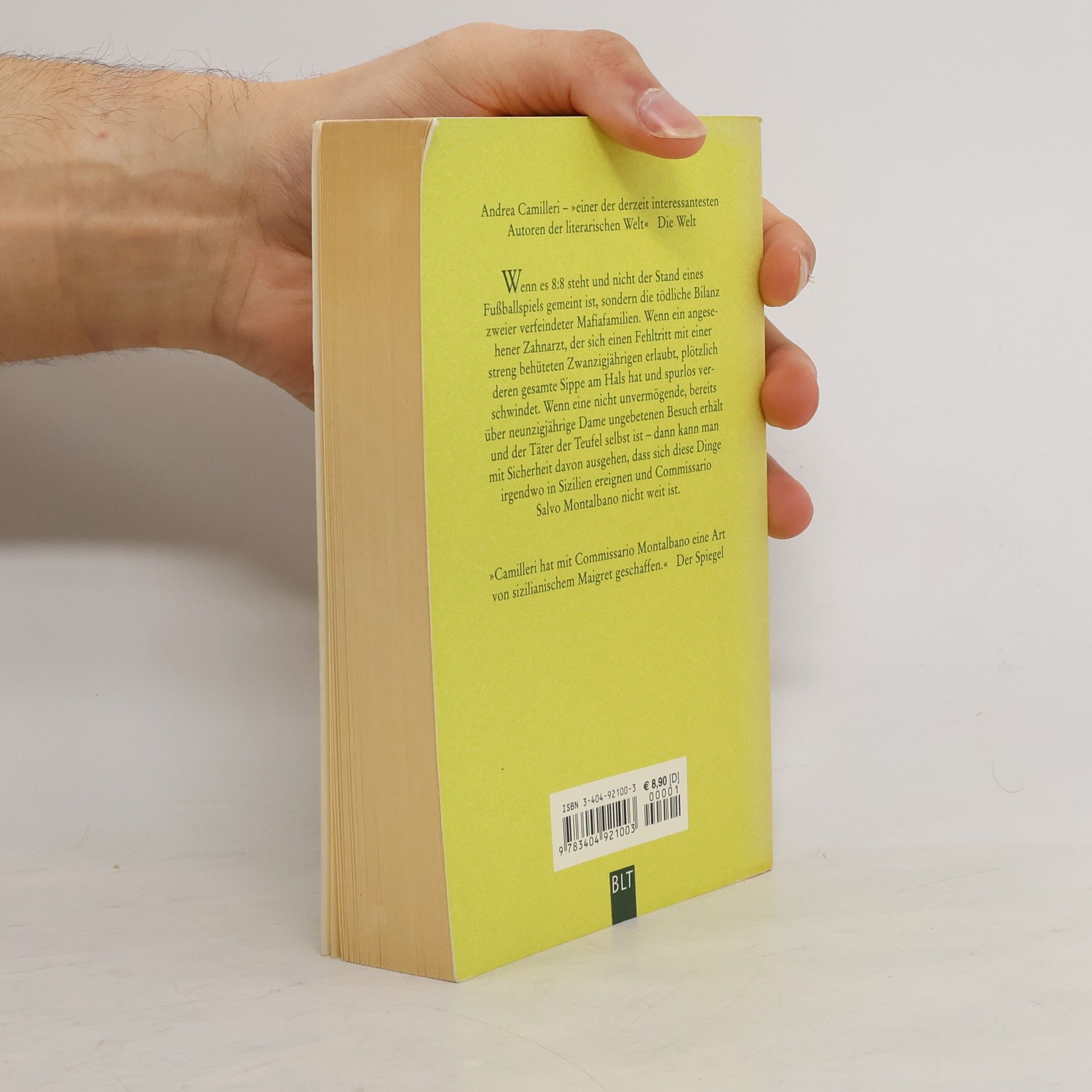 Wenn es 8:8 steht und nicht der Stand eines Fußballspiels gemeint ist, sondern die tödliche Bilanz zweier verfeindeter Mafia-Familien. Wenn ein angesehener Arzt, der sich einen Fehltritt mit einer streng behüteten Zwanzigjährigen erlaubt, plötzlich deren gesamte Sippe am Hals hat und spurlos verschwindet. Wenn eine nicht unvermögende, bereits über neunzigjährige Dame ungebetenen Besuch erhält und der Täter der Teufel selbst ist - dann kann man mit Sicherheit davon ausgehen, dass dich diese Dinge irgendwo in Sizilien ereignen und Commissario Montalbano nicht weit ist.