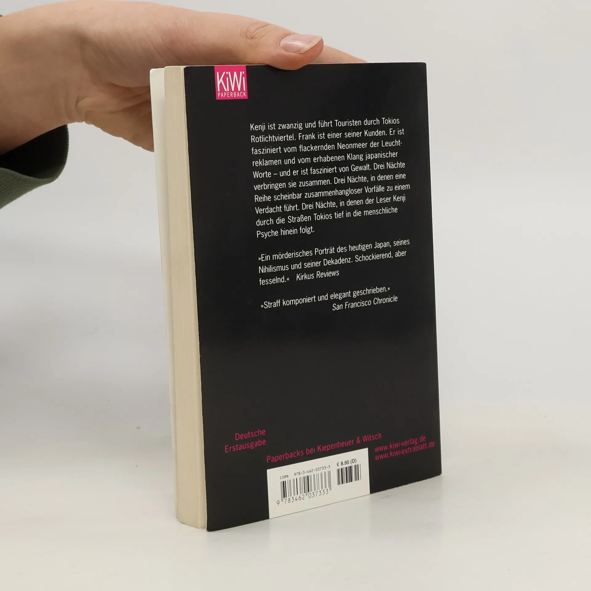Präzise, schonungslos und scharf wie ein Sashimi-Messer Kenji führt Touristen durch Tokios Rotlichtviertel. Frank ist Amerikaner und Kenjis Kunde. Er ist fasziniert von der Atmosphäre der Stadt und vom erhabenen Klang japanischer Worte – und er ist fasziniert von Gewalt.Die letzten drei Tage des Jahres. Wie immer drängeln sich in Kabuki-cho, Tokios bekanntem Rotlichtbezirk, sexhungrige Freier durch die vom flackernden Neonlicht erfüllten Häuserschluchten. Minderjährige Mädchen verabreden sich zum Sex mit »väterlichen Freunden«. Auf der Straße werben Anreißer für Peepshows, Dessous-Bars und Massagesalons. Eine Welt mit einem eigenen Code. Jene, die ihn nicht verstehen, wenden sich an Kenji. Kenji ist zwanzig und Nightlife-Guide. Er übersetzt die Wünsche seiner Kunden und teilt ihnen die Konditionen der Anbieter mit. Die Leere und Einsamkeit der Menschen nimmt er ungerührt wahr und bleibt stets auf Distanz. Er weiß zwar, was ihm nicht behagt, doch er richtet nicht und greift nicht ein. Dann trifft er Frank, und zum ersten Mal weicht seine gewohnte Coolness einem nervösen Unbehagen. Eine Reihe scheinbar zusammenhangloser Kleinigkeiten formt sich in Kenjis Kopf zu einem Verdacht. Der Leser folgt Kenji durch die Straßen Tokios tief in die menschliche Psyche hinein.