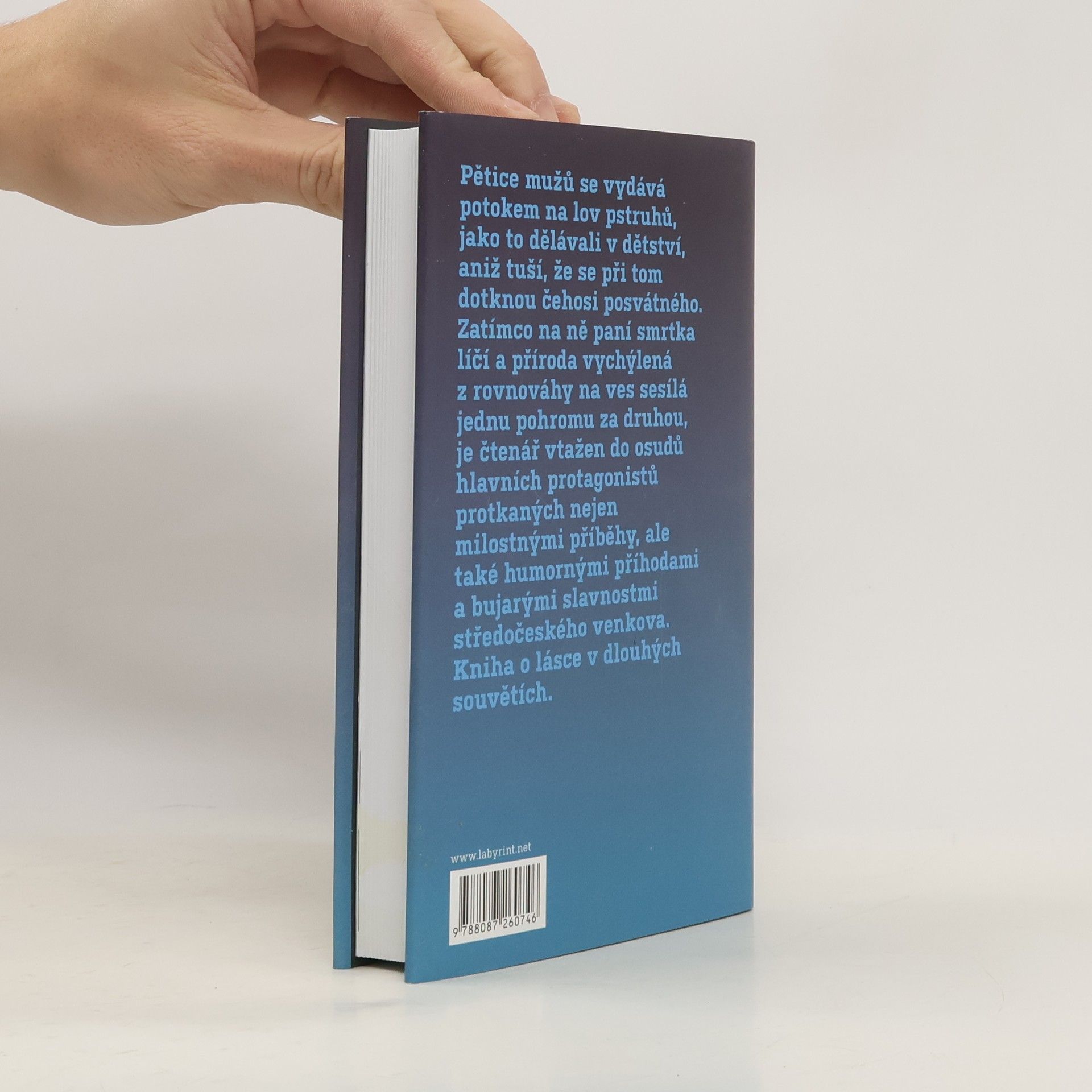 Pětice mužů se vydává potokem na lov pstruhů, jako to dělávali v dětství, aniž tuší, že se při tom dotknou čehosi posvátného. Zatímco na ně paní smrtka líčí a příroda vychýlená z rovnováhy na ves sesílá jednu pohromu za druhou, je čtenář vtažen do osudů hlavních protagonistů protkaných nejen milostnými příběhy, ale také humornými příhodami a bujarými slavnostmi středočeského venkova. Kniha o lásce v dlouhých souvětích. Po románovém debutu Doživotí, který na české literární scéně vzbudil značný rozruch, přichází Martin Jun s knihou tematicky i stylisticky odlišnou. S vypravěčskou suverenitou čtenáři předkládá bohatou mozaiku ze života v zapomenuté vísce, kde je pomíjivosti jednotlivce nadřazená sounáležitost k obci a kde mají své nezastupitelné místo pověry, mýty a předsudky. Realitou pro vesničany není to, co se doopravdy odehrálo, ale co si o tom mezi sebou povídají.