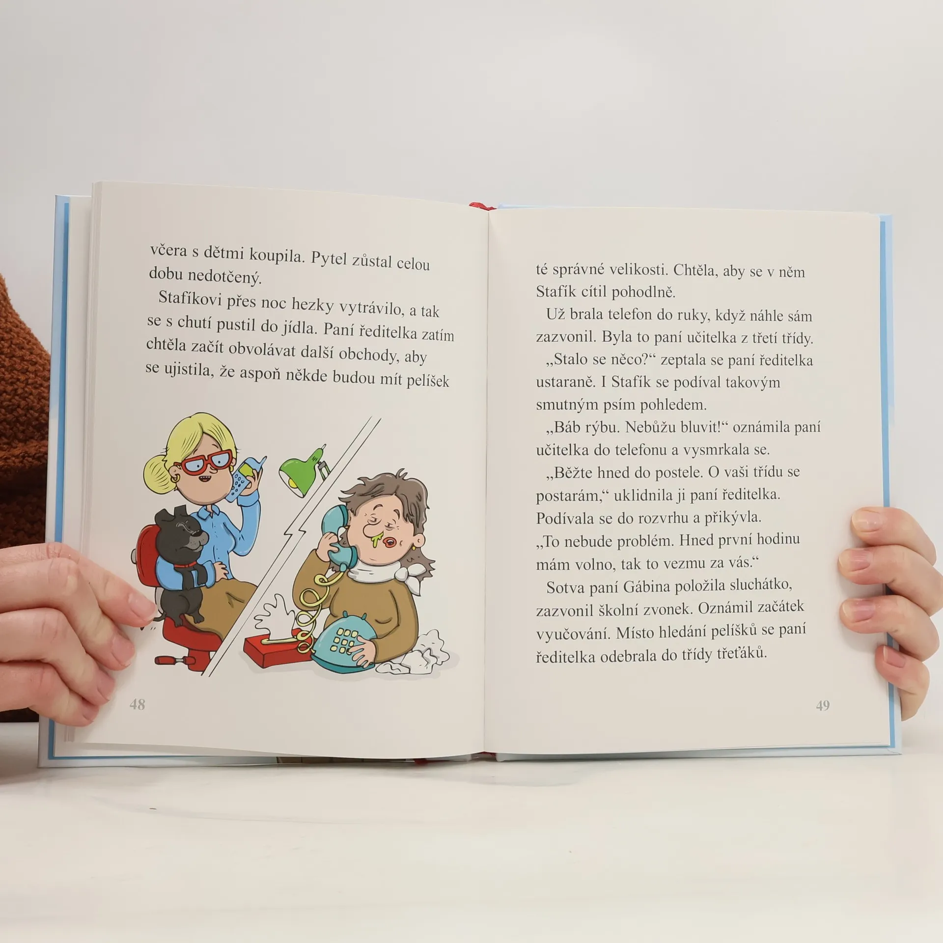 Gábina miluje psy. V útulku je zase štěňátko, které by moc rádo mělo svého pána. Anebo paničku? Náhoda tomu chce, že se tihle dva potkají. Štěňátko dostane jméno Stafík a dokáže neuvěřitelné věci. A protože je Gábina ředitelkou školy, a protože se ti dva potkají zrovna na školní chodbě, stane se ze Stafíka brzy miláček celé školy. Navíc, když se ze Stafíka vyklube taky velký hrdina, je z něj prostě a jednoduše školní štěně! Kniha je jako první čtení určena dětem prvních a druhých tříd. Jejich schopnostem a možnostem je přizpůsoben i jazyk knihy, proto si děti knihu mohou číst samostatně, ale i v doprovodu rodičů, či jako celotřídní četbu. Kniha je určena malým čtenářům od 6 let.