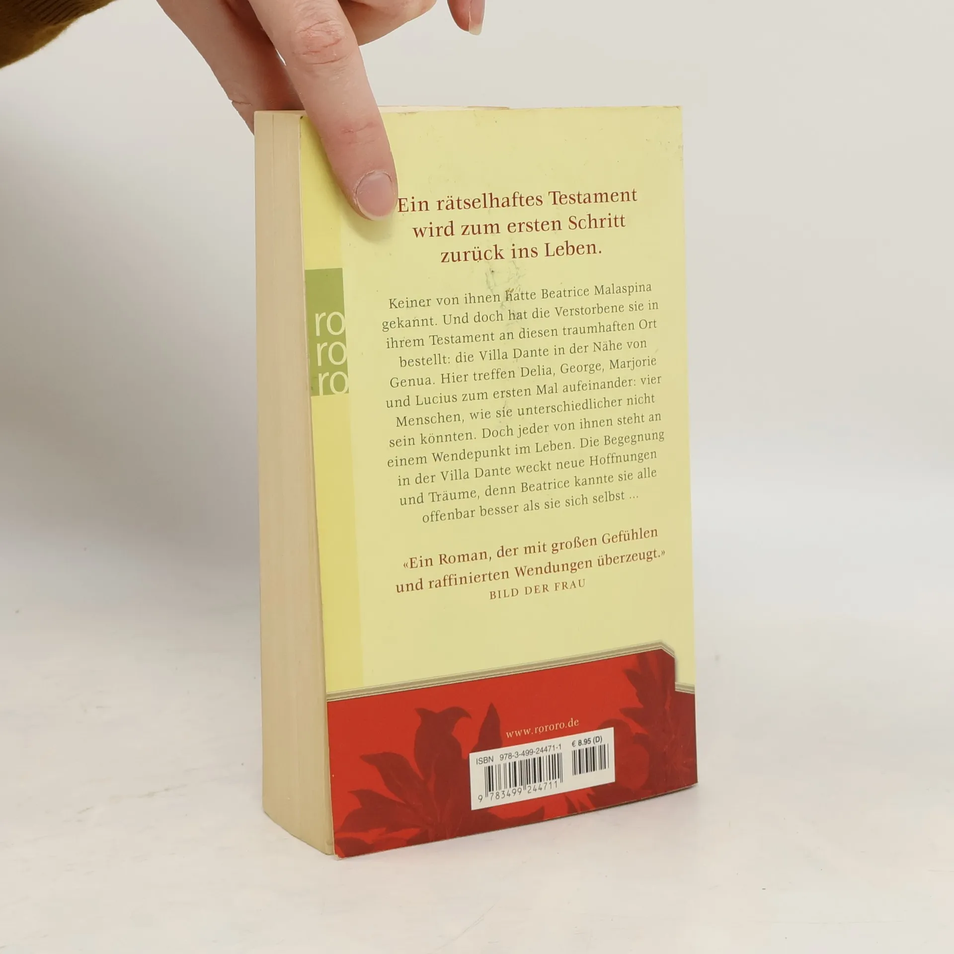 Ein rätselhaftes Testament wird zum ersten Schritt zurück ins Leben. Keiner von ihnen hatte Beatrice Malaspina gekannt. Und doch hat die Verstorbene sie in ihrem Testament an diesen traumhaften Ort bestellt: die Villa Dante in der Nähe von Genua. Hier treffen Delia, George, Marjorie und Lucius zum ersten Mal aufeinander: vier Menschen, wie sie unterschiedlicher nicht sein könnten. Doch jeder von ihnen steht an einem Wendepunkt im Leben. Die Begegnung in der Villa Dante weckt neue Hoffnungen und Träume, denn Beatrice kannte sie alle offenbar besser als sie sich selbst … „Ein Roman, der mit großen Gefühlen und raffinierten Wendungen überzeugt.“ (Bild der Frau)