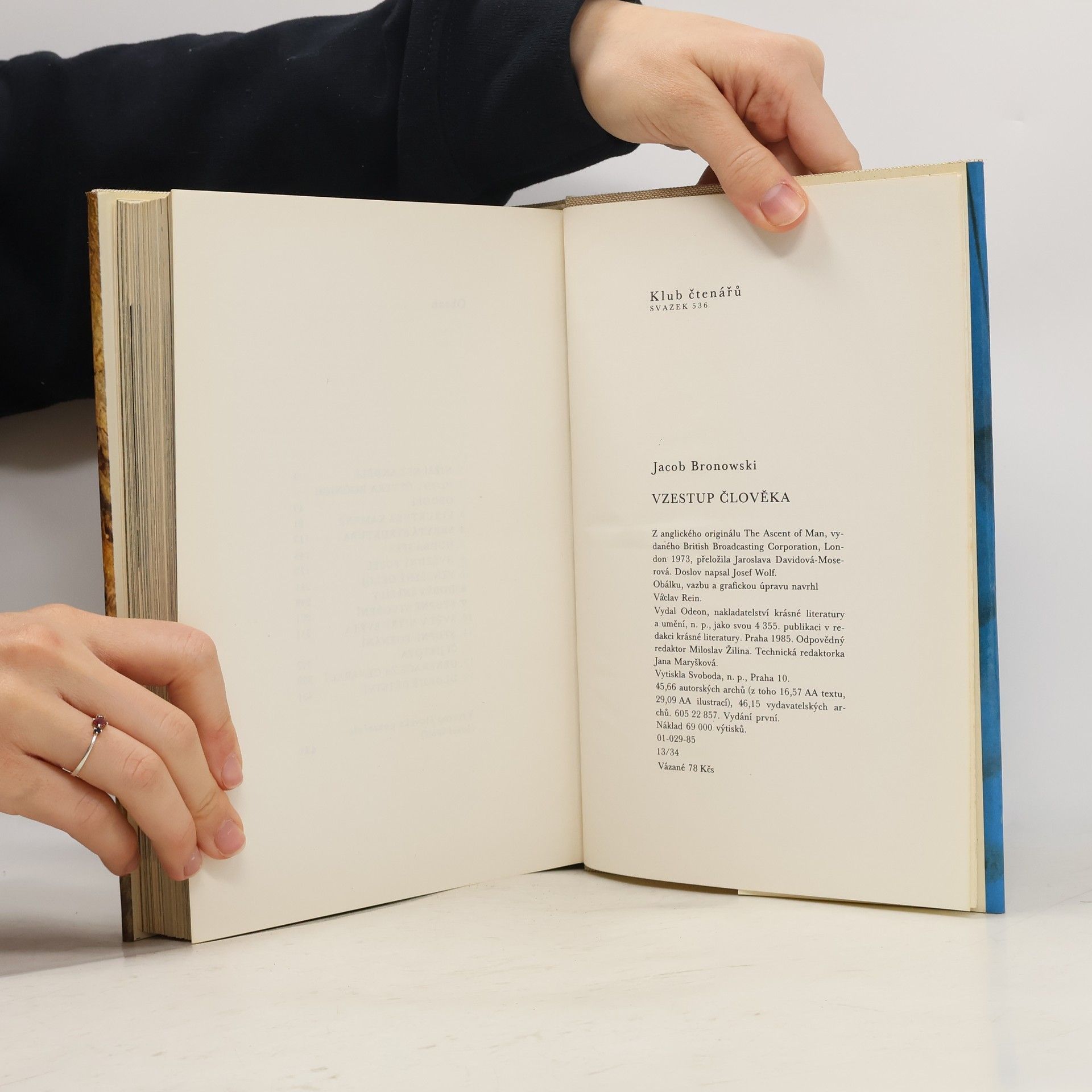 Kniha je písemným zpracováním stejnojmenného 13dílného dokumentu, který Bronowski připravil pro BBC v roce 1973 (seriál byl v roce 2000 britskou filmovou akademií zařazen mezi 100 nejvýznamnějších TV pořadů světa). Jde v podstatě o doslovný přepis libreta dokumentu. Sám autor knihu charakterizuje jako sbírku esejí na téma vznik a vývoj lidské civilizace a lidského poznávání a objevování. Kniha je bohatě ilustrovaná a kombinace slova a obrazu tvoří z knihy jedinečné dílo. Náročnější, ale také zajímavější úkol než podat historický vývoj lidského intelektu jakožto tvůrce duchovních hodnot, spočívajících hlavně v poznávání, si autor sotva mohl vytknout. Jacob Bronowski věří, že tento vývoj se čtenáři nejlíp přiblíží, vylíčí-li rovněž osudy, nebo spíš obrazy ze života těch, kteří se k němu nejdůrazněji propracovávali. Přitom však dovede udržet výklad na úměrně obecné úrovni. Kapitoly: Nižší než andělé, Plody čtvera ročních období, Struktura kamene, Skrytá struktura, Hudba sfér, Hvězdný posel, Vznešený orloj, Dobývání síly, Stupně stvoření, Svět v nitru světa, Stupně poznání či jistota, Generace za generací, Dlouhé dětství. První vydání. Cena knihy v čase vydání: 78.- Kčs. Přeložila Jaroslava Davidová-Moserová.
