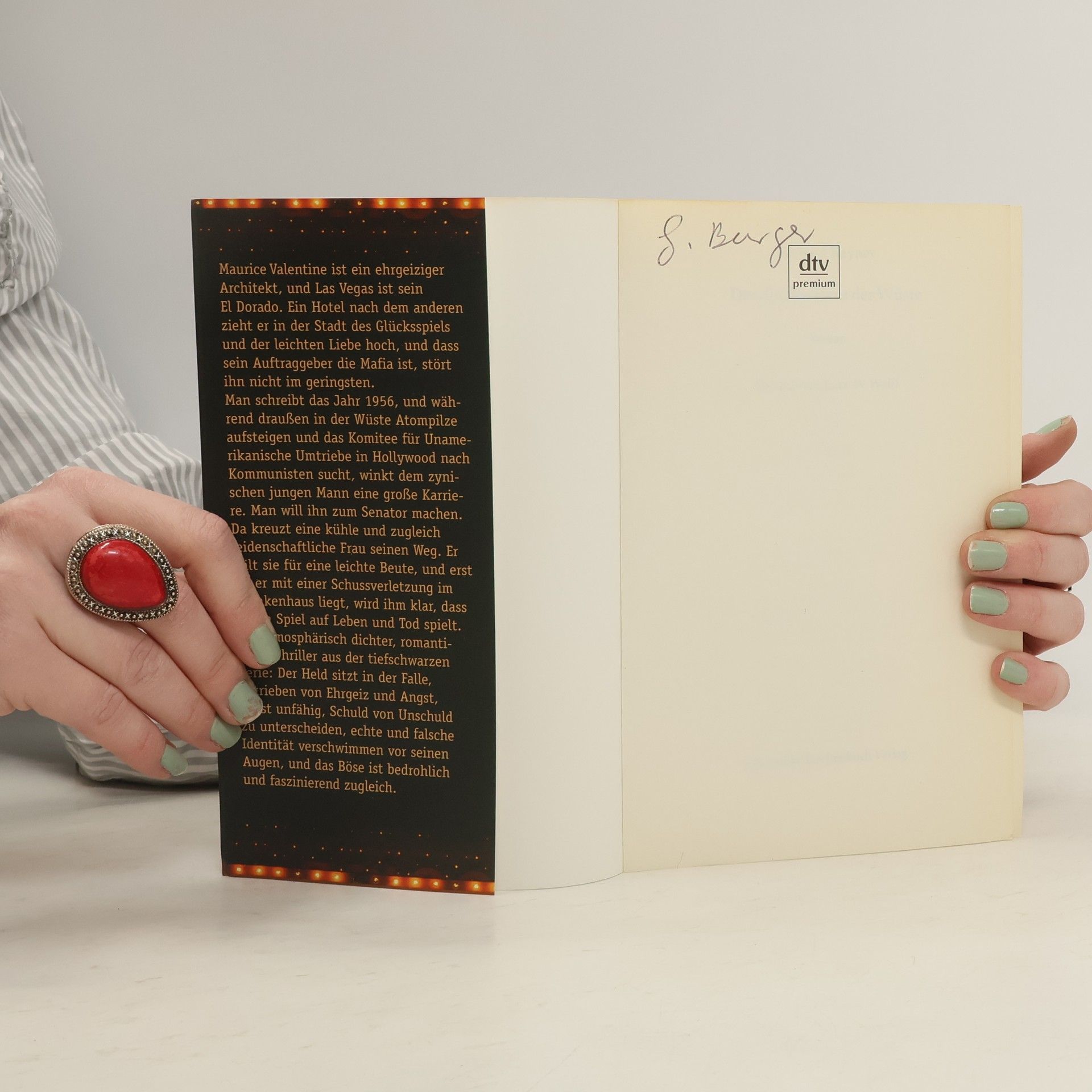 Die Rache einer gedemütigten Frau ist lebensgefährlich. Maurice Valentine ist ein ehrgeiziger Architekt, und Las Vegas ist sein El Dorado. Ein Hotel nach dem anderen zieht er in der Stadt des Glücksspiels und der leichten Liebe hoch, und dass sein Auftraggeber die Mafia ist, stört ihn nicht im geringsten. Man schreibt das Jahr 1956, und während draußen in der Wüste Atompilze aufsteigen und das Komitee für Unamerikanische Umtriebe in Hollywood nach Kommunisten sucht, winkt dem zynischen jungen Mann eine große Karriere. Man will ihn zum Senator machen. Da kreuzt eine kühle und zugleich leidenschaftliche Frau seinen Weg. Er hält sie für eine leichte Beute, aber erst als er mit einer Schussverletzung im Krankhaus liegt, wird ihm klar, dass er ein Spiel auf Leben und Tod spielt. Ein atmosphärisch dichter, romantischer Thriller aus der tiefschwarzen Serie: Der Held sitzt in der Falle, getrieben von Ehrgeiz und Angst, er ist unfähig, Schuld von Unschuld zu unterscheiden, echte und falsche Identität verschwimmen vor seinen Augen, das Böse ist bedrohlich und faszinierend zugleich. »Wer Raymond Chandler, James Ellroy und Elmore Leonard schätzt, wird Richard Rayner lieben.« Deggendorfer aktuell