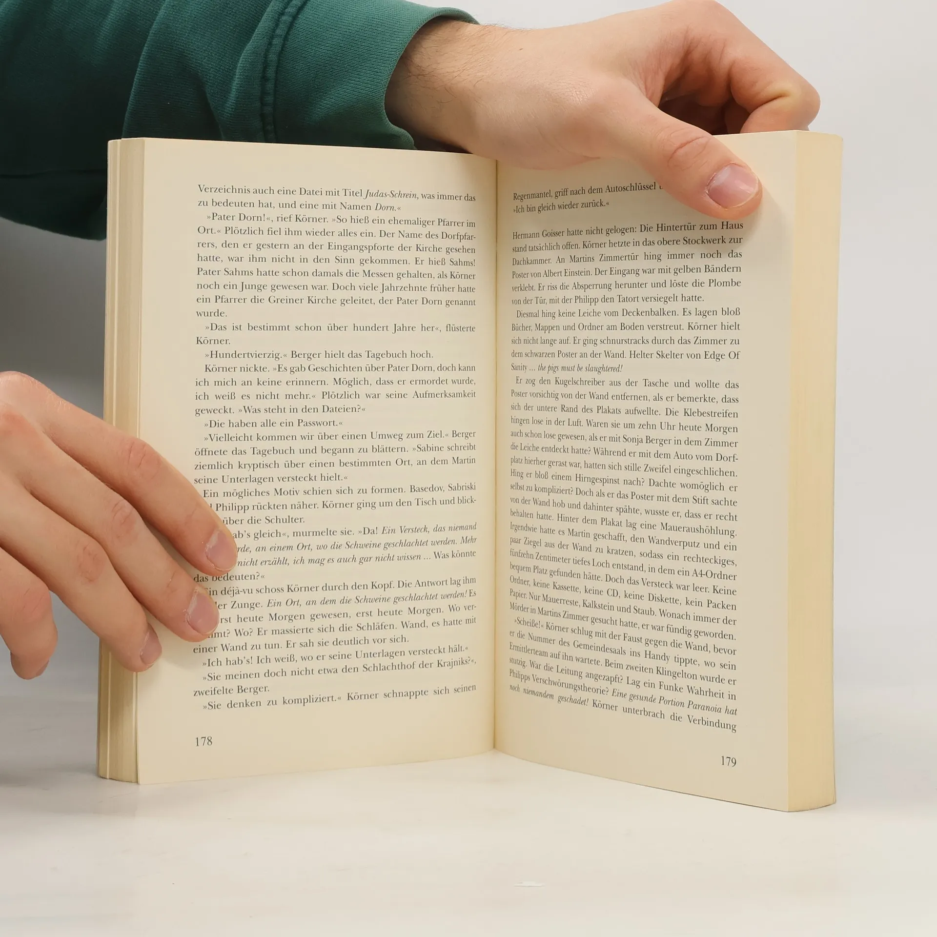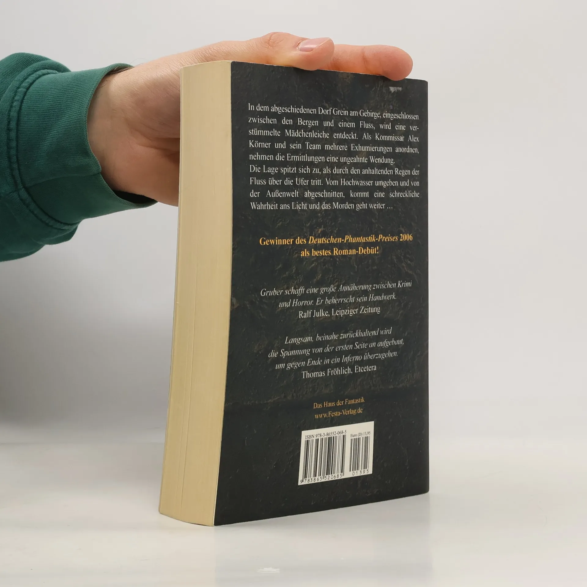 In dem abgeschiedenen Dorf Grein am Gebirge, eingeschlossen zwischen den Bergen und einem Fluss, wird eine verstümmelte Mädchenleiche entdeckt. Als Kommissar Alex Körner und sein Team mehrere Exhumierungen anordnen, nehmen die Ermittlungen eine ungeahnte Wendung. Die Lage spitzt sich zu, als durch den anhaltenden Regen der Fluss über die Ufer tritt. Vom Hochwasser umgeben und von der Außenwelt abgeschnitten, kommt eine schreckliche Wahrheit ans Licht und das Morden geht weiter. Eine Festa Originalausgabe. Neuauflage, Paperback 21 x 13,5 cm, Umschlag in Lederoptik. Ekz-Informationsdienst: „Der Leser kommt durch Rückblenden und der Kommissar durch die Lektüre eines Tagebuchs hinter das schaurige Geheimnis der Dorfbewohner. Toller Grusel, der durch dichte Atmosphäre und guter Stilistik besticht.“ Cthuloide Welten: "Ein okkulter Thriller. Das Ende ist voll und ganz im Sinne lovecraft'schen Grauens und mehr als gelungen, geradezu brillant!.„ Quarber Merkur: “Konsequent, folgerichtig, unerbittlich und spannend steuert der Roman auf sein düsteres Ende zu, die Stationen des Kreuzwegs des Helden sind ungewöhnlich detailreich, anschaulich und packend.„ Schwarzes Wien. “Bis zum Ende verliert das Buch nichts an seiner Wirkung und man wird durch immer neuere Wendungen überrascht.„Leipziger Internet Zeitung: “Gruber schafft eine große Annäherung zwischen Krimi und Horror. Er beherrscht sein Handwerk."