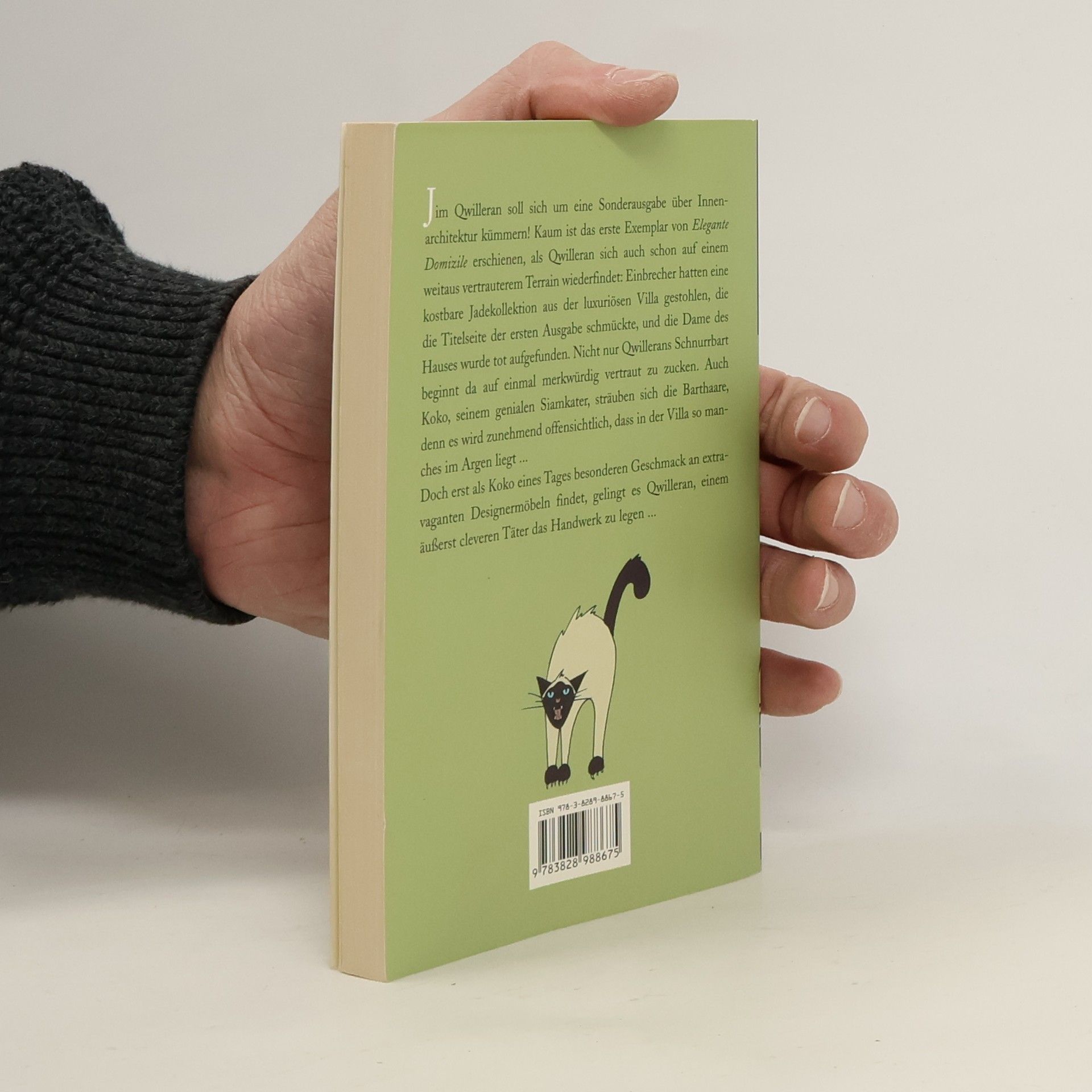 Jim Qwilleran, der schnauzbärtige Zeitungsmann, ist nicht gerade begeistert von seiner neuen Aufgabe beim Daily Fluxion. Ausgerechnet Qwill, der eine kunstvolle Draperie nicht von einem einfachen Vorhang unterscheiden kann, soll sich um eine Sonderausgabe über Innenarchitektur kümmern! Doch kaum ist das erste Exemplar von Elegante Domizile erscheinen, als Qwilleran sich auch schon auf einem weitaus vertrauteren Terrain wiederfindet: Einbrecher hatten eine kostbare Jadekollektion aus der luxuriösen Villa gestohlen, die die Titelseite der ersten Ausgabe schmückte, und die Dame des Hauses wurde tot aufgefunden. Nicht nur Qwillerans Schnurrbart beginnt da auf einmal merkwürdig vertraut zu zucken. Auch Koko, seinem genialen Siamkater, sträuben sich die Barthaare, denn es wird zunehmend offensichtlich, dass in der Villa so manches im Argen liegt Doch erst als Koko eines Tages besonderen Geschmack an extravaganten Designermöbeln findet, wird die Fährte richtig heiß.