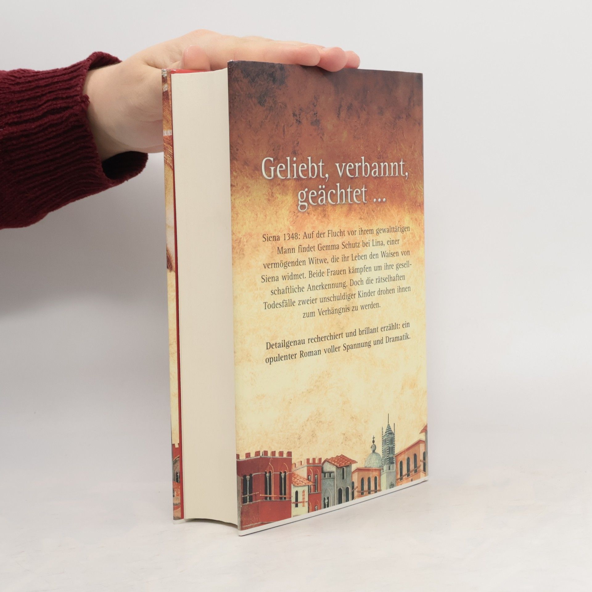 Geliebt, verbannt, geächtet Siena 1368: Auf der Flucht vor ihrem gewalttätigen Mann findet Gemma Schutz bei Lina, einer vermögenden Witwe, die ihr Leben den Waisen von Siena widmet. Beide Frauen kämpfen um ihre gesellschaftliche Anerkennung. Doch die rätselhaften Todesfälle zweier unschuldiger Kinder drohen ihnen zum Verhängnis zu werden … Als Gemma sich aus den Fängen ihres Mannes befreit, weiß sie, dass ihr ein Leben als ehrbare Frau für immer verwehrt sein wird. Scheidungen sind ein Sakrileg, und so bleibt ihr nur die Flucht. Wie ein Geschenk des Himmels erscheint ihr da die Begegnung mit Lina. Aufopferungsvoll kümmert sich die junge Witwe um die Waisen von Siena und bietet Gemma an, sie zu unterstützen. Doch dann sterben kurz hintereinander auf mysteriöse Weise zwei Kinder, die in Linas Obhut standen. Eine heimliche Obduktion ergibt lediglich, dass die Kinder ohne sichtbare Anwendung von Gewalt zu Tode kamen. Wer ist für die ungeheuerlichen Taten verantwortlich? Einflussreiche Stadtväter, die Lina aus unerfindlichen Gründen zum Schweigen bringen wollen? Gemmas Vater, der Salzhändler mit dunkler Vergangenheit? Ein Wahnsinniger, der nachts auf den Straßen sein Unwesen treibt? Schließlich gerät Gemma selbst in Verdacht, sie wird verhaftet, verhört und als Mörderin angeklagt. Nur ein mutiges Bekenntnis im allerletzten Augenblick könnte sie noch retten … Detailgenau recherchiert und brillant erzählt: ein opulenter Roman voller Spannung und Dramatik