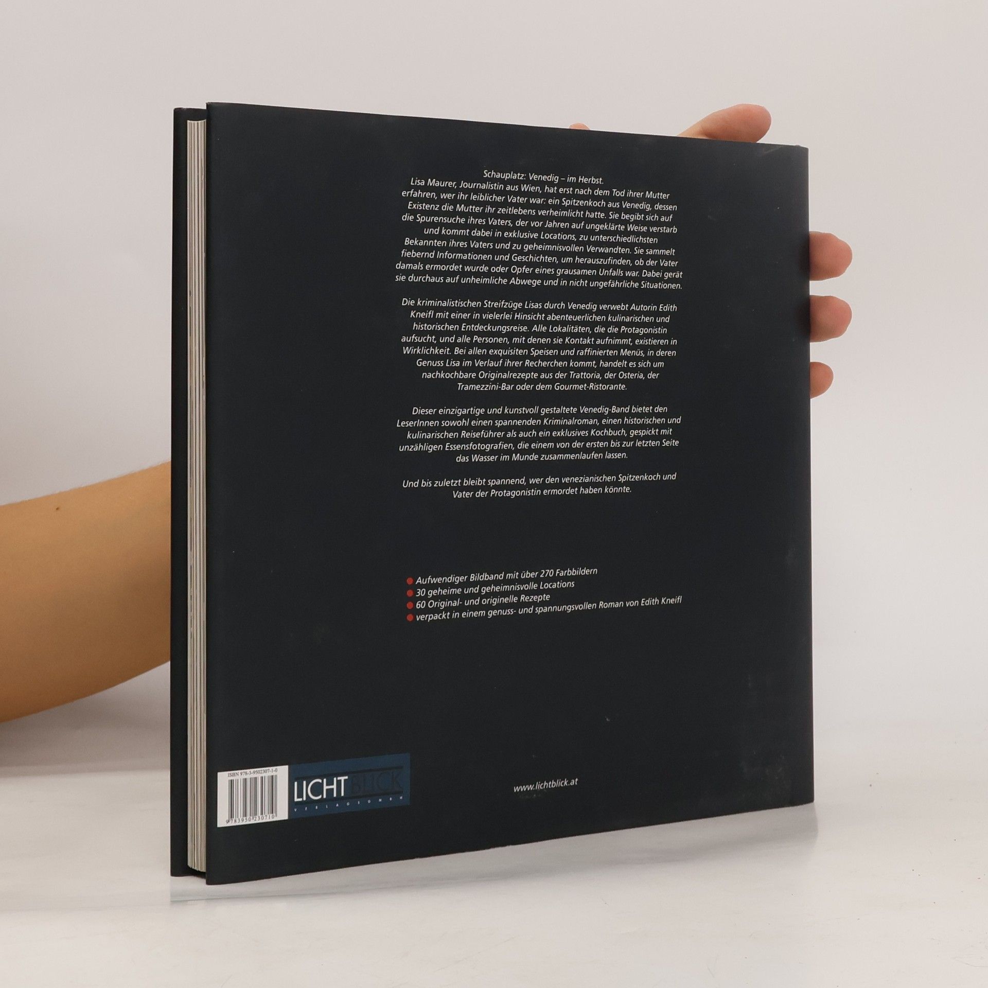 Bücher über, aus, von und mit Venedig – seien es Kochbücher, Reise- oder Kunstführer, Liebes- oder Kriminalromane – gibt es Tausende. Edith Kneifl bringt deshalb im LICHTBLICK VERLAG ein „etwas“ anderes, noch nie dagewesenes Buch über, aus, von und mit Venedig heraus. GEHEIMES VENEDIG bedeutet: 30 geheime und geheimnissvolle Locations 60 original und originelle Rezepte 1 genuss- und spannungsvoller Roman GEHEIMES VENEDIG bedeutet: Faszination und Exklusivität Tradition und Raffinesse Realität und Surrealität Der Roman Schauplatz: Venedig. Im Herbst. Lisa Maurer, Journalistin aus Wien, hat erst nach dem Tod ihrer Mutter erfahren, wer ihr leiblicher Vater war: ein Spitzenkoch aus Venedig, dessen Existenz die Mutter ihr zeitlebens verheimlicht hatte. Sie begibt sich auf Spurensuche nach ihrem Vater, der vor Jahren auf ungeklärte Weise verstarb und kommt dabei in exklusive Locations, zu unterschiedlichsten Bekannten ihres Vaters und zu geheimnisvollen Verwandten. Sie sammelt fiebernd Informationen und Geschichten, um herauszufinden, ob der Vater damals ermordet wurde oder Opfer eines grausamen Unfalls war. Dabei gerät sie durchaus auf unheimliche Abwege und in nicht ungefährliche Situationen. Die kriminalistischen Streifzüge Lisas durch Venedig verwebt Autorin Edith Kneifl mit einer in vielerlei Hinsicht abenteuerlichen kulinarischen und historischen Entdeckungsreise. Alle Lokalitäten, die die Protagonistin aufsucht, und alle Personen, mit denen sie Kontakt aufnimmt, existieren in Wirklichkeit. Bei allen exquisiten Speisen und raffinierten Menüs, in deren Genuss Lisa im Verlauf ihrer Recherchen kommt, handelt es sich um nachkochbare Originalrezepte aus der Trattoria, der Osteria, der Tramezzini-Bar oder dem Gourmet-Ristorante. Dieser einzigartige und kunstvoll gestaltete Venedig-Band bietet den LeserInnen sowohl einen spannenden Kriminalroman, einen historischen und kulinarischen Reiseführer als auch ein exklusives Kochbuch, gespickt mit unzähligen Essensfotografien, die einem von der ersten bis zur letzten Seite das Wasser im Munde zusammenlaufen lassen. Und bis zuletzt bleibt spannend, wer den venezianischen Spitzenkoch und Vater der Protagonistin ermordet haben könnte. Die Locations „Geheimes Venedig“ bietet Ihnen eine bunte Mischung an Lokalitäten - für den Individualtouristen eine Tramezzini-Bar, eine Osterria oder die Pralinenmanufactur genauso wie für den „gehobenen“ Reisetouristen das Gourmet-Lokal, einen Palazzo oder das Designer-Hotel. Die Rezepte Bei den Rezepten handelt es sich um Original-Rezepte aus der Trattoria, der Osteria, der Tramezzini-Bar oder dem Gourmet-Ristorante: von „Risotto all´amatriciana di scampi“ über „ Millefoglie di scampi in saor con mela verde“ bis hin zu „Tarta altino di fichi“ Rezepte, die es bis jetzt noch in keinem Buch gegeben hat, Rezepte, die original vor allem aber raffiniert sind und Rezepte, die zuhause einfach nachvollzieh- und kochbar sind.