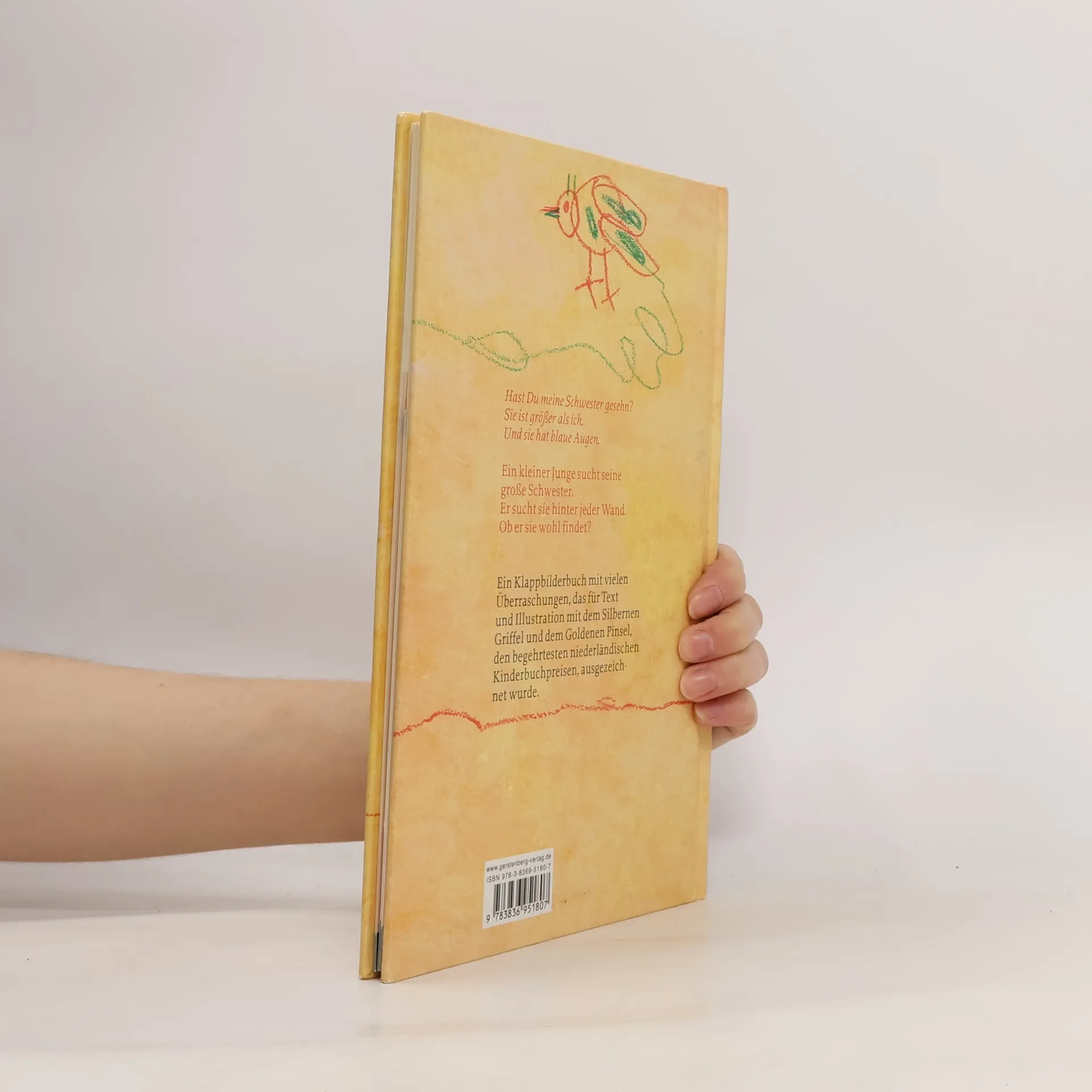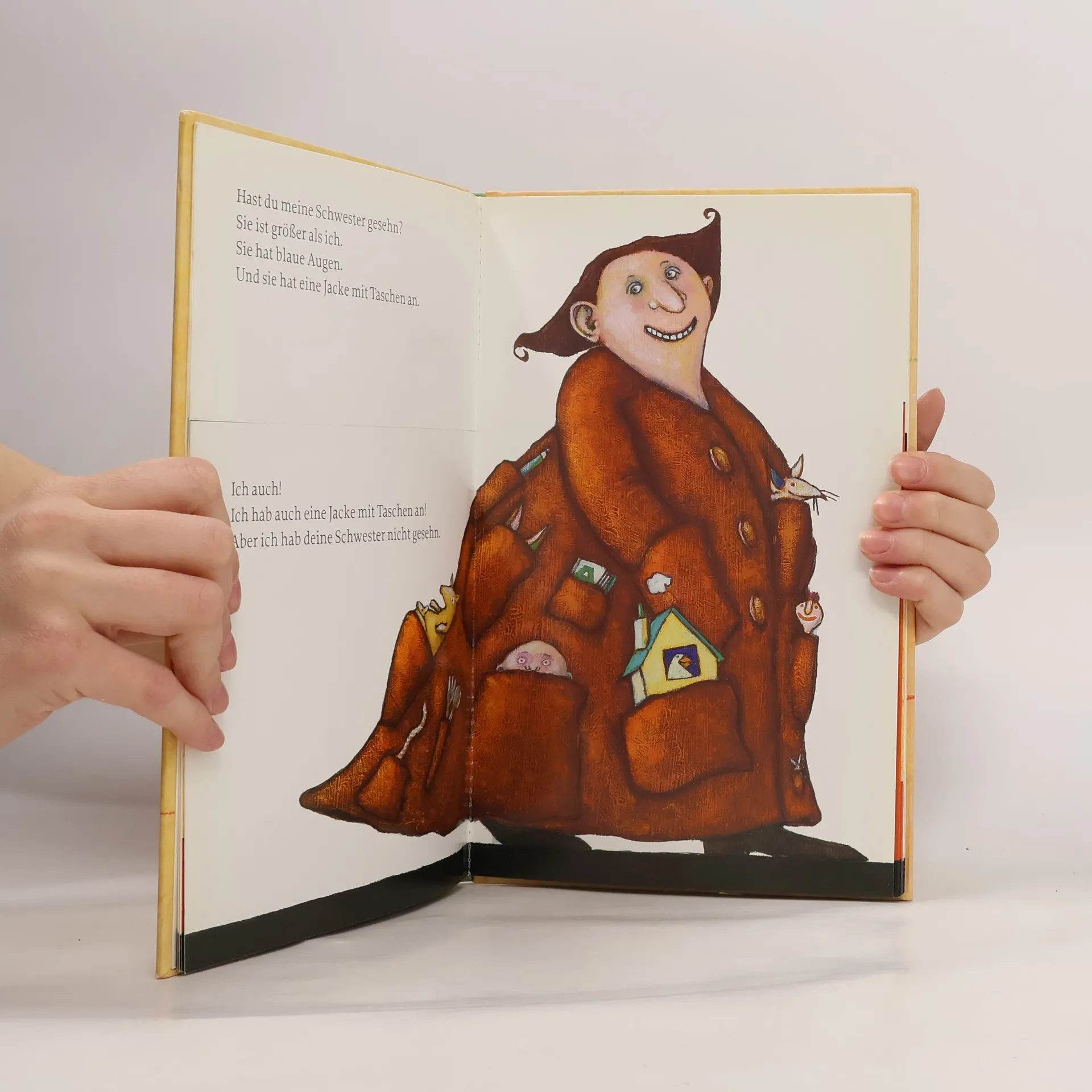 »Hast du meine Schwester gesehn? Sie ist größer als ich. Und sie hat blaue Augen.« Ein kleiner Junge sucht seine große Schwester. Er weiß genau, wie sie aussieht und was sie anhat. Er nimmt uns mit auf seine Suche und fragt jeden, der ihm begegnet. Aber halt! Ist das wirklich ein Hund hinter dieser Mauer dort? Oder etwa ein grüner Drache? Hinter jeder Seite dieses Buches verbirgt sich etwas ganz anderes, als wir zunächst zu sehen glauben. Schließlich findet der kleine Junge seine Schwester, aber nur mit der Hilfe des Betrachters! Ein Klappbilderbuch voller Überraschungen, mit farbenfrohen, expressiven Bildern von Joke van Leeuwen, das einlädt zum Raten und Suchen.