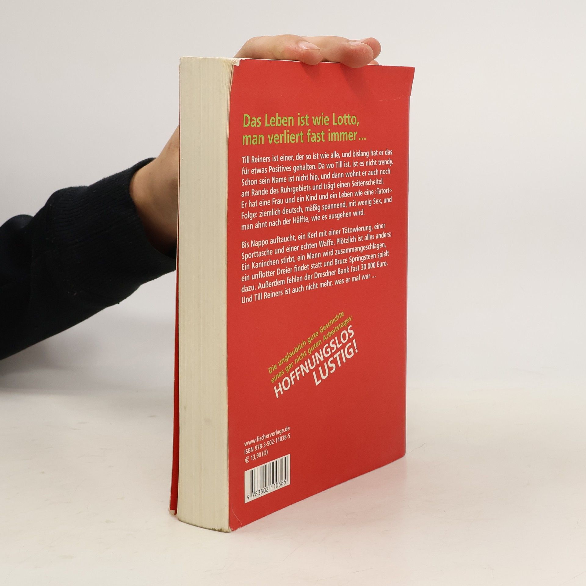 Das Leben ist wie Lotto, man verliert fast immer. Till Reiners ist einer, der so ist wie alle, und bislang hat er das für etwas Positives gehalten. Da wo Till ist, ist es nicht trendy. Schon sein Name ist nicht hip, und dann wohnt er auch noch am Rande des Ruhrgebiets und trägt einen Seitenscheitel. Er hat eine Frau und ein Kind und ein Leben wie eine Tatort-Folge: ziemlich deutsch, mäßig spannend, mit wenig Sex, und man ahnt nach der Hälfte, wie es ausgehen wird. Bis Nappo auftaucht, ein Kerl mit einer Tätowierung, einer Sporttasche und einer echten Waffe. Plötzlich ist alles anders: Ein Kaninchen stirbt, ein Mann wird zusammengeschlagen, ein unflotter Dreier findet statt und Bruce Springsteen spielt dazu. Außerdem fehlen der Dresdner Bank knappe 30 000 Euro. Und Till Reiners ist auch nicht mehr, was er mal war …