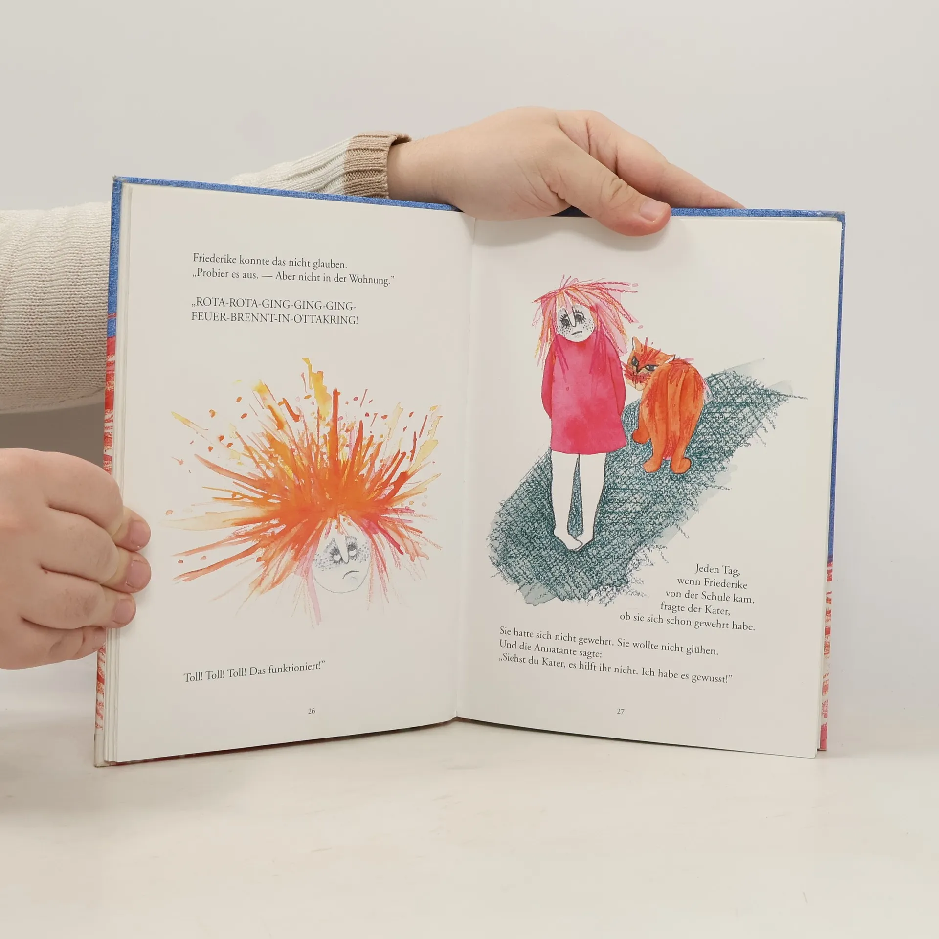 Die Annatante und die Katze Kater halten Friederike für ein ganz normales Mädchen. Aber alle anderen Leute lachen, wenn sie Friederike sehen. Besonders die Kinder! Die rufen: "Da kommt die feuerrote Friederike! Auf der ihrem Kopf brennt's!" Und das alles nur, weil Friederike rote Haare hat! Aber da es keine gewöhnlichen Haare sind, ereignen sich ungewöhnliche Dinge. Christine Nöstlingers erstes Buch ist heute bereits ein Kinderbuchklassiker. Barbara Waldschützs außergewöhnliche Illustrationen unterstreichen die Botschaft der Geschichte.