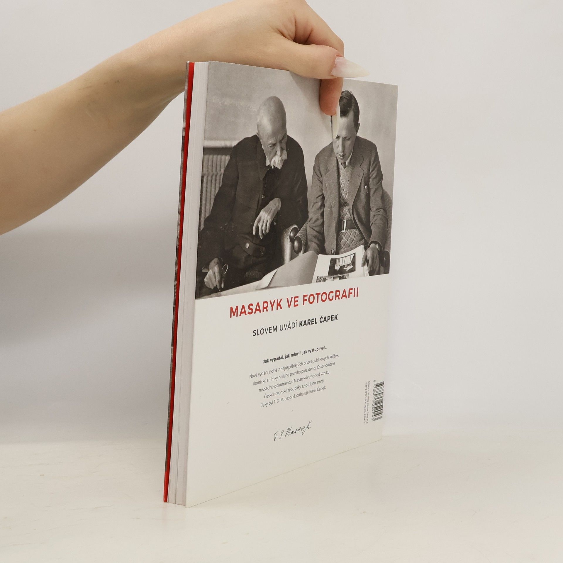 Jak vypadal, jak mluvil, jak vystupoval.... Nové vydání jedné z nejúspěšnějších prvorepublikových knížek. Ikonické snímky našeho prvního prezidenta Osvoboditele, které nevšedně dokumentují Masarykův život do vzniku Československé republiky až do jeho smrti. Jaký byl T. G. M. osobně, odhaluje Karel Čapek. Snímky ze života T. G. M. pořídil spisovatel Karel Čapek, fotograf Karel Plicka, osobní archivář prezidenta Vasil Škrach, oficiální hradní fotograf Jano Šrámek, prezidentův tajemník Jaroslav Císař, profesionální fotoateliéry jako Tomáš Vojta či architekt Jindřich Vaněk i neznámi fotografové pracující pro agentury Centropress, ČTK, Legie, Tatra Trenčín nebo Ministerstvo národní obrany.