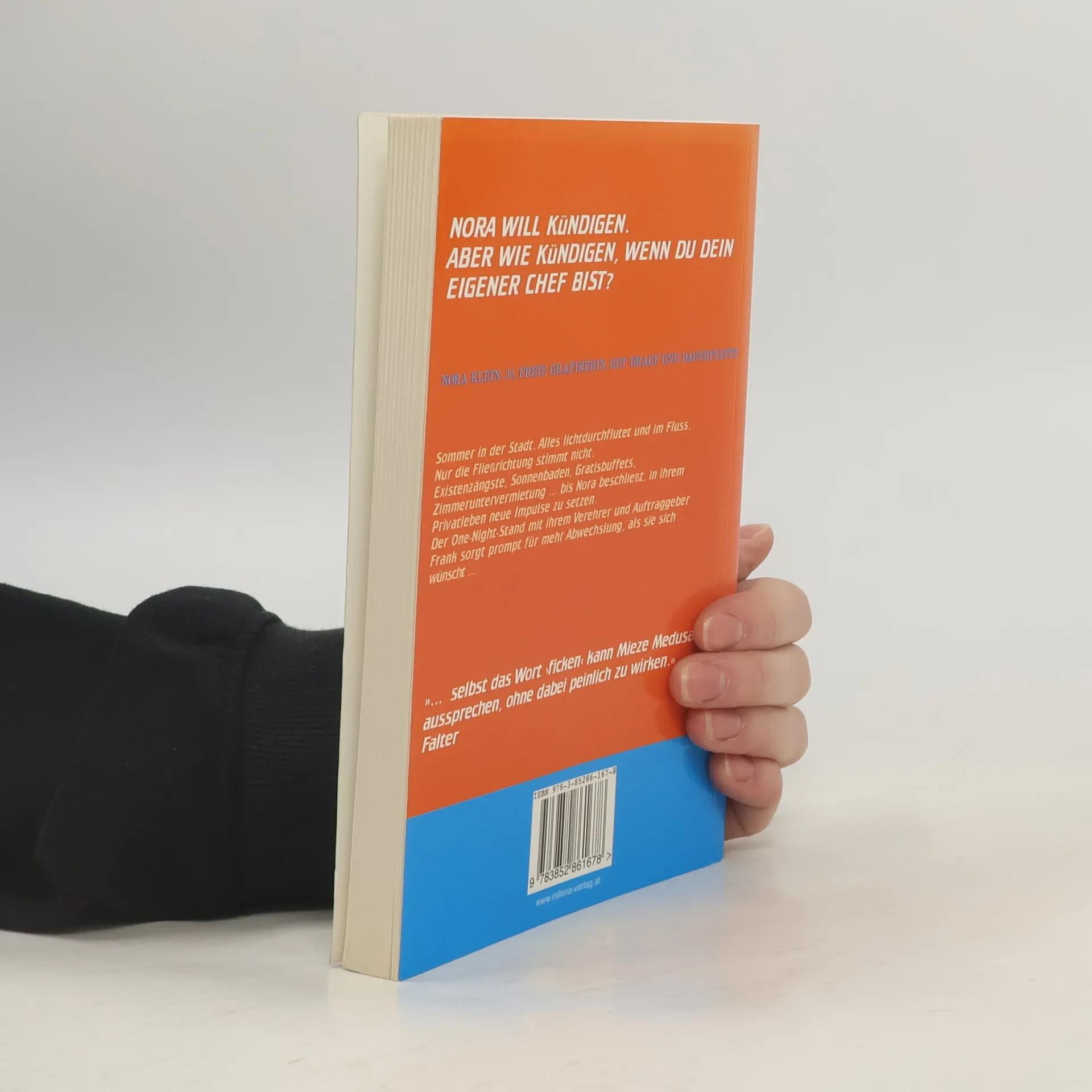 Nora will kündigen. Aber wie kündigen, wenn du dein eigener Chef bist? Ein Roman voll flirrender Eloquenz und spritzigem Humor für alle, die noch nicht so ganz erwachsen sind, es lange Zeit nicht waren oder niemals werden wollen! Der Debütroman von Wiens Poetryslam-Queen und HipHop-Lyrikerin Mieze Medusa, der garantiert Ihren Alltag versüßt. Sommer in der Stadt. Alles lichtdurchflutet und im Fluss. Nur die Fließrichtung stimmt nicht. Da das Schwimmen gegen den Strom nicht klappt, übt sich Nora Klein im Kopf über dem Wasser halten. Dieses ist leider im Steigen begriffen: Rechnungen und Steuerzahlungsnachforderungen trudeln ein, Aufträge für die junge, selbständige Grafikerin sind aber Mangelware. Raubzüge öffentlicher Büffets und Plündern von Werbeständen mit gratis Joghurtdrinks garantieren das Leben im Alltag trotz Dauerflaute im Portemonnaie. Die Existenzangst wird mit Sonnenbaden, zurückgeschraubten Ansprüchen und Zimmeruntervermietung bekämpft, bis Nora beschließt, dass auch ihr Privatleben neue Impulse benötigt. Der One-Night-Stand mit ihrem Verehrer und Auftraggeber Frank sorgt prompt für mehr Abwechslung als sie sich wünscht. Mit viel Witz und sprühendem Charme lässt Wiens Poetryslam-Queen und HipHop-Lyrikerin Mieze Medusa Noras ständig quengelndes, scharfzüngiges Karma das Leben der heutzutage so häufigen „ewigen Adoleszenz“ kommentieren.