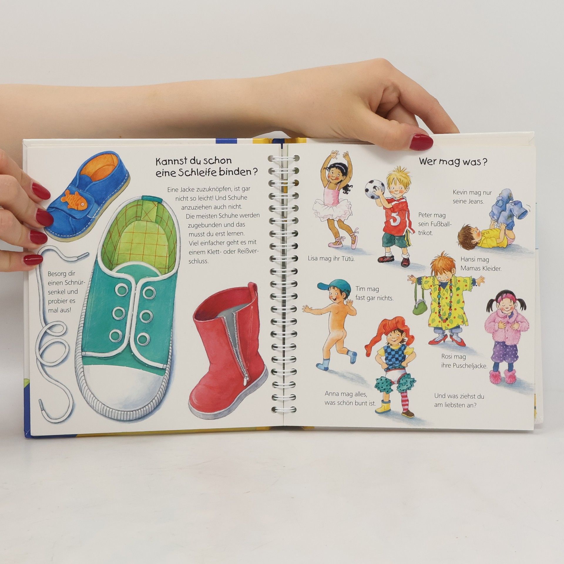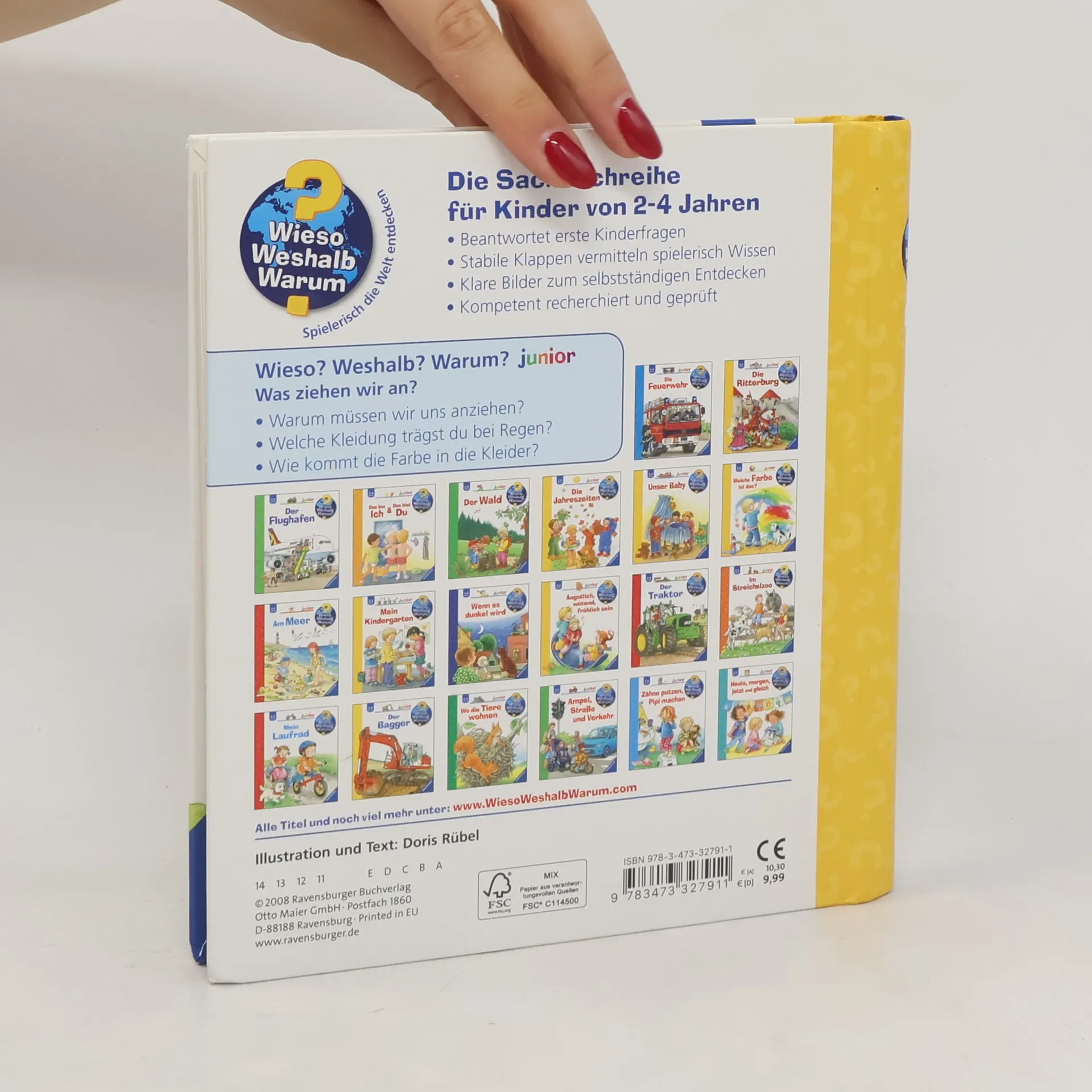Sich allein anzuziehen ist gar nicht so einfach: zuerst die Hose und dann die Unterhose oder andersrum? Welche Kleider brauchen wir bei Regen, Sonne oder Schnee? Woraus werden Kleidungsstücke gemacht? Solche und viele weitere Kinderfragen über das Anziehen und Kleidung beantwortet dieses Buch. Mit Klappen flicken Kinder ein Loch, sie schauen in die Waschmaschine und entdecken Berufskleidung für verschiedene Einsätze.Wieso? Weshalb? Warum? junior Die Sachbuchreihe für Kinder von 2–4 Jahren Jeden Tag entdecken Kinder etwas Neues – und haben viele Fragen. Wann kommt die Feuerwehr? Was machen die Tiere im Winter? Warum muss ich Zähne putzen? Die beliebte Sachbuchreihe Wieso? Weshalb? Warum? junior beantwortet die Fragen der Kinder auf Augenhöhe. Sie beleuchtet unterschiedlichste Themen aus ihrer Alltags- und Interessenswelt altersgerecht und mit viel Liebe zum Detail. Die Reihe ist speziell auf kleine Hände und die Bedürfnisse der Kleinsten angepasst. Klare und liebevolle Bilder, kurze Sachtexte sowie handliche Klappen, die Bewegungen veranschaulichen und überraschende und lustige Einblicke gewähren, ermöglichen Kindern, sich ihre Themen selbst zu erschließen. Der Spaß am eigenhändigen Entdecken, die liebevolle Umsetzung und die hochwertige Ausstattung garantieren langanhaltende Freude an jedem Buch.
