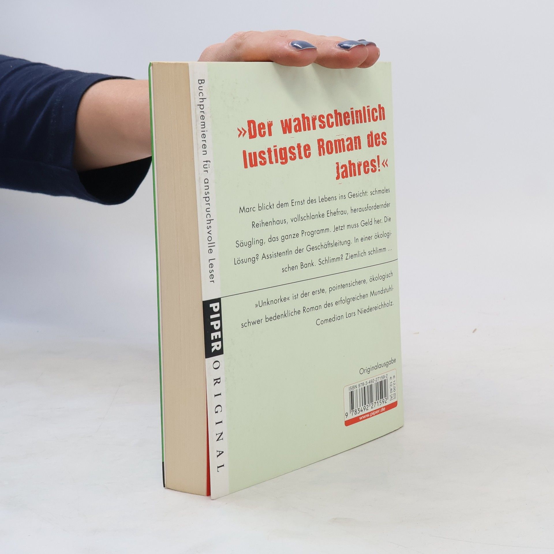 'Das hört sich doch ganz knorke an.' – Arnulf und Almut von der Ökokreditbank suchen eine ›AssistentIn der Geschäftsleitung‹ und sind ganz entzückt von Marc. Nach 16 Semestern blickt der dem Ernst des Lebens ins Gesicht: Reihenhaus-schicksal, Frau schwanger. Jetzt muss Geld her. Deshalb beißt Marc die Zähne zusammen und sagt beim Vorstellungsgespräch den einzigen Satz, den die bescheuerten Ökos von ihm hören wollen: 'Ja, ich möchte die Welt ein kleines Stückchen besser machen.' Dass es eine Welt aus liebestollen Bongolehrern, heimatlosen Robben und indianischen Hochzeitszeremonien sein wird, ist ihm zu dem Zeitpunkt nicht bewusst. – 'Unknorke' ist der haarsträubende und pointensichere, haarscharf neben unserem eigenen Alltag liegende erste Roman des Comedian Lars Niedereichholz.