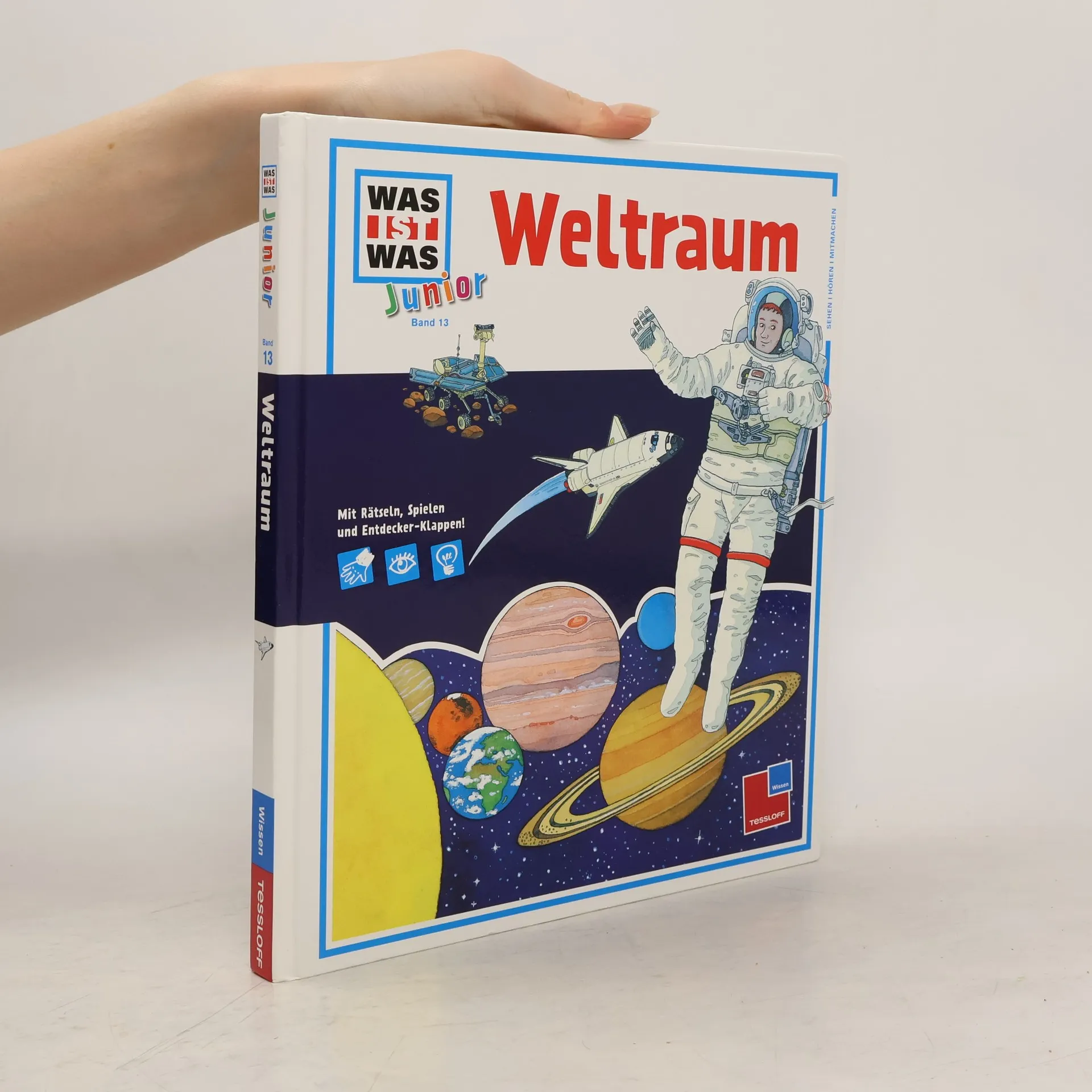 Lukas und Anna besuchen mit ihrem Vater das Planetarium. Er ist Astronaut! und will ins Weltall zur Internationalen Raumstation fliegen. Deshalb interessiert Lukas und Anna brennend, wie es im All aussieht. Auf der Kuppelleinwand im Planetarium können sie Planeten und Sterne aus der Nähe betrachten und sie erleben die Erde aus kosmischer Sicht. Wie entstand das Universum? Warum ist die Erde einzigartig? Gibt es Marsmännchen? Der Junior-Band wendet sich an kleine Entdecker ab 4 Jahren. Er ist farbenfroh illustriert, steckt voller Entdecker-Klappen, kleiner Rätsel und Spiele und eignet sich bestens zum Vorlesen oder für Erstleser.