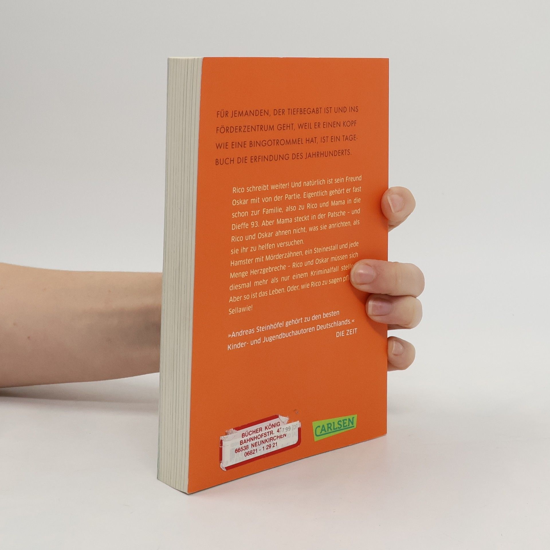 Rico schreibt weiter! Und natürlich ist sein Freund Oskar mit von der Partie. Eigentlich gehört er fast schon zur Familie, also zu Rico und Mama in die Dieffe 93. Aber Mama steckt in der Patsche – und Rico und Oskar ahnen nicht, was sie anrichten, als sie ihr zu helfen versuchen. Hamster mit Mörderzähnen, ein Steinestall und jede Menge Herzgebreche – Rico und Oskar müssen sich diesmal mehr als nur einem Krimifall stellen. Aber so ist das Leben. Oder, wie Rico zu sagen pflegt: Sellawie! Alle Bücher über Rico und Oskar: Rico, Oskar und die Tieferschatten (Band 1)Rico, Oskar und das Herzgebreche (Band 2)Rico, Oskar und der Diebstahlstein (Band 3)Rico, Oskar und das Vomhimmelhoch (Band 4) Kindercomics:Rico & Oskar – Fische aus Silber Rico & Oskar – Die RegenhütteRico & Oskar – Die perfekte ArschbombeRico & Oskar – Die Sache mit den Öhrchen