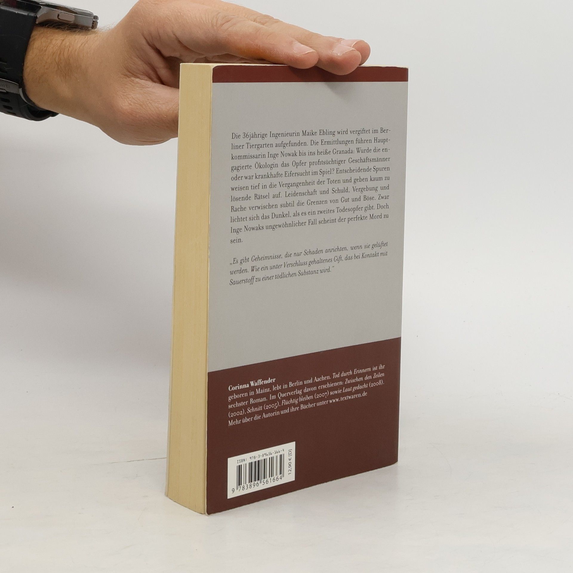 Die 36-jährige Maike Ebling wird vergiftet im Berliner Tiergarten aufgefunden. Die Ermittlungen von Hauptkommissarin Inge Nowak führen nach Granada: Wurde die Ökologin zur Bedrohung für einen profitsüchtigen Solarzellenhersteller in der Sierra Nevada, ist der Täter unter ihren ehemaligen Studenten zu suchen oder hatte ihre andalusische Geliebte ein Motiv, sie umzubringen? Was hatte Maike Ebling zu verbergen und mit wem traf sie sich kurz vor ihrem Tod? Inge Nowaks erster Fall konfrontiert sie nicht nur mit der erschütternden Vergangenheit des Opfers, sondern verändert auch ihr eigenes Leben: Auf den Spuren der Toten verliebt sich die Kommissarin Hals über Kopf. Corinna Waffender erzählt in ihrem ersten Kriminalroman von Schuld und Vergebung, von Verantwortung und Kontrollverlust, von Rache und Leidenschaft. Gewohnt stilsicher verbindet die Autorin dabei spannende Unterhaltung mit anspruchsvoller Literatur.